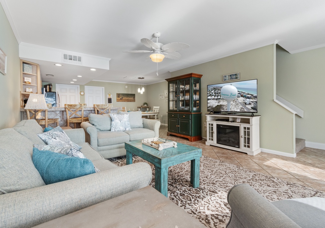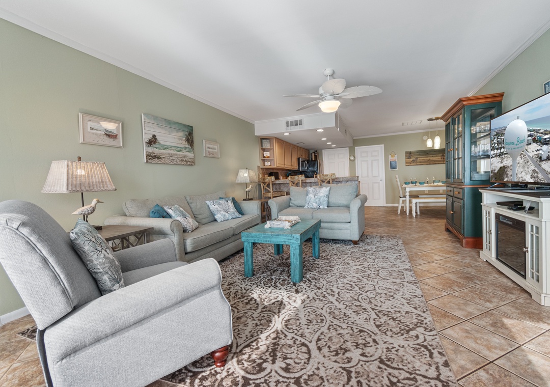 Unwind in the great room which features all new comfortable living room furniture and a 55" LCD Hi Def TV with built in DVD/VCR.