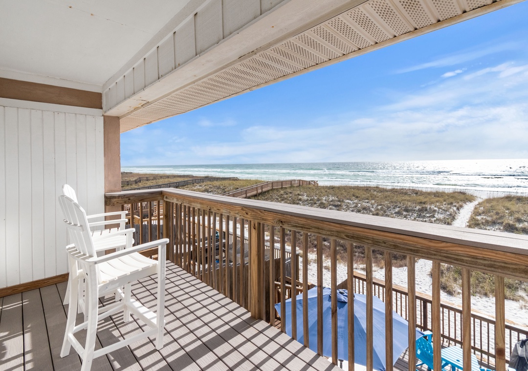 Another wall of windows and doors lead directly out to a private balcony that affords beautiful Gulf views. Have your first cup of coffee here or gaze at the moon over a nightcap before retiring at the end of the day.