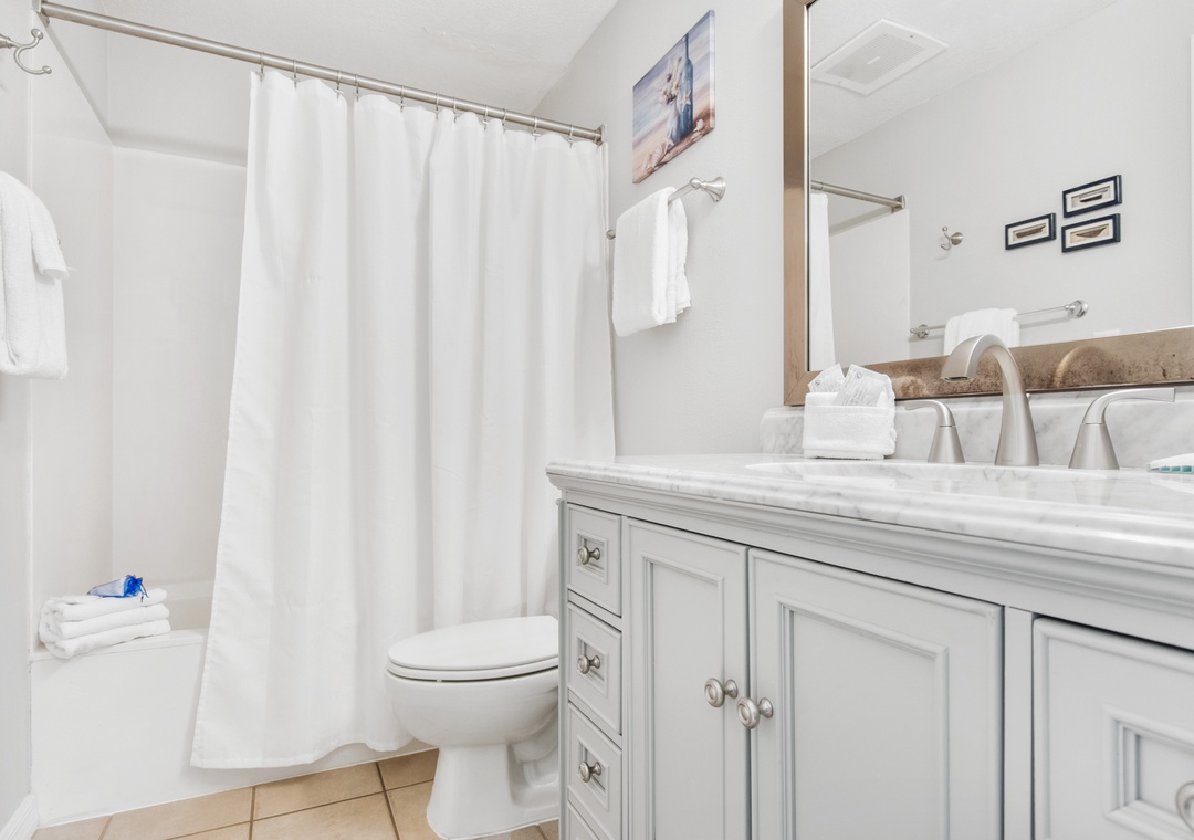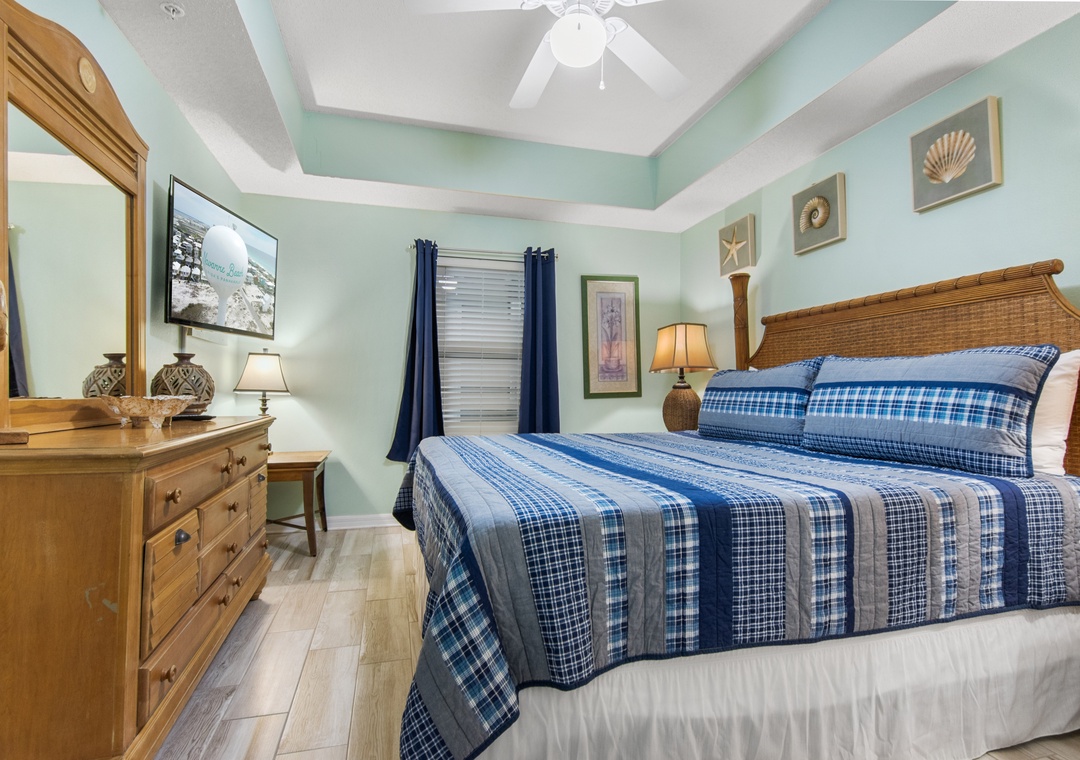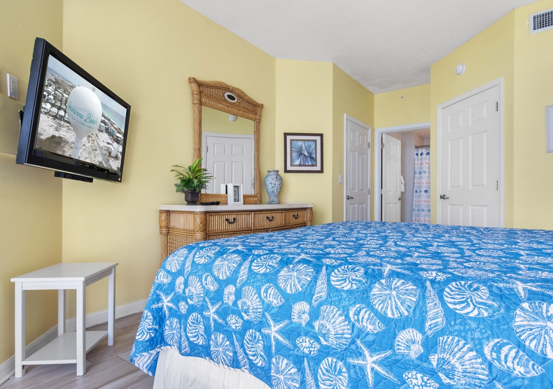 The second bedroom is king-sized, has a flat screen TV and an adjoining bathroom with tub/shower combo.