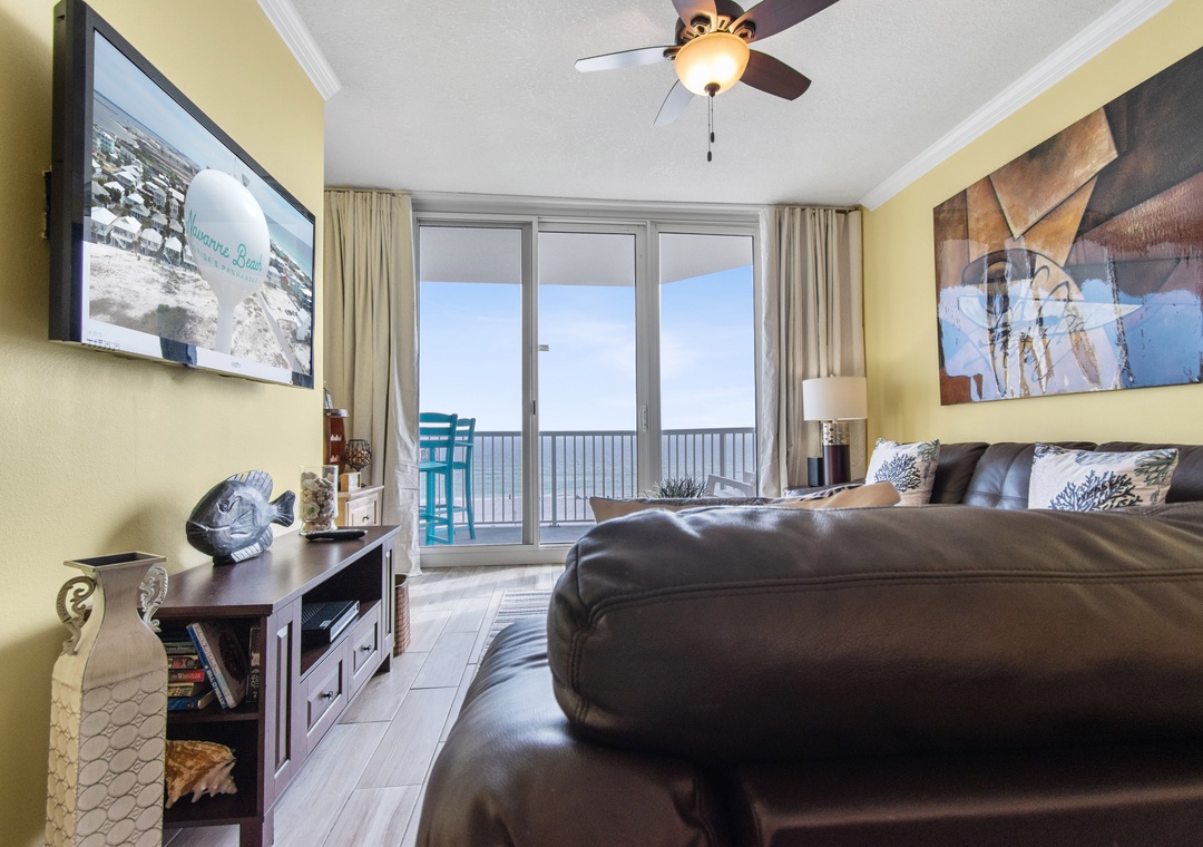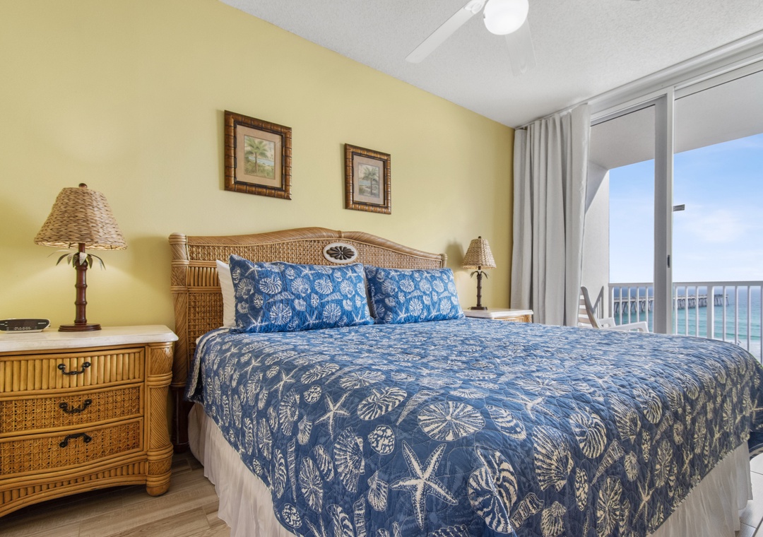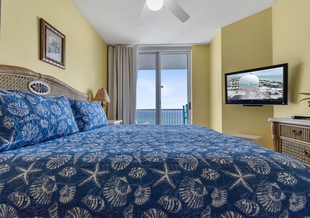 The king-sized primary bedroom has a flat screen TV, and an en suite bathroom with tub/shower combo. Wake up to seeing dolphins playing in the surf from your gulf front balcony.