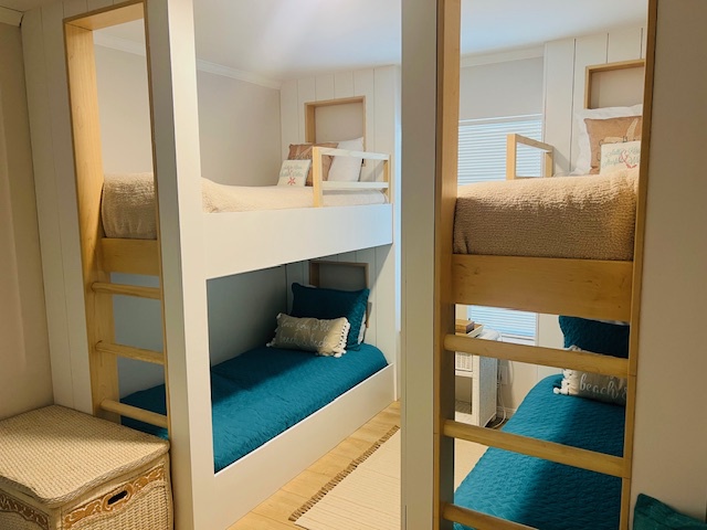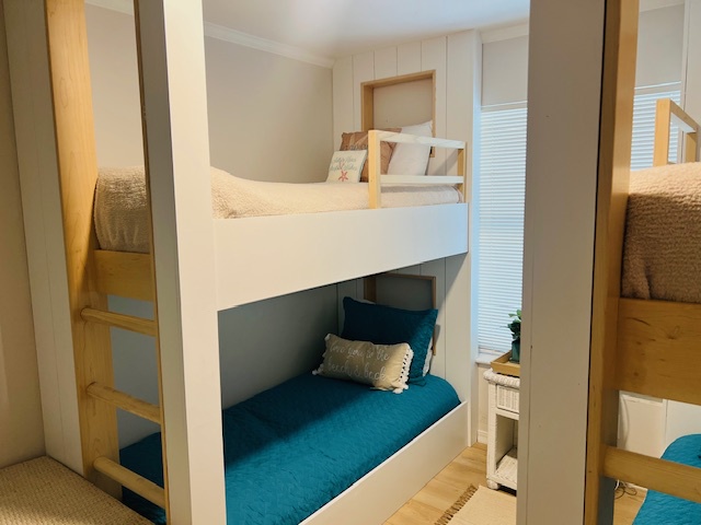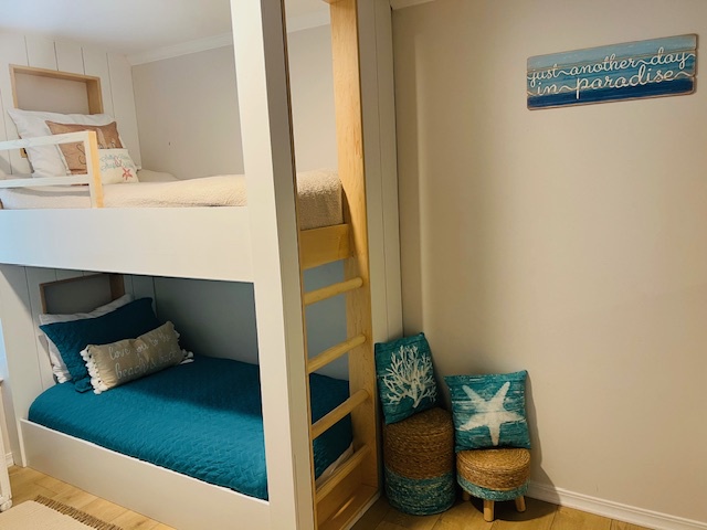 Three king-sized bedrooms (one with brand new en suite bath featuring a beautiful walk-in shower and double sinks) and a bathroom are on one side of the house, and another king-sized bedroom and a double bunk bedroom with 1 bathroom are on the opposite end.