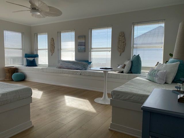Up the spiral staircase is a bonus loft area with built in couches for lounging. 2 walls of windows and a private deck with forever views of the gulf....a perfect spot to get-away from it all, read a book, watch TV, play a game or use as a kids hang-out. You can even use this room for overflow sleeping for a couple of "little ones".