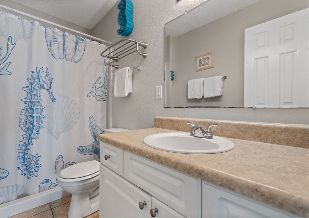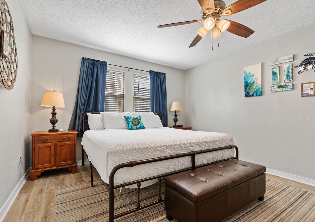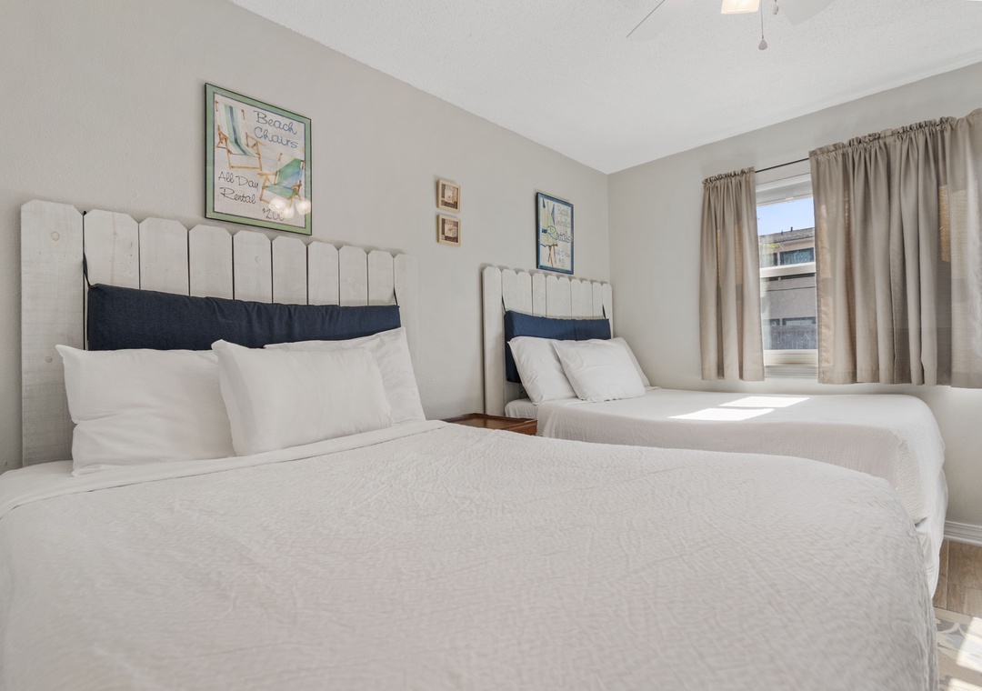 The primary bedroom is king-sized with an en suite bath. Across the hall is the second bedroom with 2 full-sized beds and a full bath. There is also a sofa sleeper in the living room for additional sleeping.