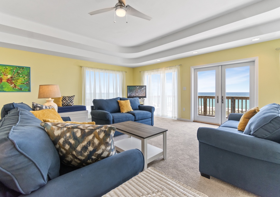 You will be in relaxation mode the minute you enter, with the beautiful unobstructed Gulf views just outside your wall of windows and private deck. This open concept floor plan allows your entire group to cook, dine, play games, relax or just gaze at the seagulls soaring by with the emerald green waters as your back drop. There is a large flat screen TV here,