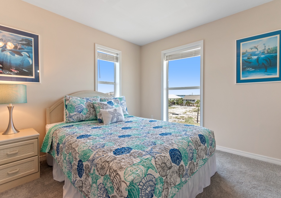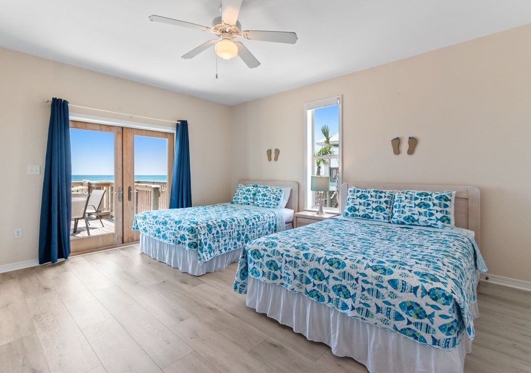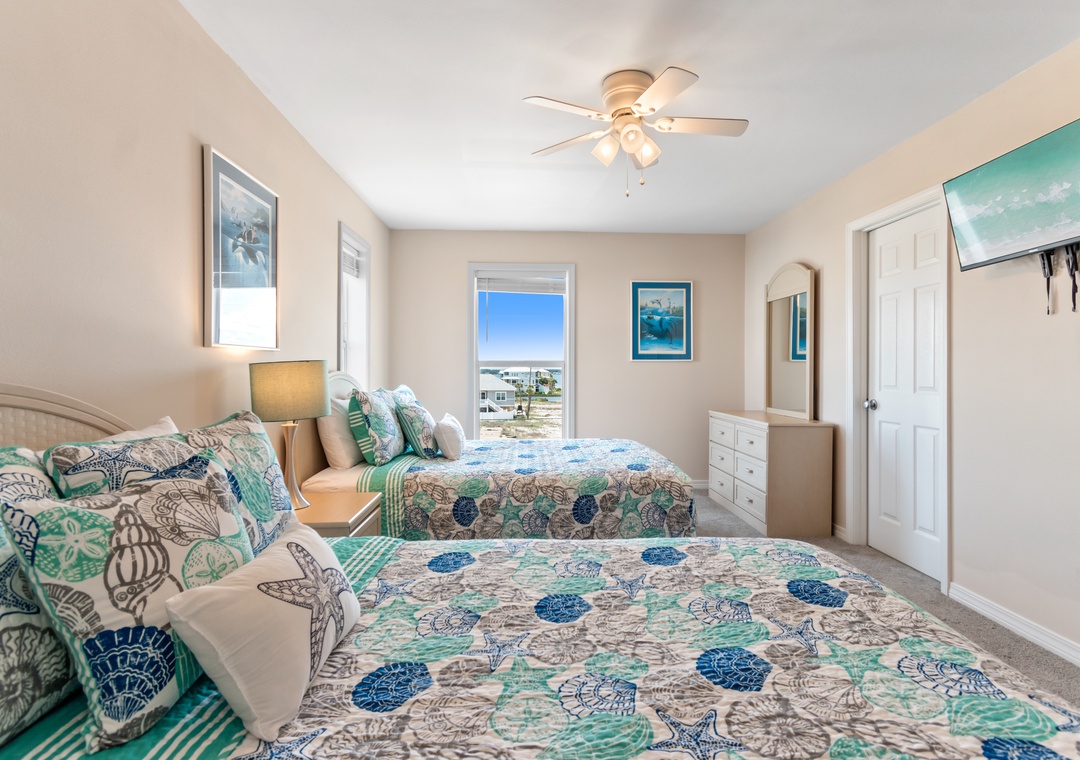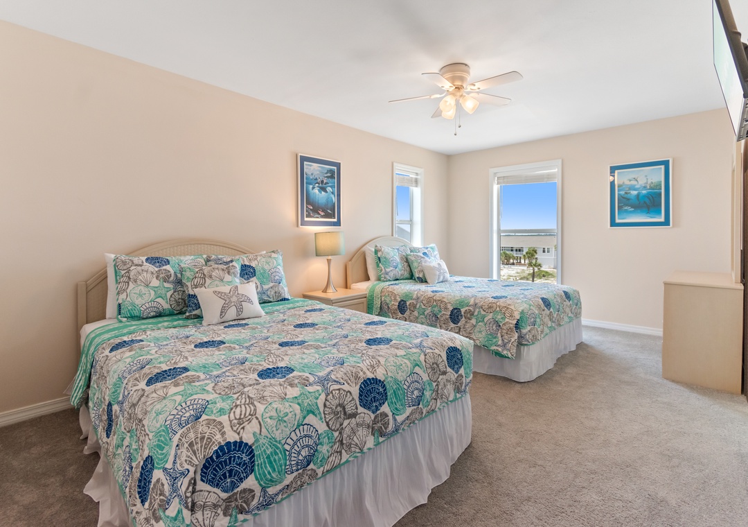 This main floor also boasts a king-sized primary bedroom with en suite bath and Gulf view. Down the hall is another bedroom with 2 queen beds and a full bath across the hall. On the opposite side of the house are 2 more bedrooms, each with 2 queen beds and another full bath between.