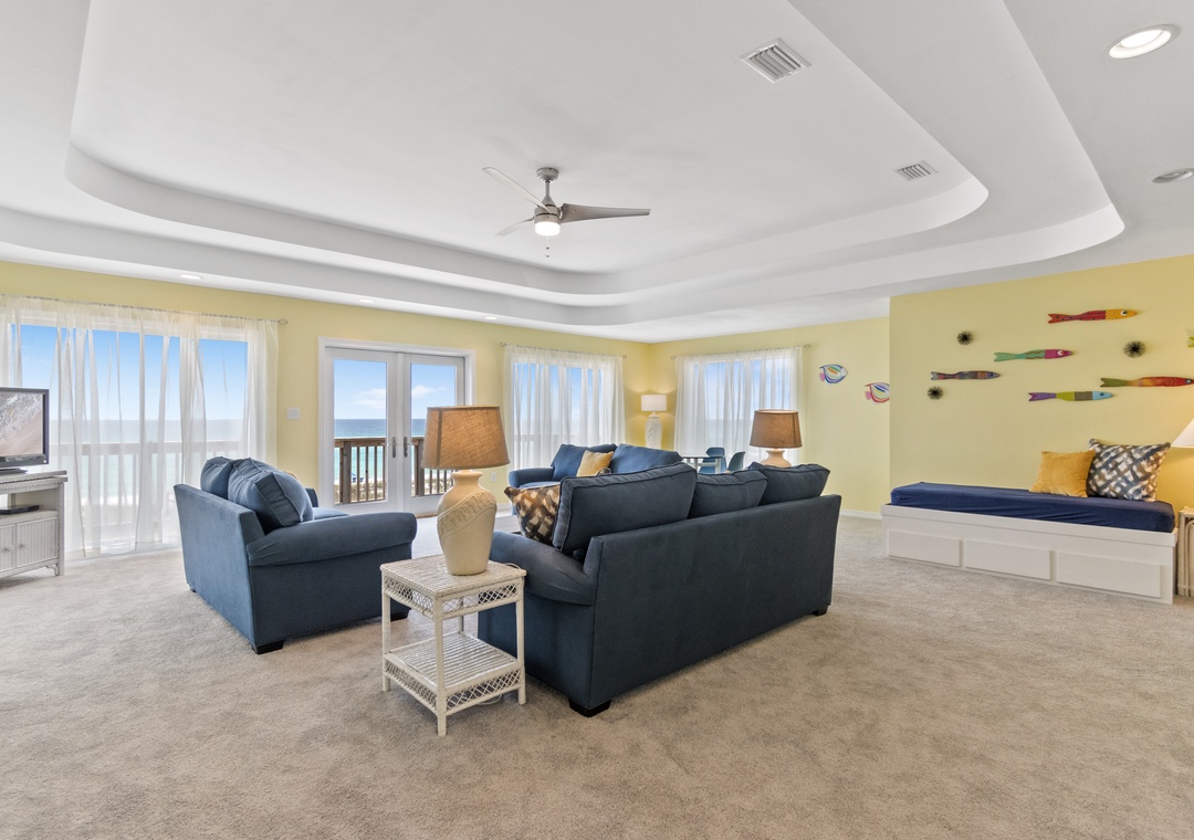 Up one flight you'll find another super "hang out" room with gorgeous Gulf views and muliple couches to "chill " and further relax. A table for 4 is perfect for a game of cards. There is a large flat screen TV as well as a full bath here.