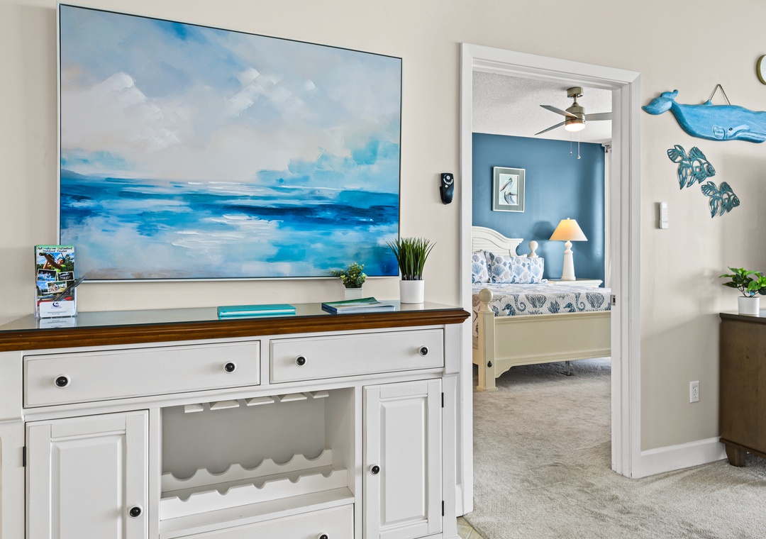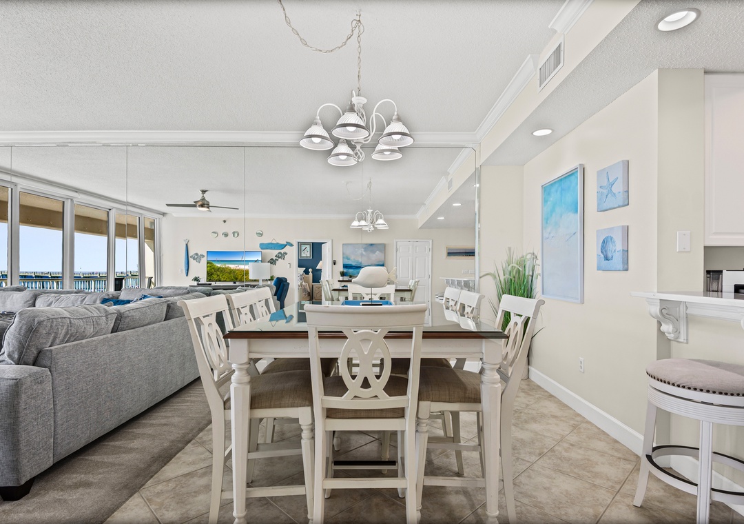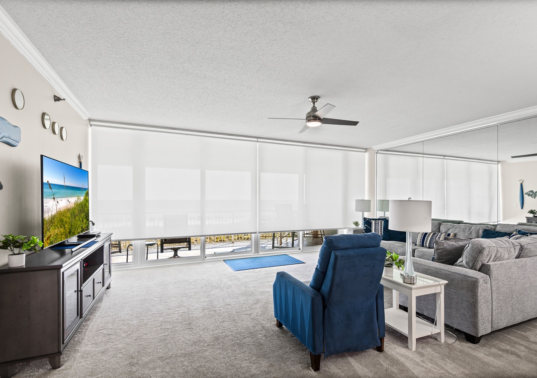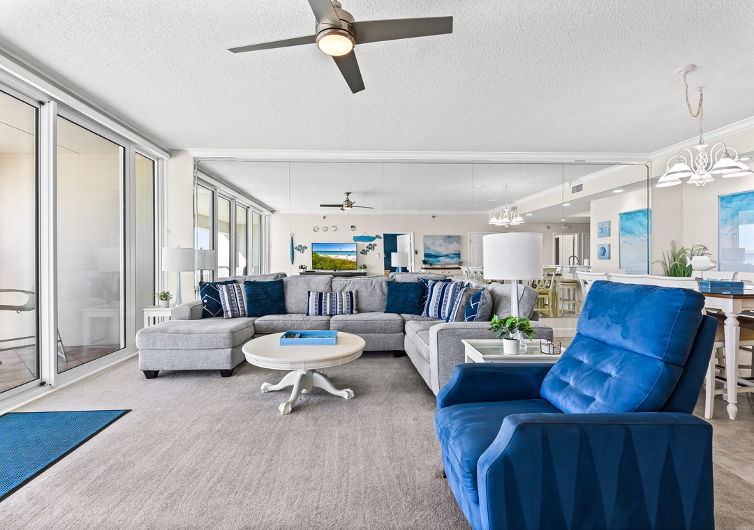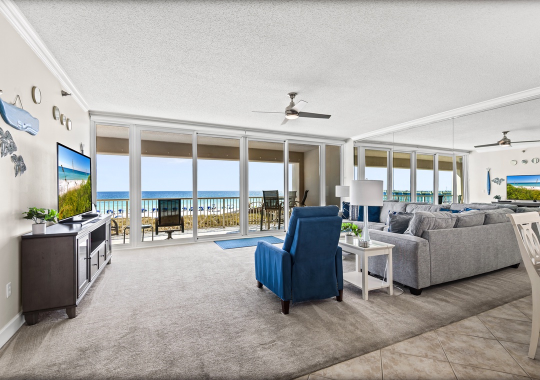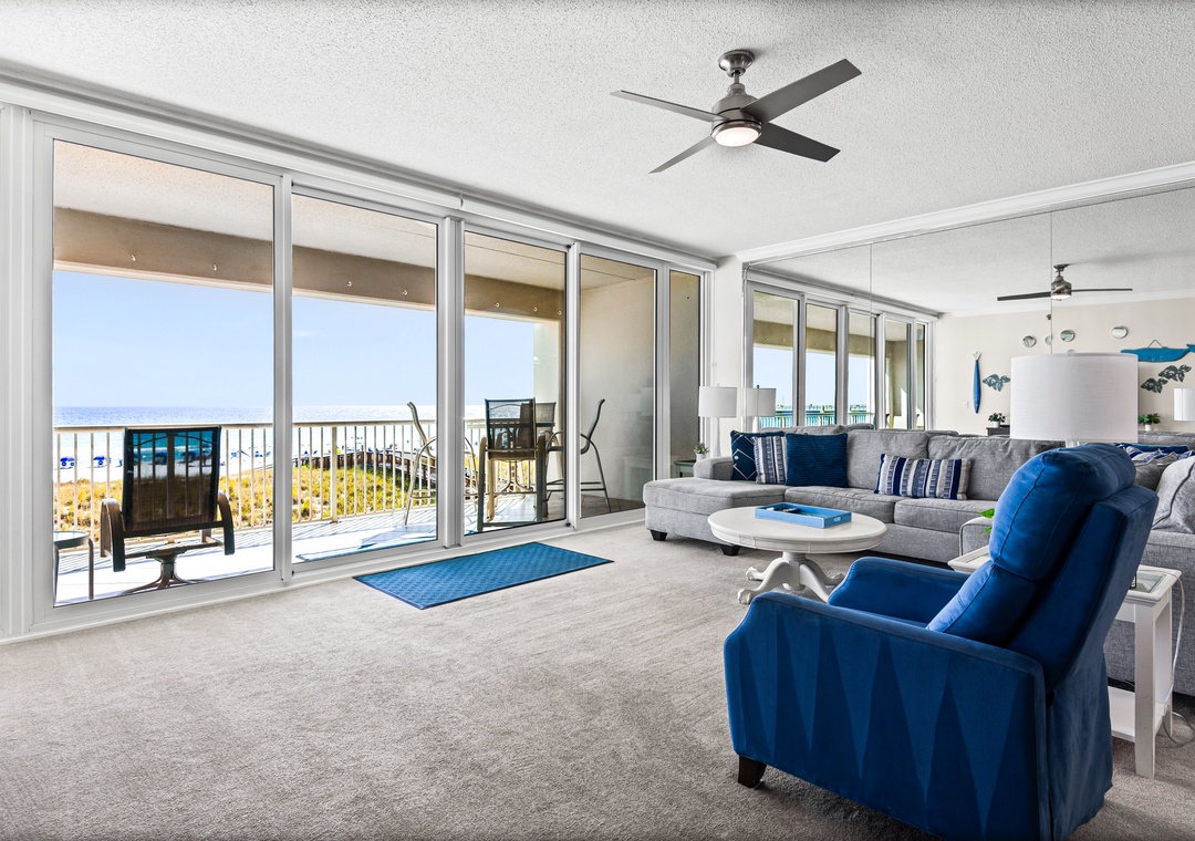 Upon entering, you will be immediately transported into relaxation mode. Floor to ceiling glass sliders offer amazing beach views and of the emerald green Gulf waters beyond.