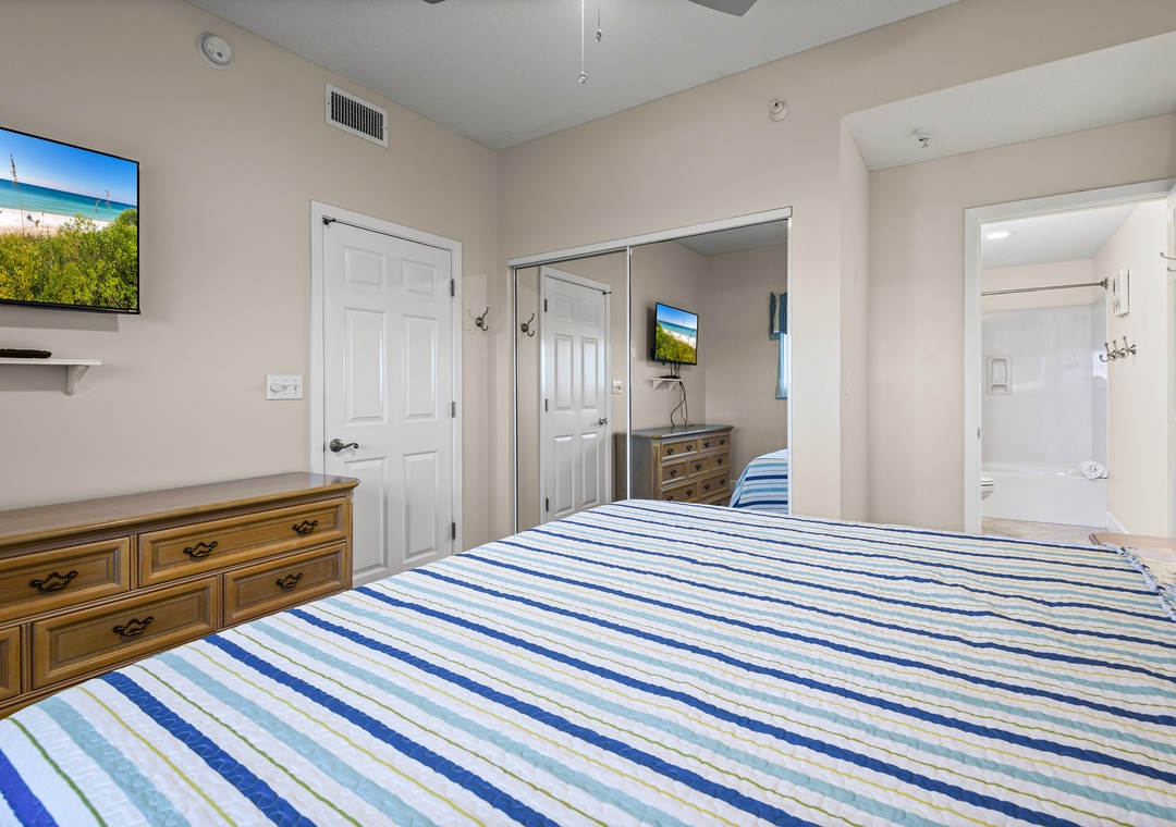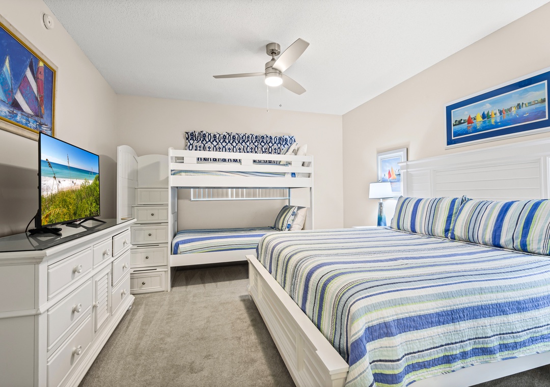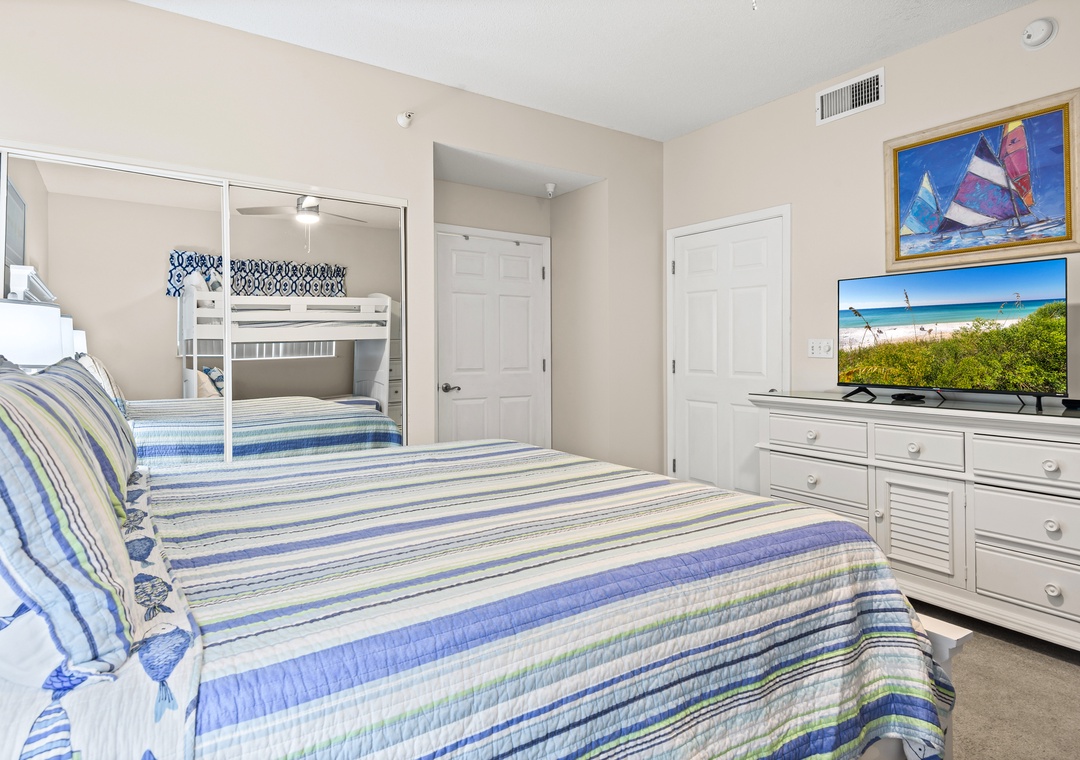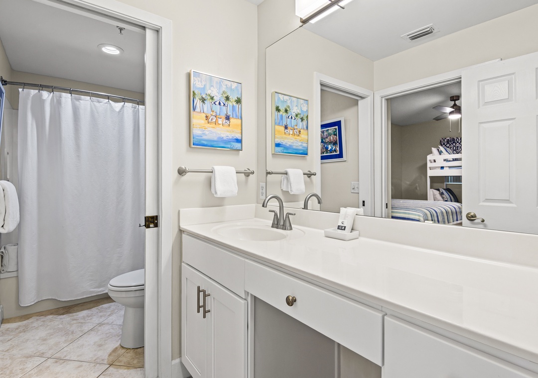 On the other side of the condo is the second king sized bedroom with another en suite bath featuring a tub/shower combo. Across the hall is the third bedroom with a king-sized bed and a set of twin bunk beds, comfortably sleeping 4. The third full bath also has a tub/shower combo and is accessible from this bedroom as well as from the hallway. A pack 'n play is also offered.