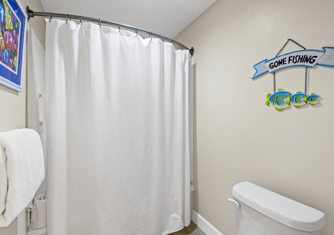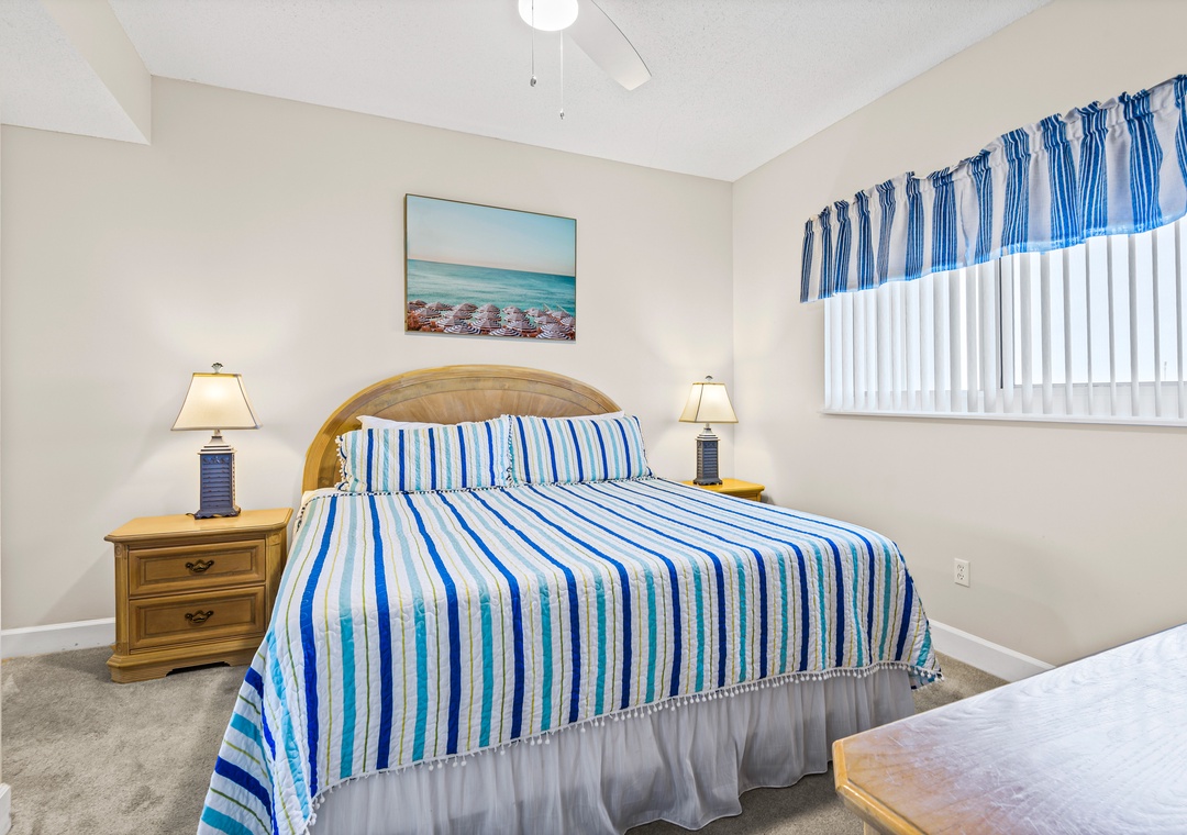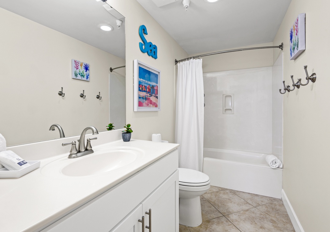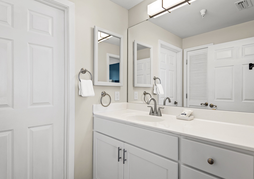 On the other side of the condo is the second king sized bedroom with another en suite bath featuring a tub/shower combo. Across the hall is the third bedroom with a king-sized bed and a set of twin bunk beds, comfortably sleeping 4. The third full bath also has a tub/shower combo and is accessible from this bedroom as well as from the hallway. A pack 'n play is also offered.