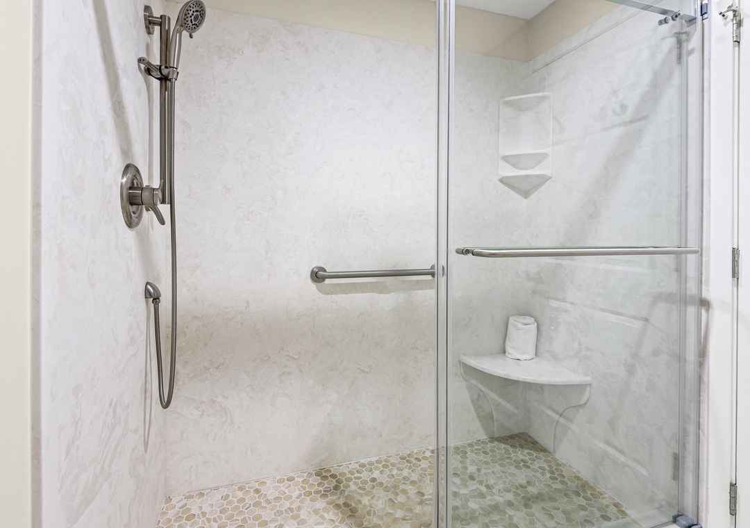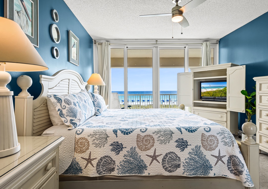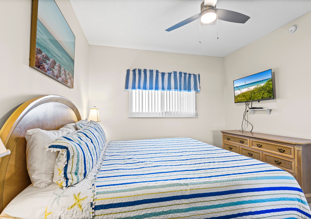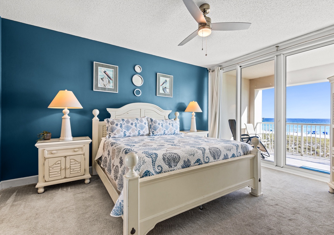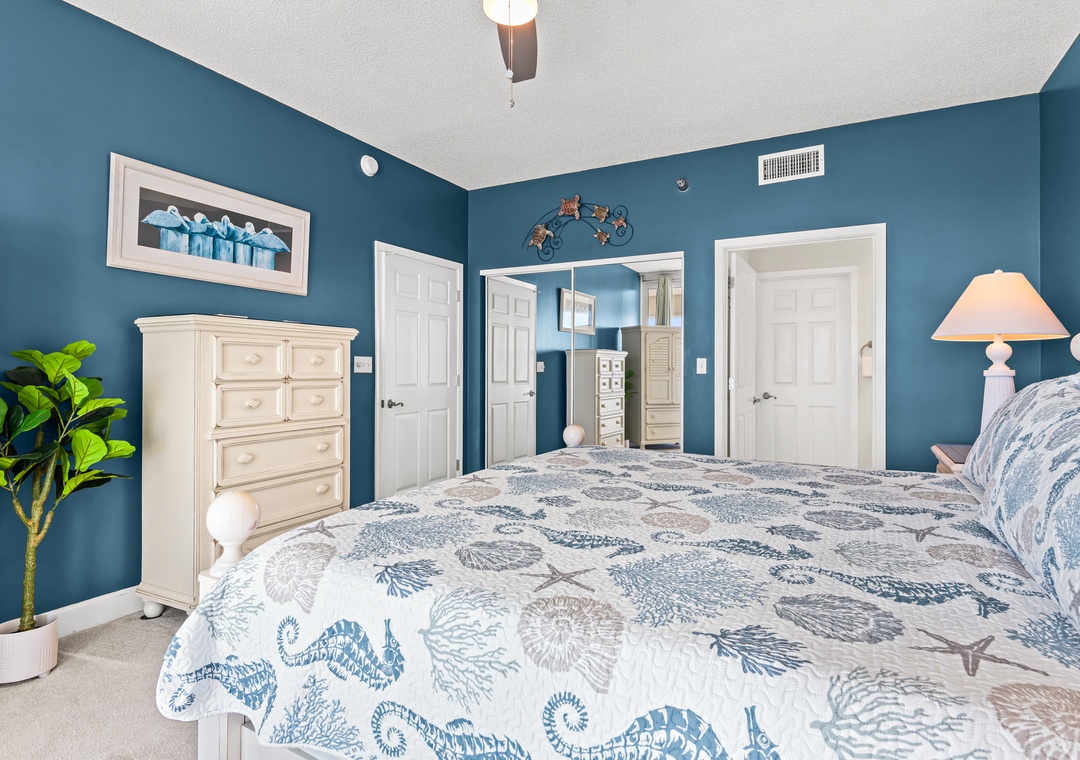 The spacious en suite primary bedroom is king sized and also has floor to ceiling sliders opening onto the Gulf front balcony. Let the sound of the waves lull you to sleep or greet you as you rise. The primary bath features a quartz countertop and large walk-in tiled shower.