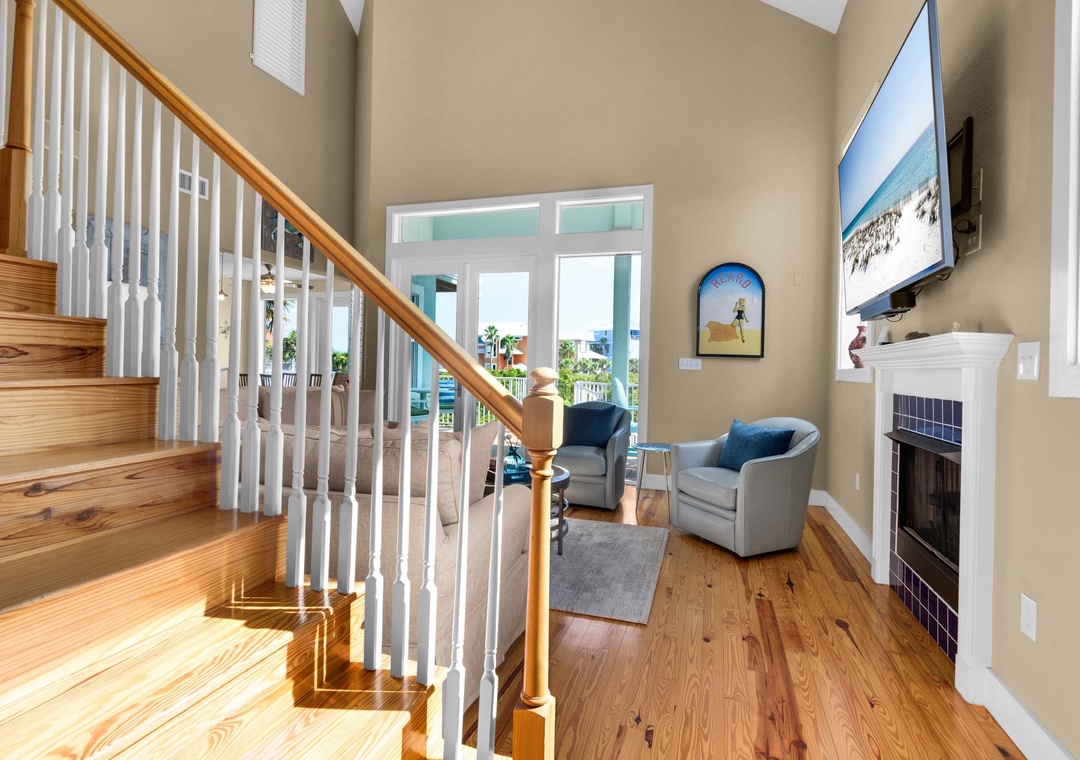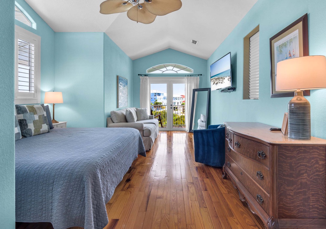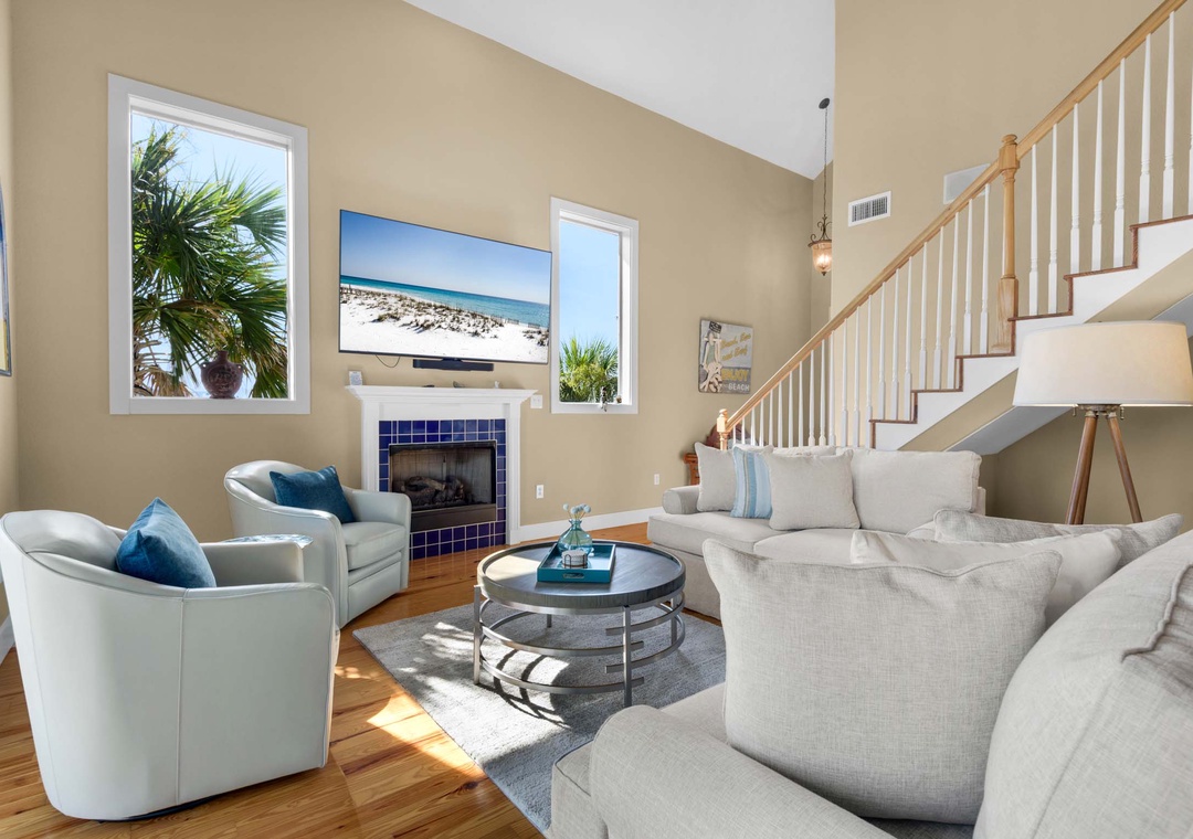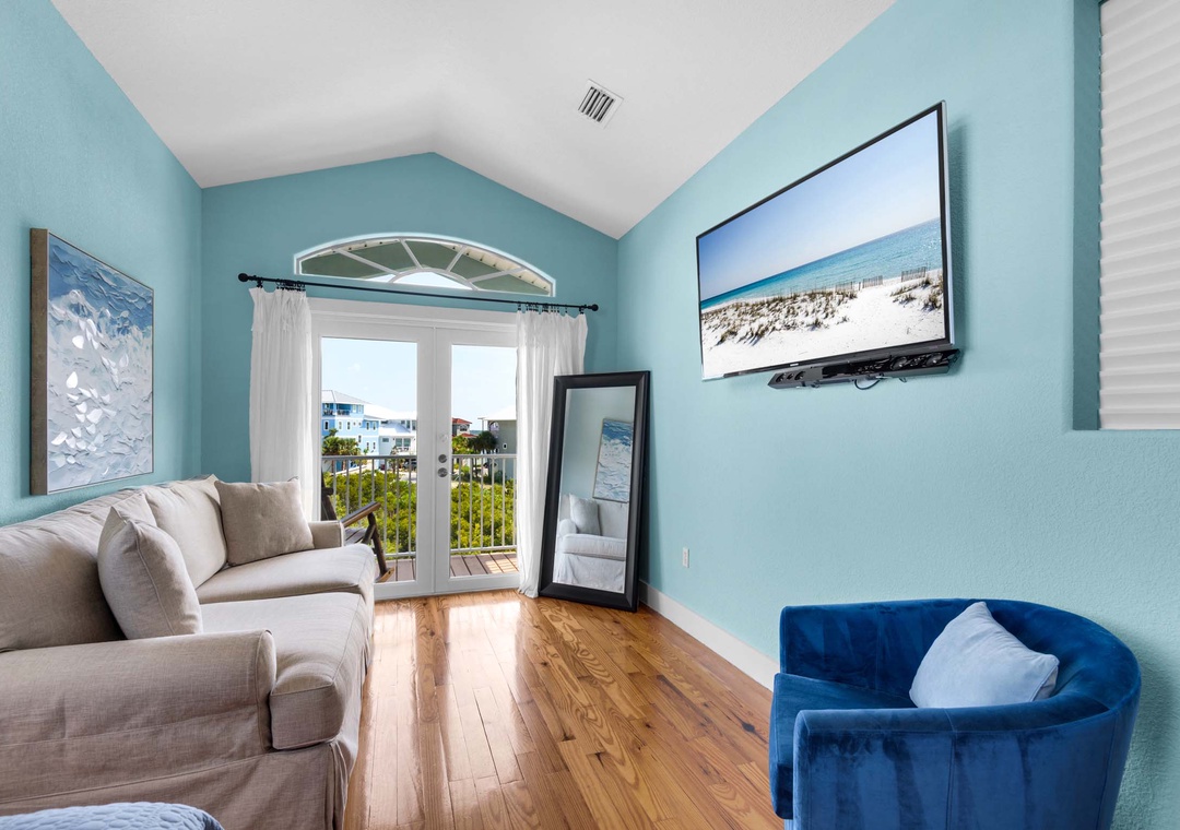 The main living area features an open-concept layout with comfortable seating, a large Smart TV, a dining table for six, and a modern kitchen with stainless steel appliances, granite countertops, and ample storage. Two queen bedrooms on this level offer front balcony access and share a full bath with a shower/tub combo. Upstairs, the spacious primary suite boasts a king bed, private balcony, seating area, and a spa-like en suite with soaking tub, walk-in shower, and double vanities.