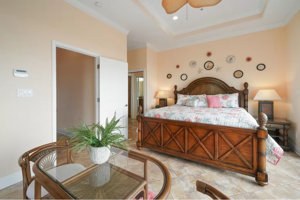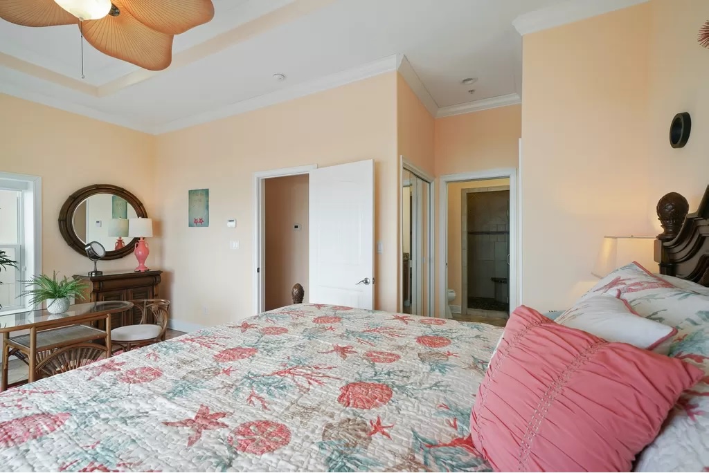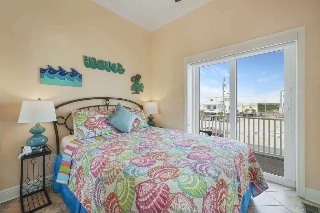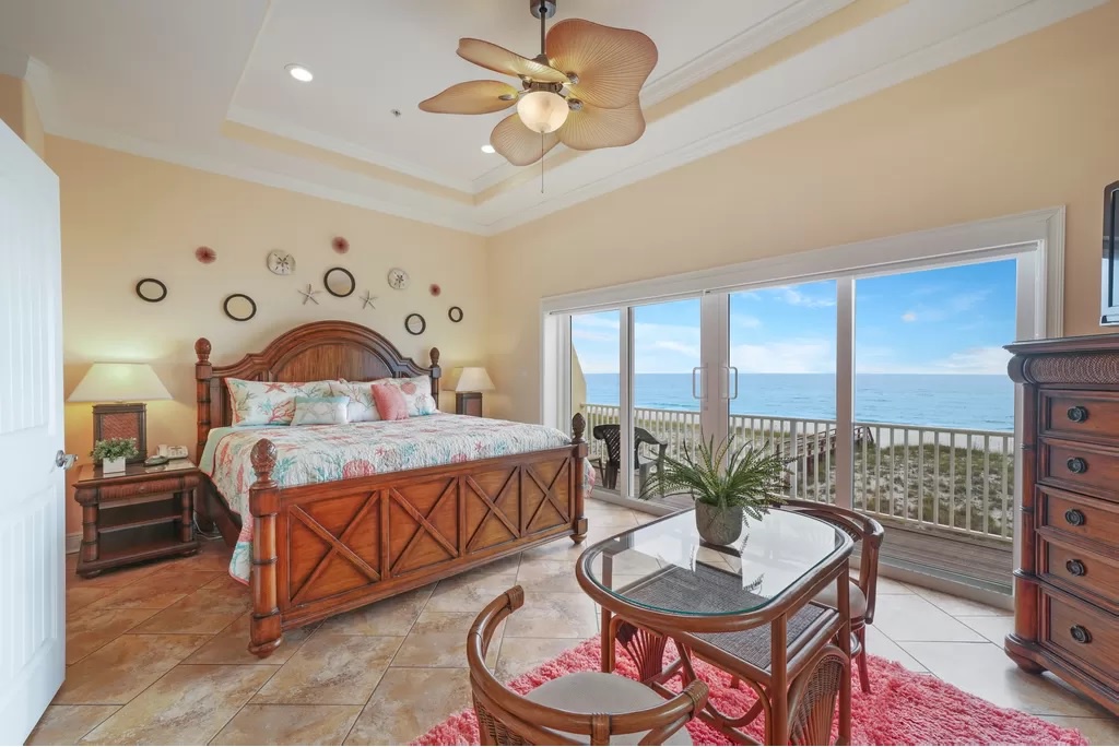 The upper floor has a huge king-sized primary bedroom with Gulf front balcony. The en suite bath features a walk- in tiled shower along with a tub and dual sinks.
