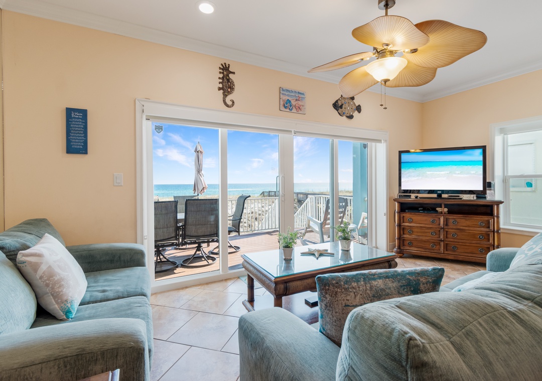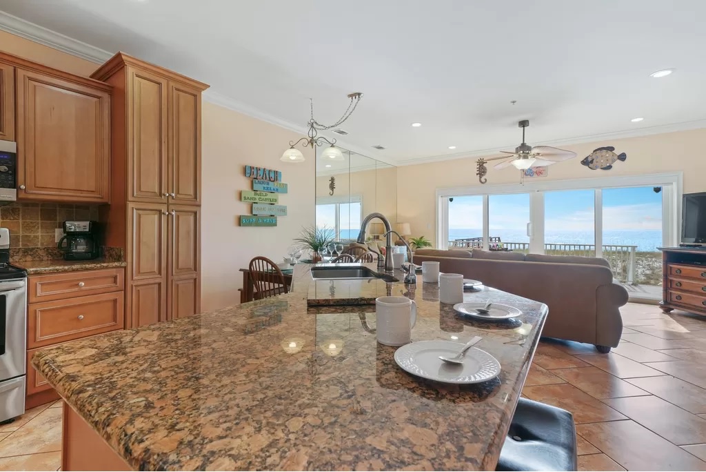 Comfortable and roomy for your party of 10, this home features open concept living with an updated granite/stainless steel kitchen, breakfast bar seating 4, table seating 6 and comfortable couches to relax in. The wall of windows opens onto the Gulf front deck, where the beautiful water and twinkling sand are never far away.