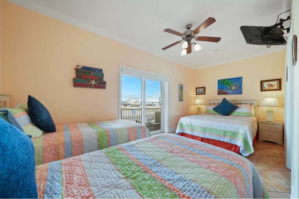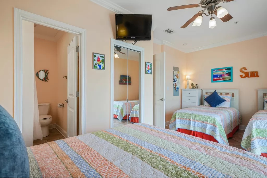 Down the hall are 2 queen-sized bedrooms with soundview balconies and a full bath in between. All 4 bedrooms have flat screen TV's.