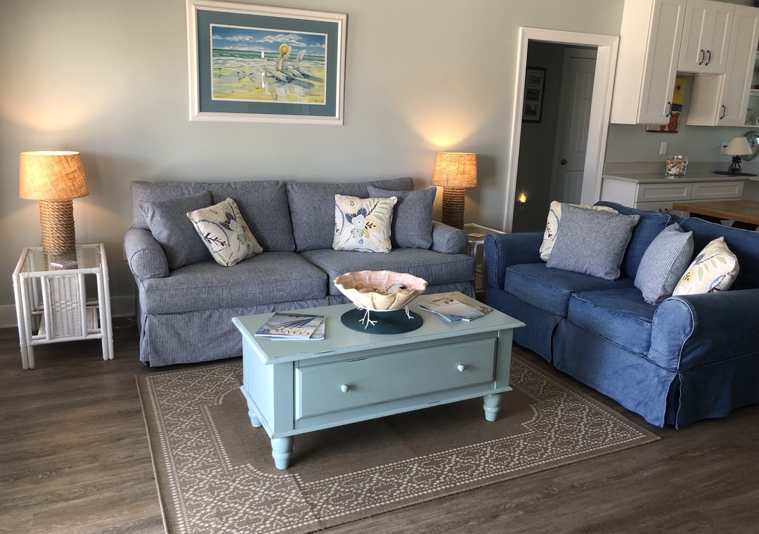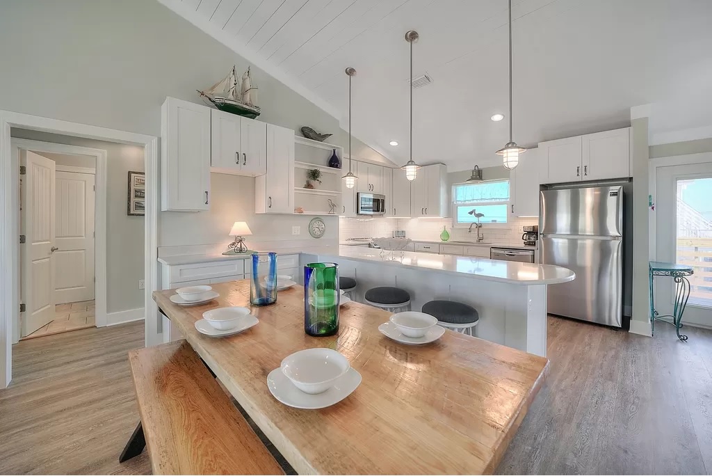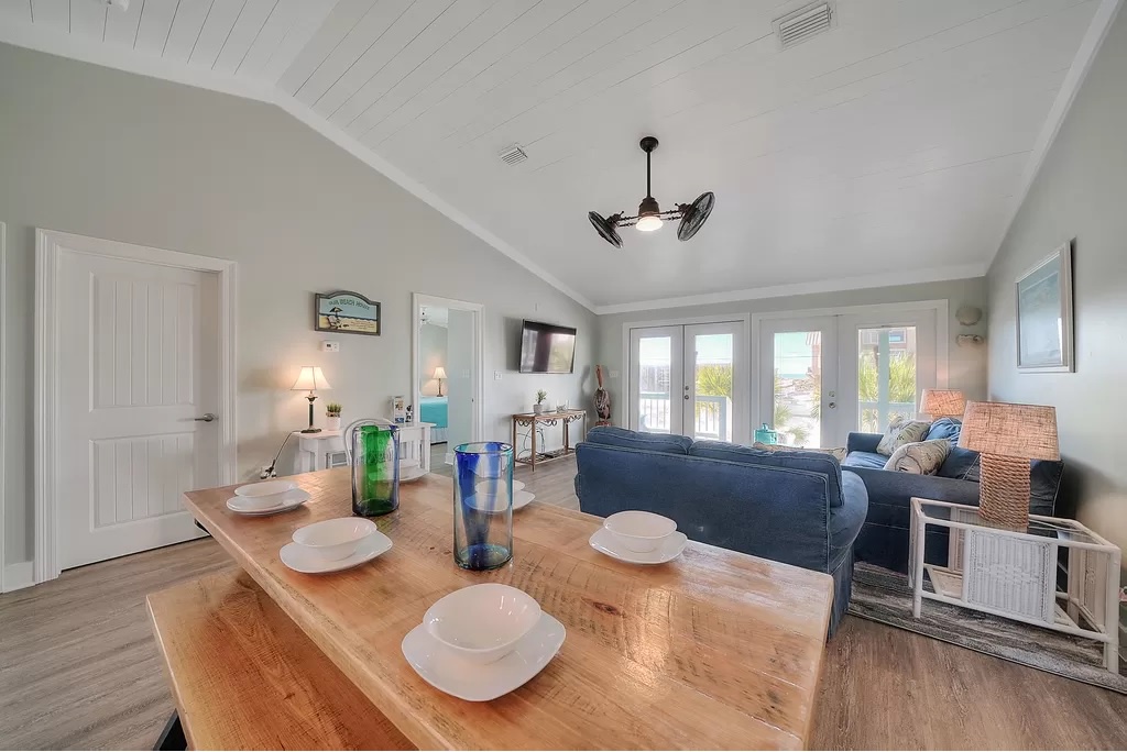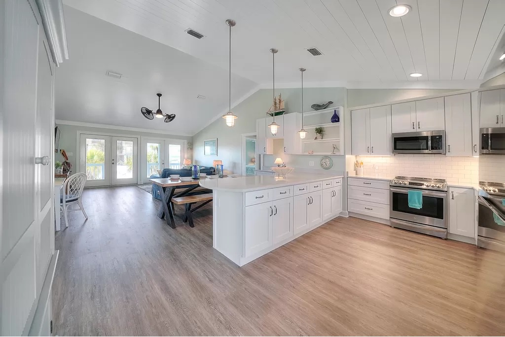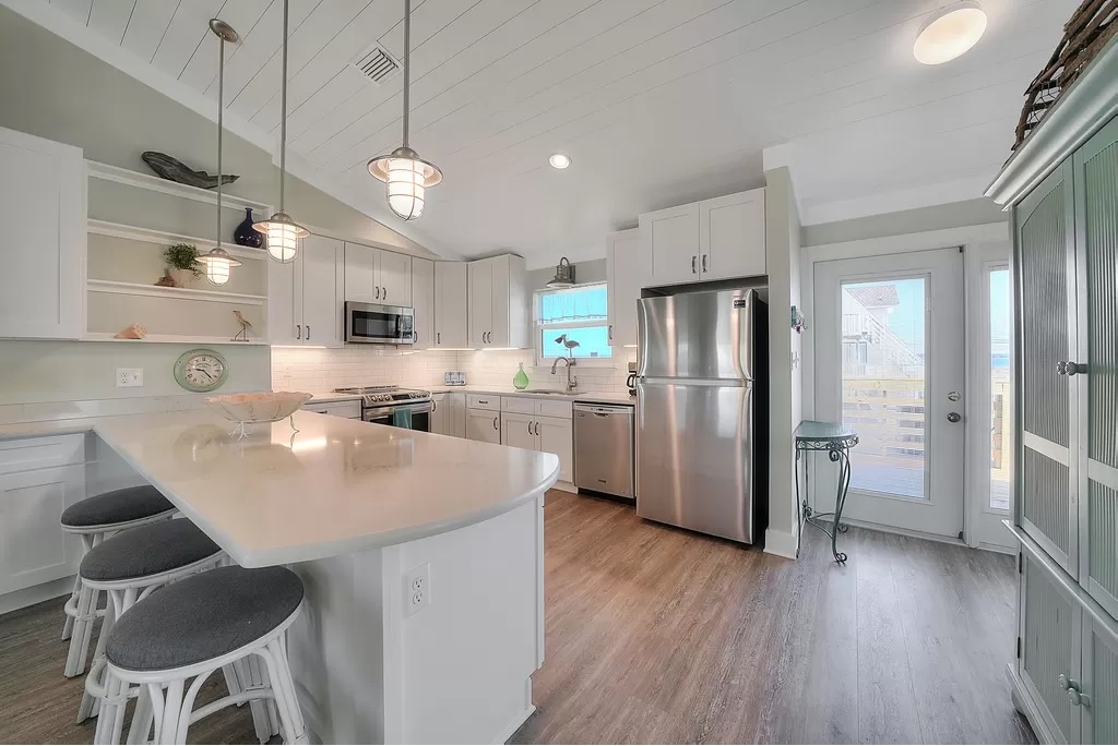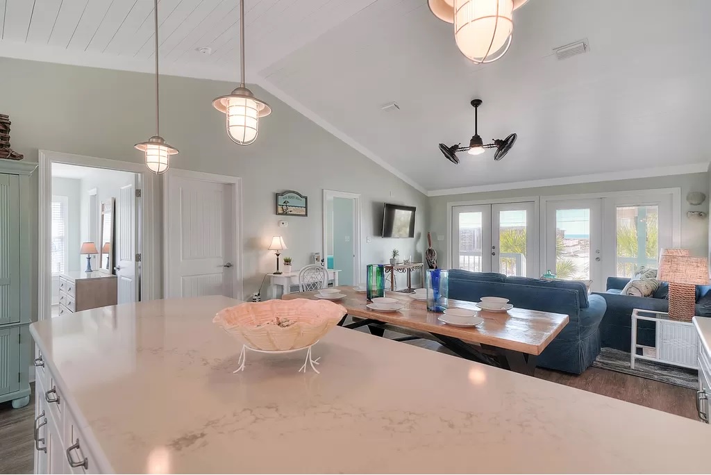 Buckeye is a cheerful, family-friendly beach retreat perfectly positioned directly across from the Gulf of Mexico. From the moment you step through the French doors, you’ll feel instantly relaxed by the bright coastal décor, open-concept living space, and sweeping water views. With brand-new flooring throughout and no carpet anywhere, the home feels fresh, clean, and thoughtfully updated. The spacious great room features a 55” TV visible from every angle, making it the perfect gathering spot after a day on the beach.