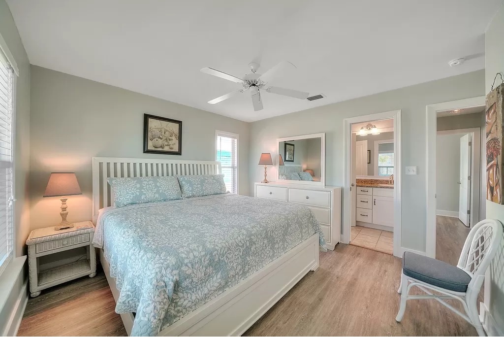 The fully equipped kitchen offers stainless steel appliances, granite countertops, custom cabinetry, and plenty of prep space for multiple cooks. A hand-crafted dining table seats eight, with additional seating at the breakfast bar. Buckeye comfortably sleeps eight guests across four bedrooms—one king primary suite and three queen bedrooms—each offering gorgeous Gulf or Sound views and flat-screen TVs. Two updated bathrooms include one walk-in shower and one tub/shower combo.