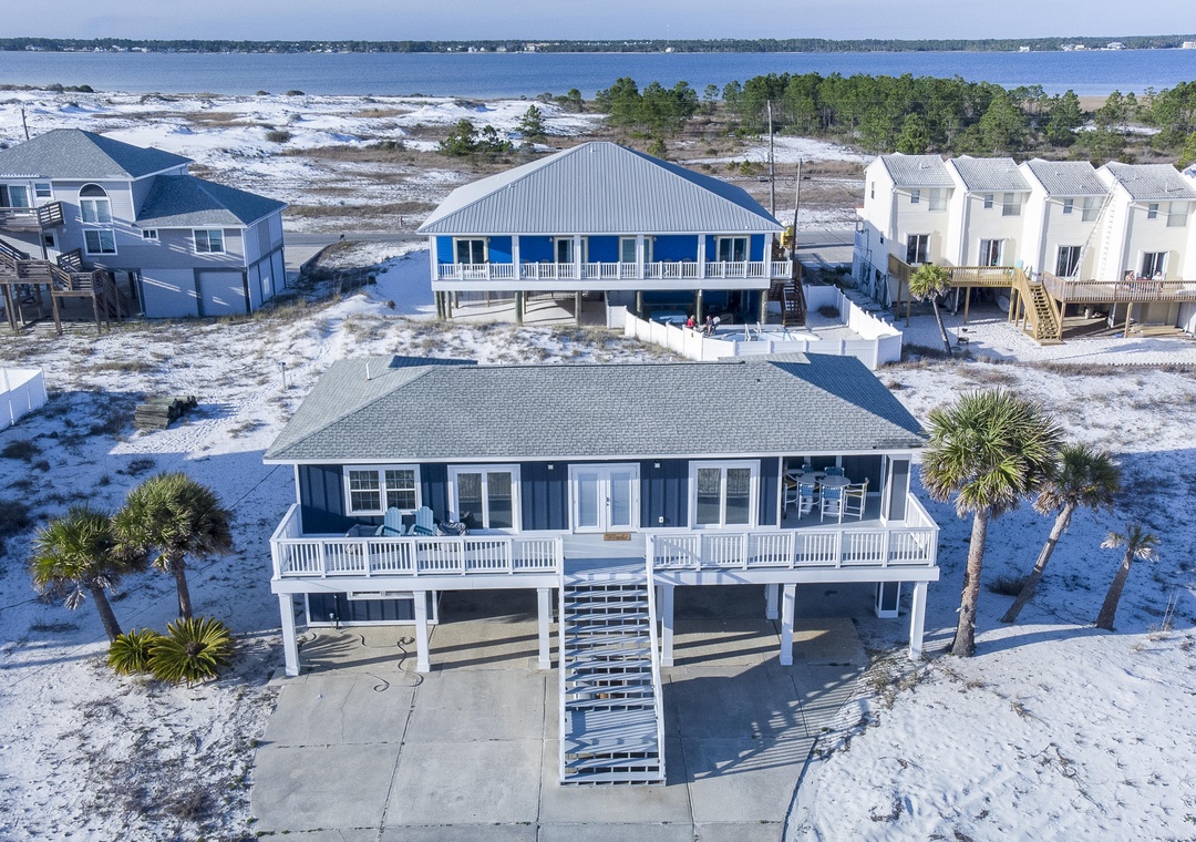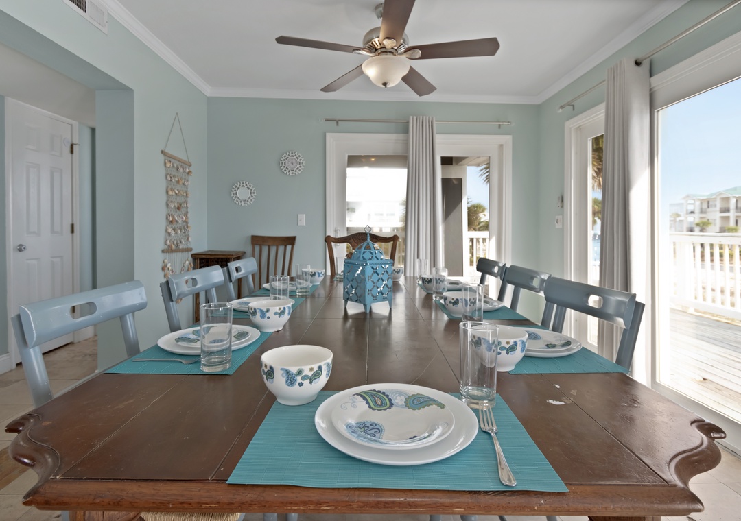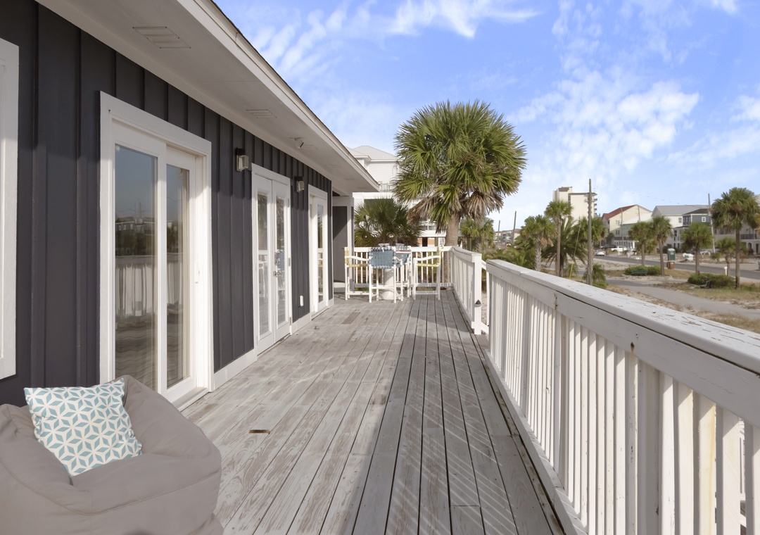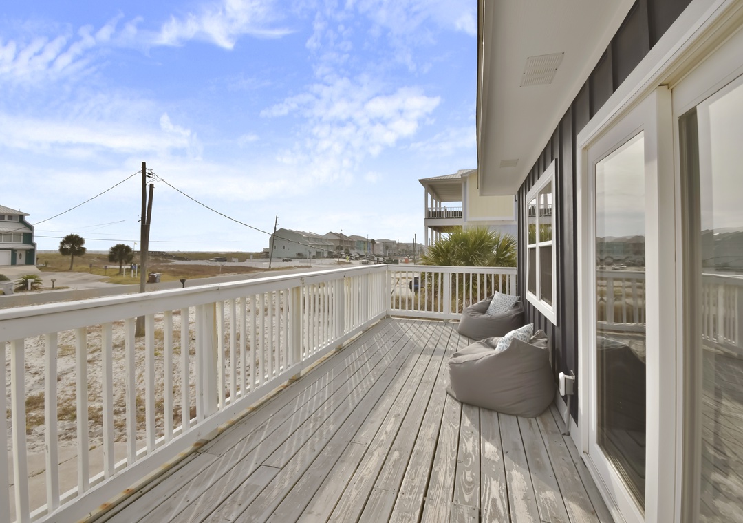The large front porch spans the length of the home and has a Gulf view. Have a meal, snack or drinks in the sunshine or under the stars!