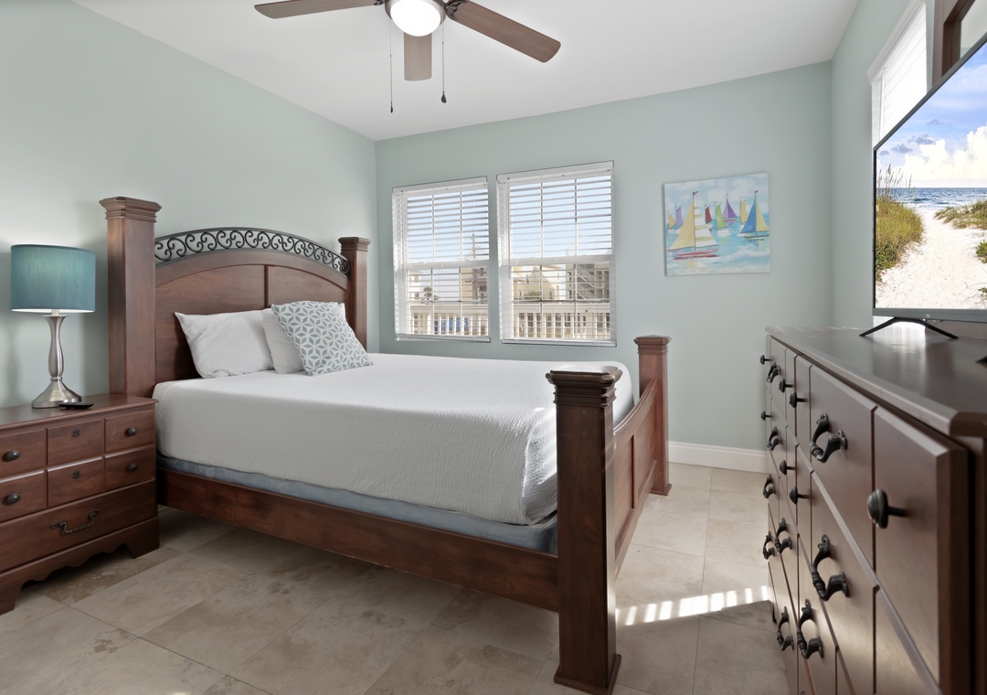 One side of the house is the queen sized primary with en suite bathroom. There is a private stairway down to a "hang out" room with couches and flat screen TV. It's a great spot for gaming or reading a book.