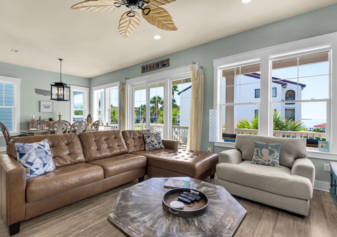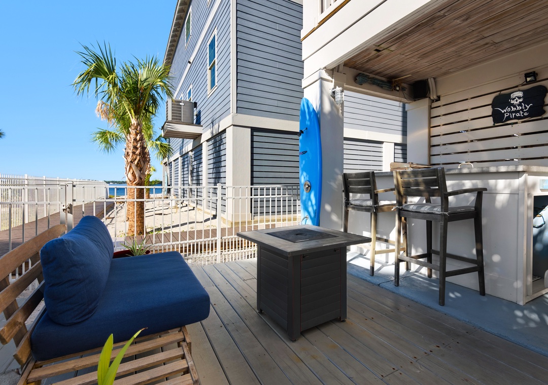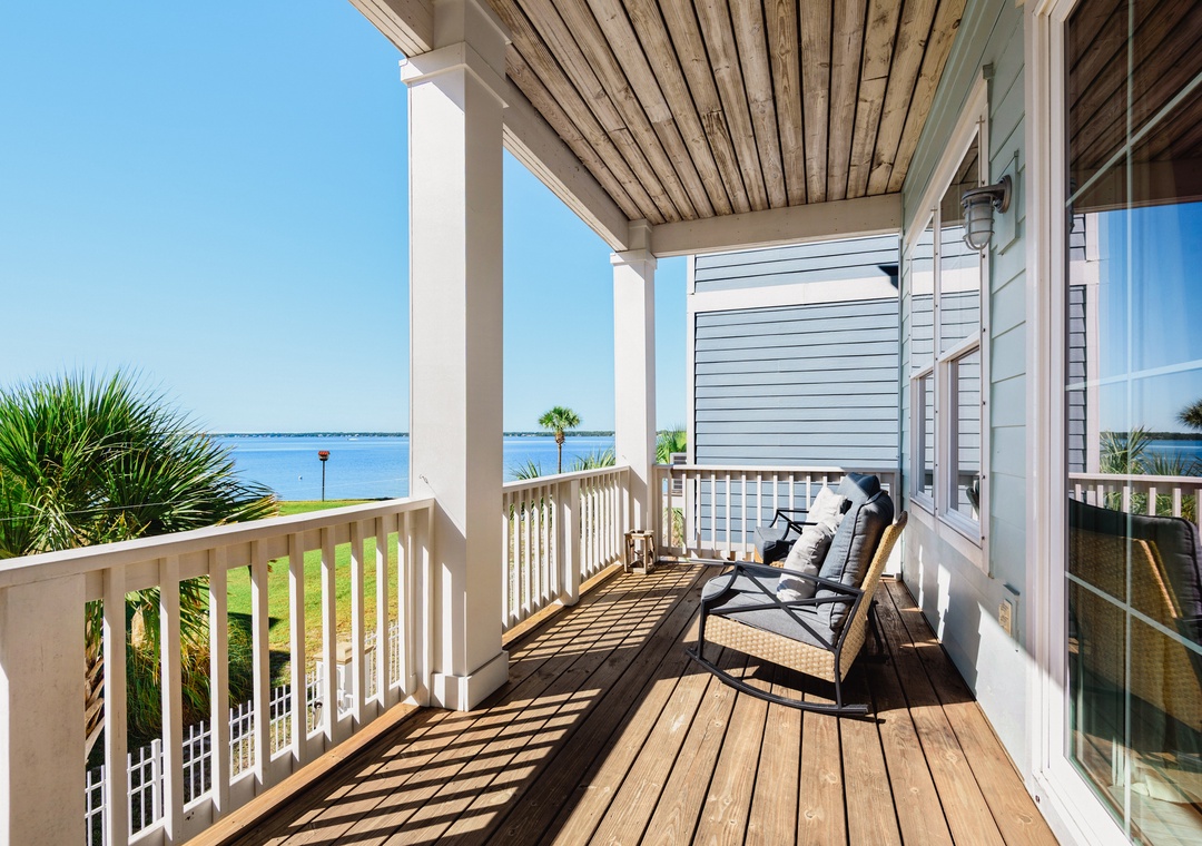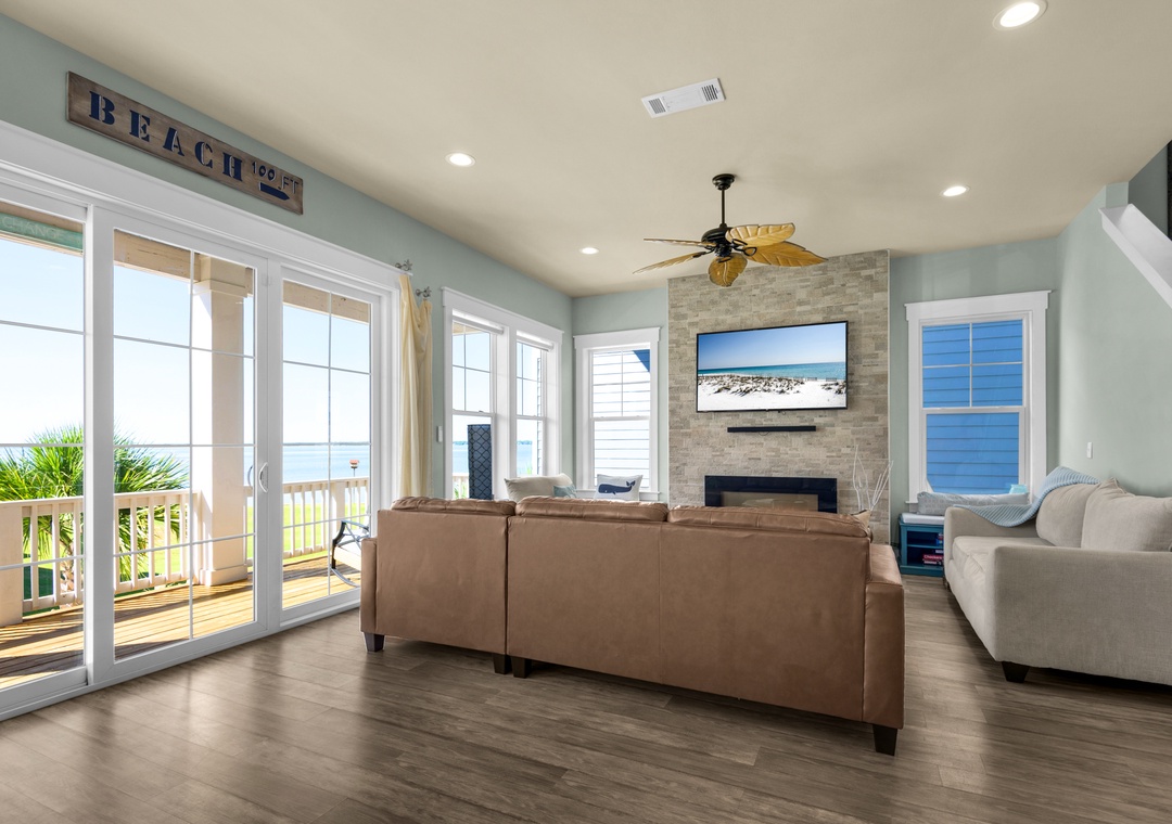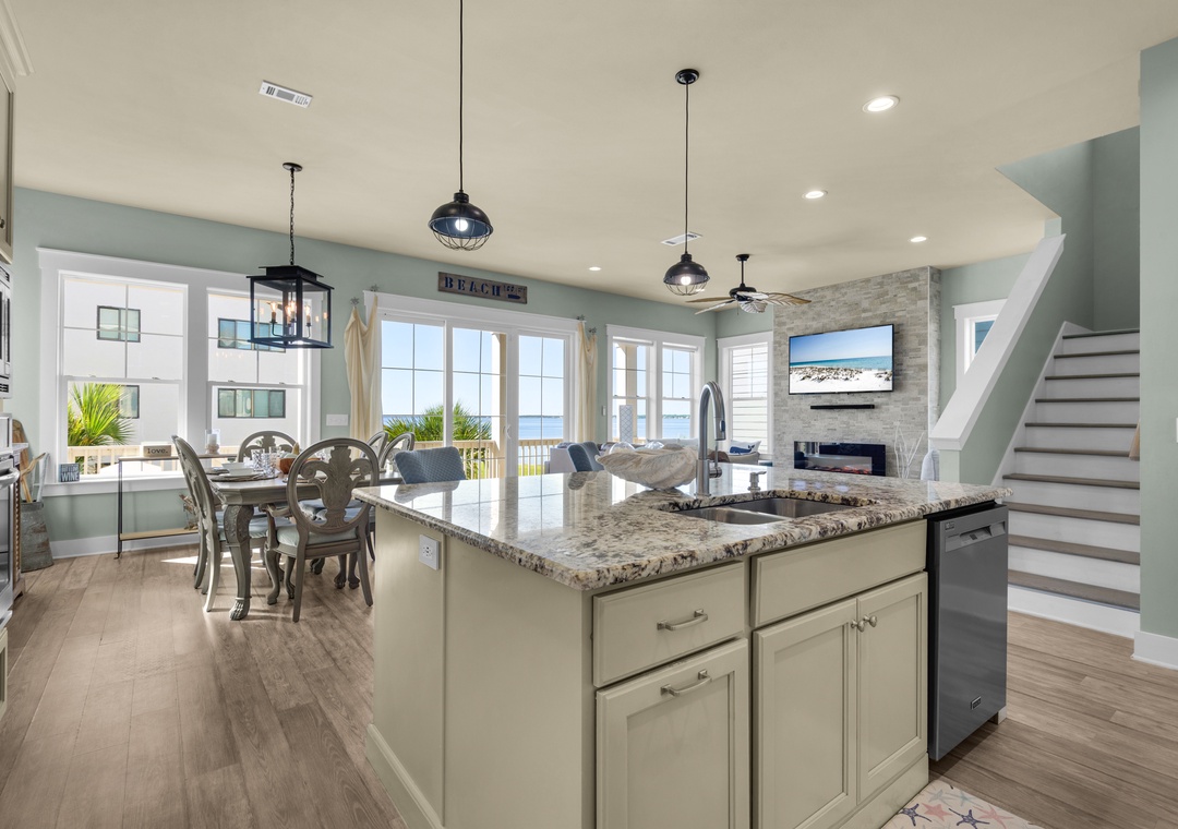 Driftwood Cottage offers plenty of room for your group of 13 to enjoy the great room, and a well-stocked, large kitchen with an island for your mealtime memories. This home has a primary king bedroom with an ensuite, a guest king bedroom, a guest queen bedroom, a full-over-full bunk bed room, and a twin-over-full bunk bed room. Every room has a Smart TV for your nights in, and there is a propane grill for guest use. The house is wrapped with large balconies with cozy seating, ideal for morning coffees or sunset cocktails. You will love being able to see water from all over the house and balconies.