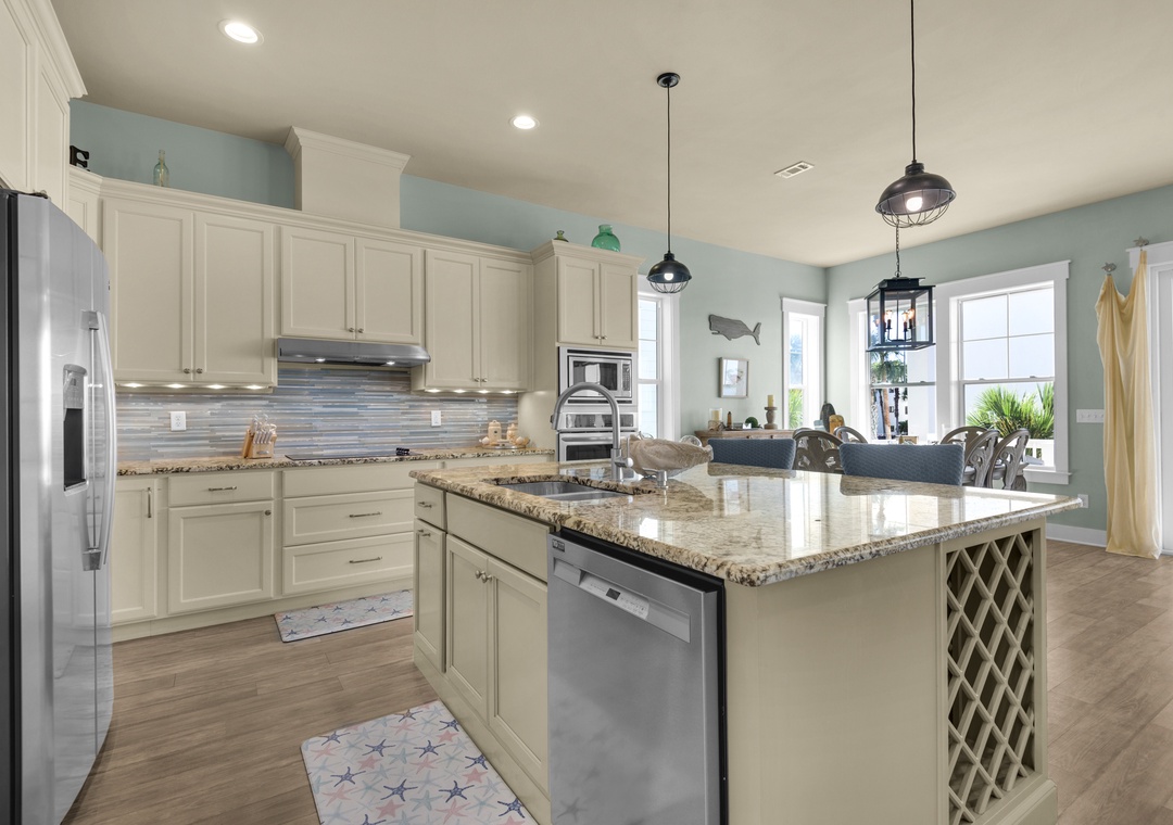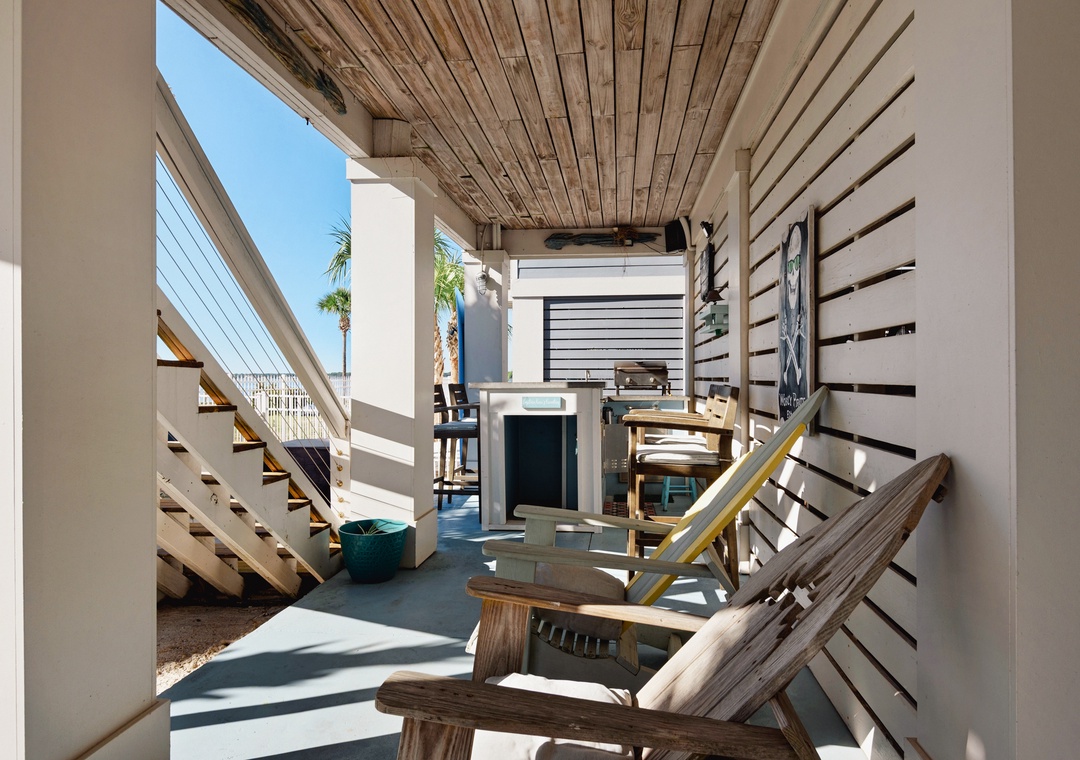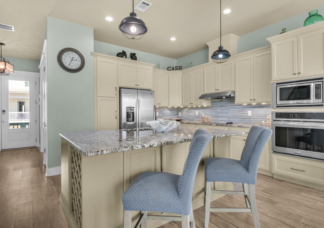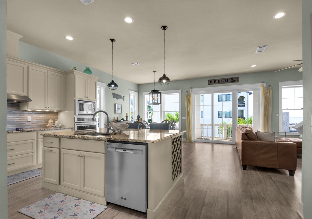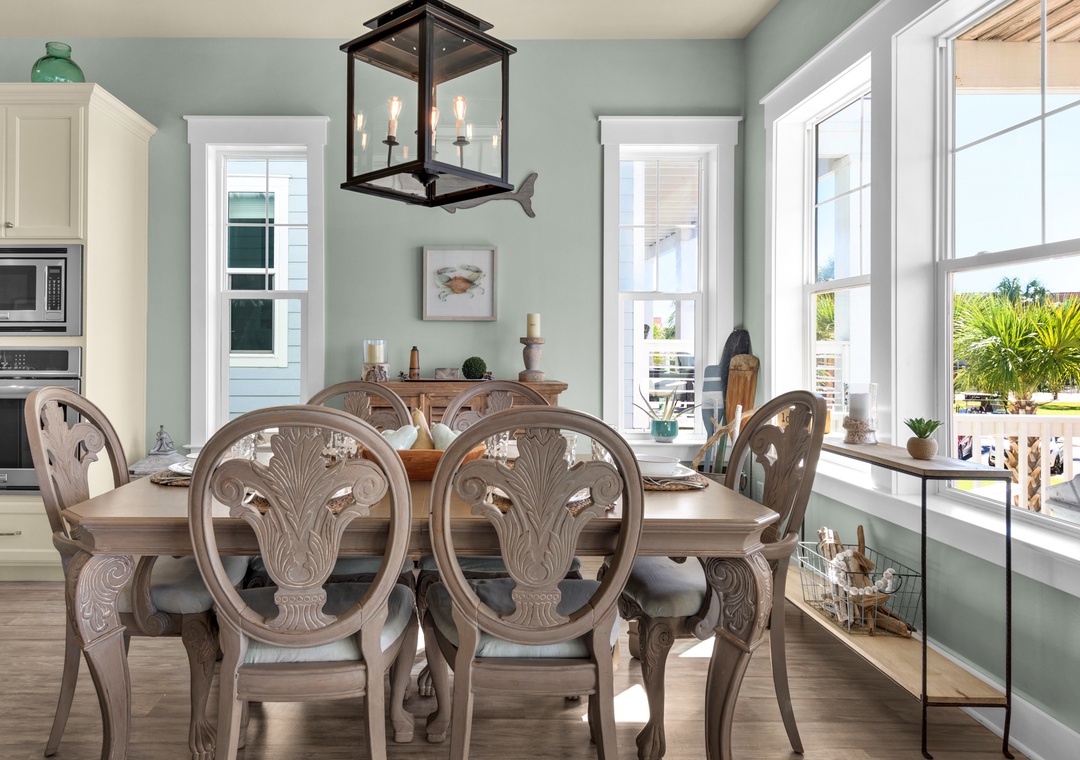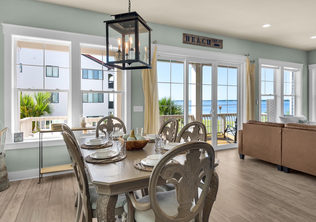 Driftwood Cottage offers plenty of room for your group of 13 to enjoy the great room, and a well-stocked, large kitchen with an island for your mealtime memories. This home has a primary king bedroom with an ensuite, a guest king bedroom, a guest queen bedroom, a full-over-full bunk bed room, and a twin-over-full bunk bed room. Every room has a Smart TV for your nights in, and there is a propane grill for guest use. The house is wrapped with large balconies with cozy seating, ideal for morning coffees or sunset cocktails. You will love being able to see water from all over the house and balconies.