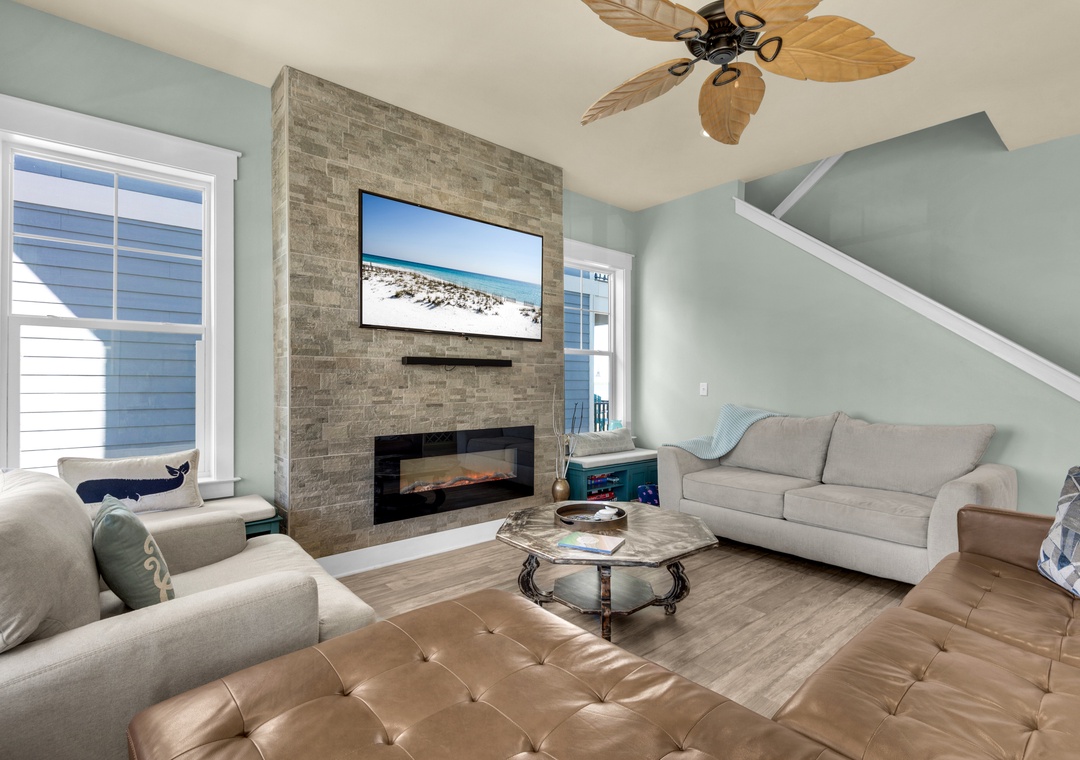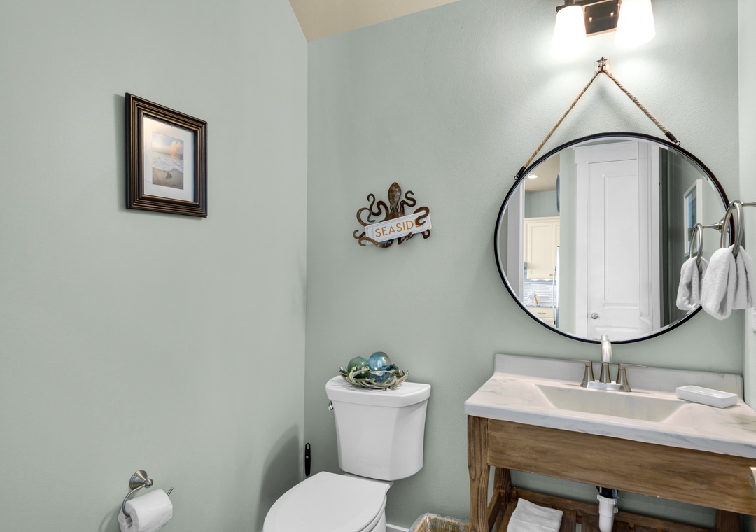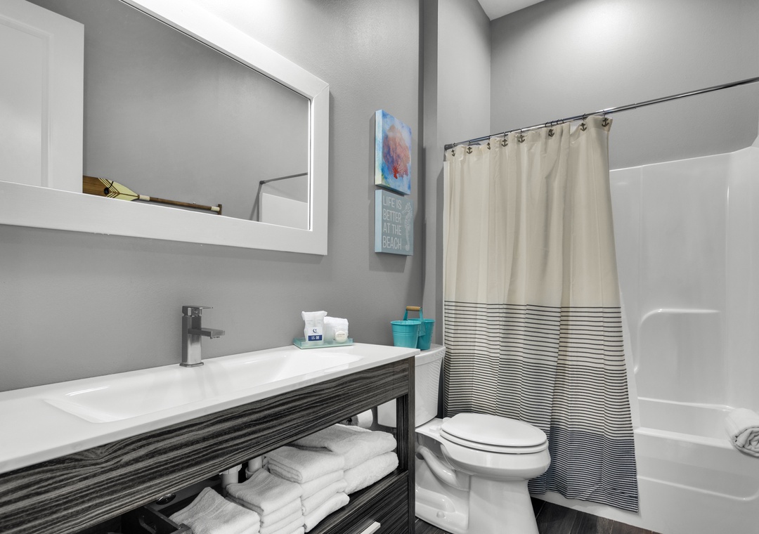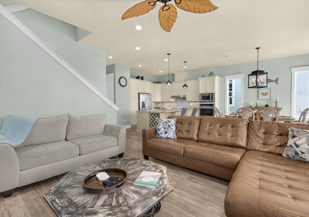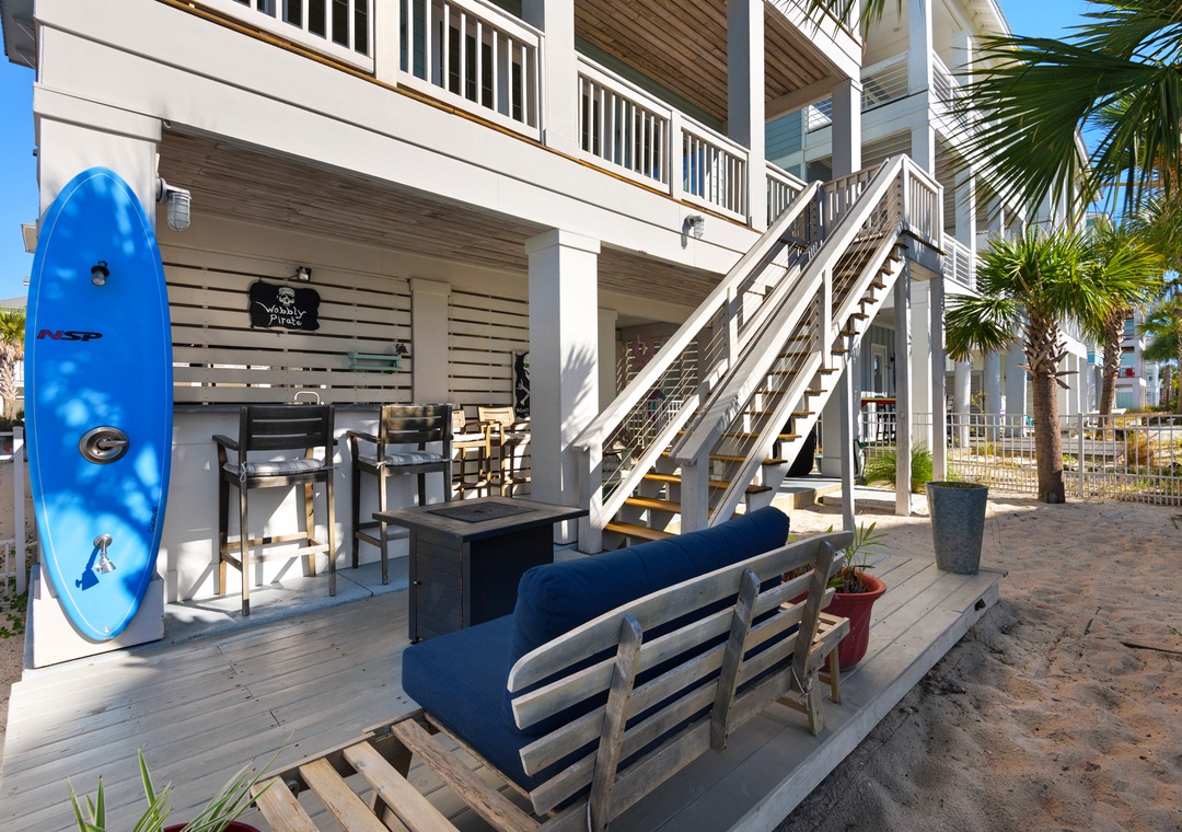 Driftwood Cottage offers plenty of room for your group of 13 to enjoy the great room, and a well-stocked, large kitchen with an island for your mealtime memories. This home has a primary king bedroom with an ensuite, a guest king bedroom, a guest queen bedroom, a full-over-full bunk bed room, and a twin-over-full bunk bed room. Every room has a Smart TV for your nights in, and there is a propane grill for guest use. The house is wrapped with large balconies with cozy seating, ideal for morning coffees or sunset cocktails. You will love being able to see water from all over the house and balconies.