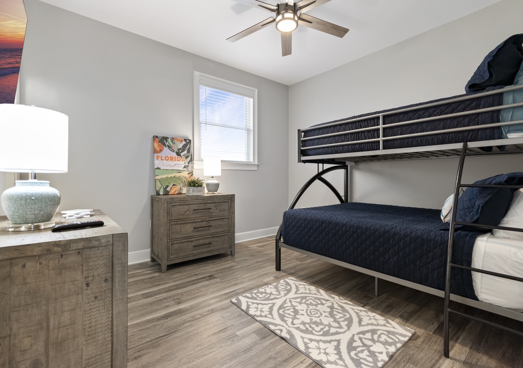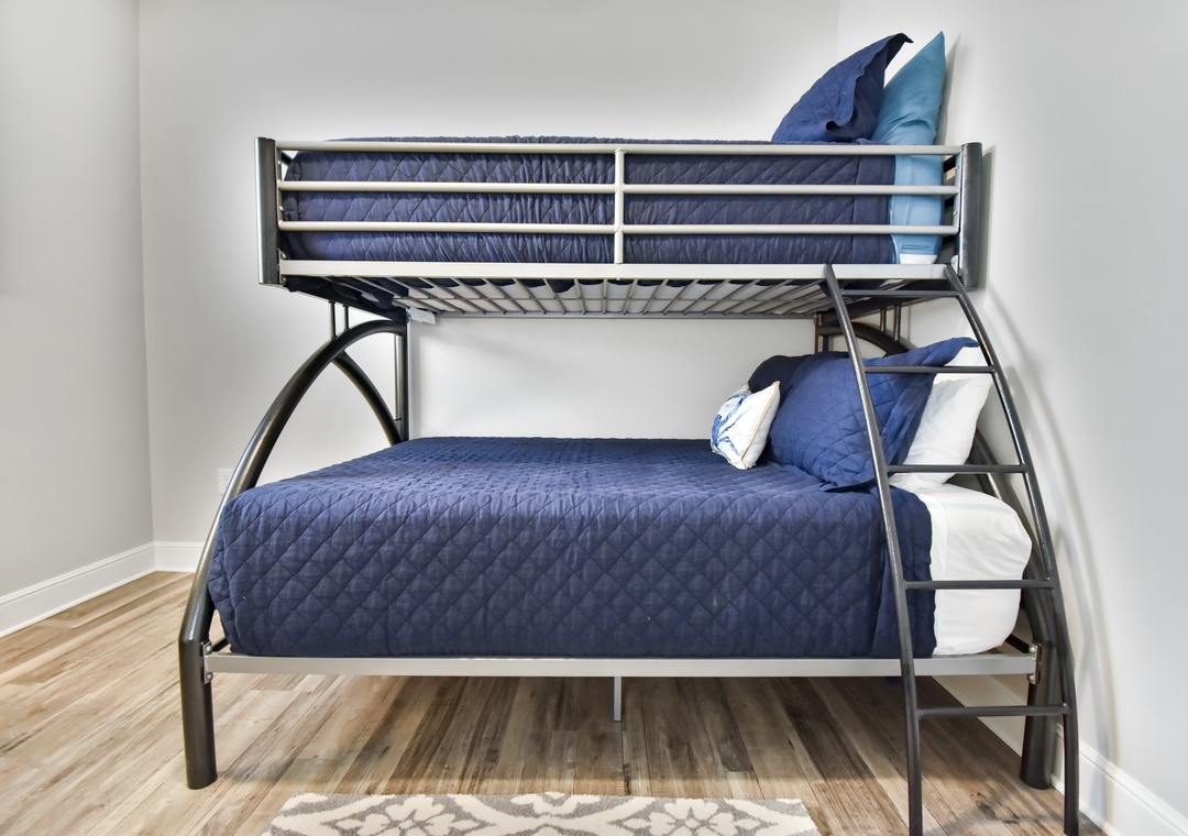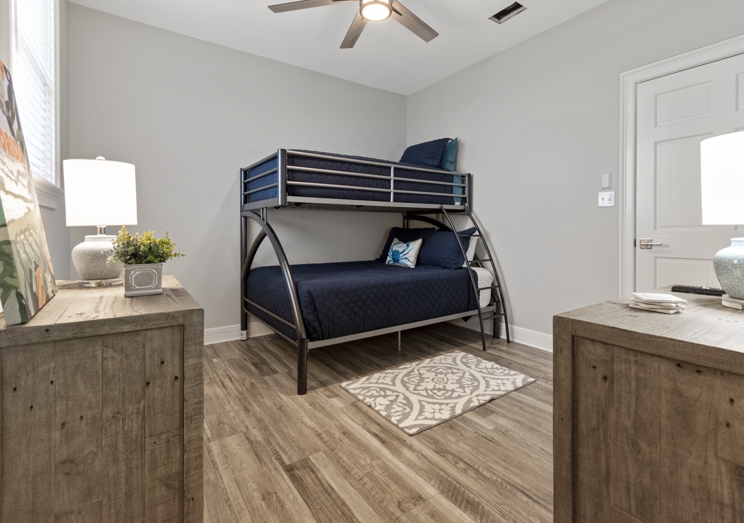 Down the hall is another bedroom with with bunk beds (full-sized lower, twin upper) , a convenient half bath and a large laundry room.