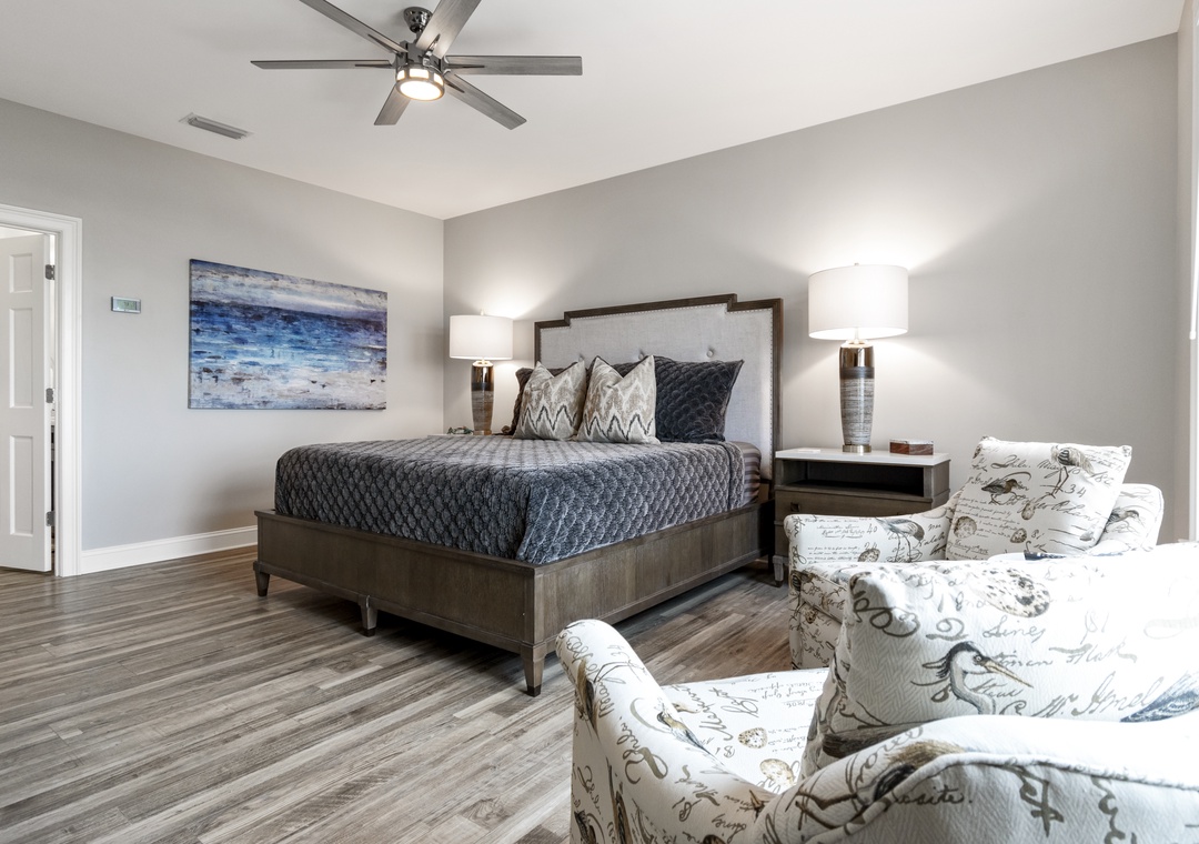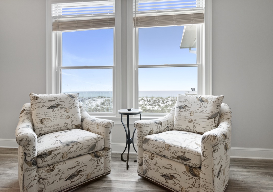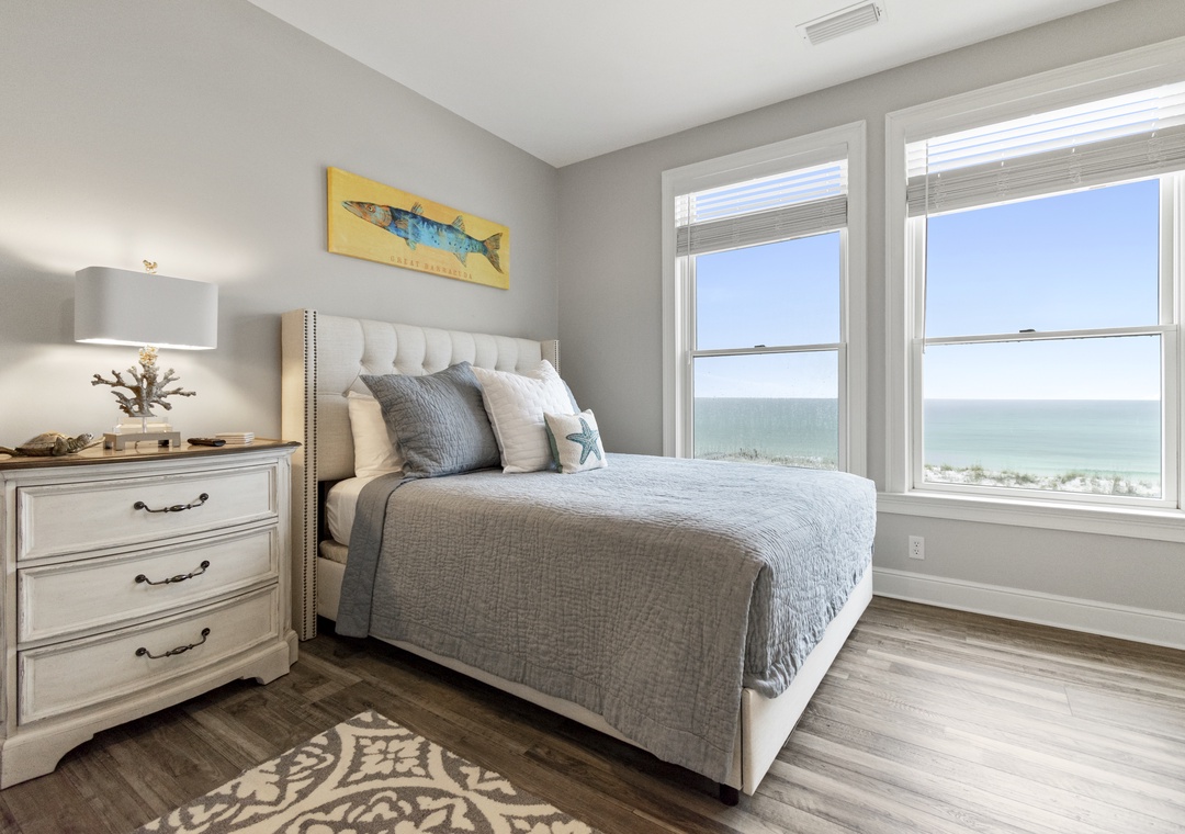 Offering sweeping, unobstructed views of the Gulf of Mexico from its open floor plan great room, guests can enjoy the serene unobstructed waterfront setting from the comfort of the living space or the expansive waterfront deck that runs the length of the house. The deck provides ample seating for gatherings, perfect for soaking up the sun or enjoying al fresco dining.