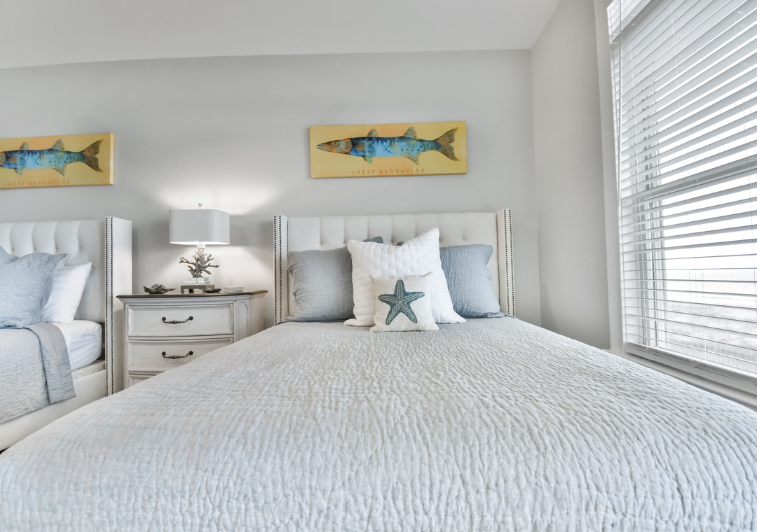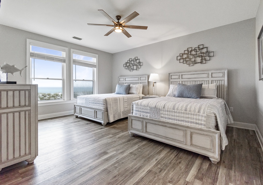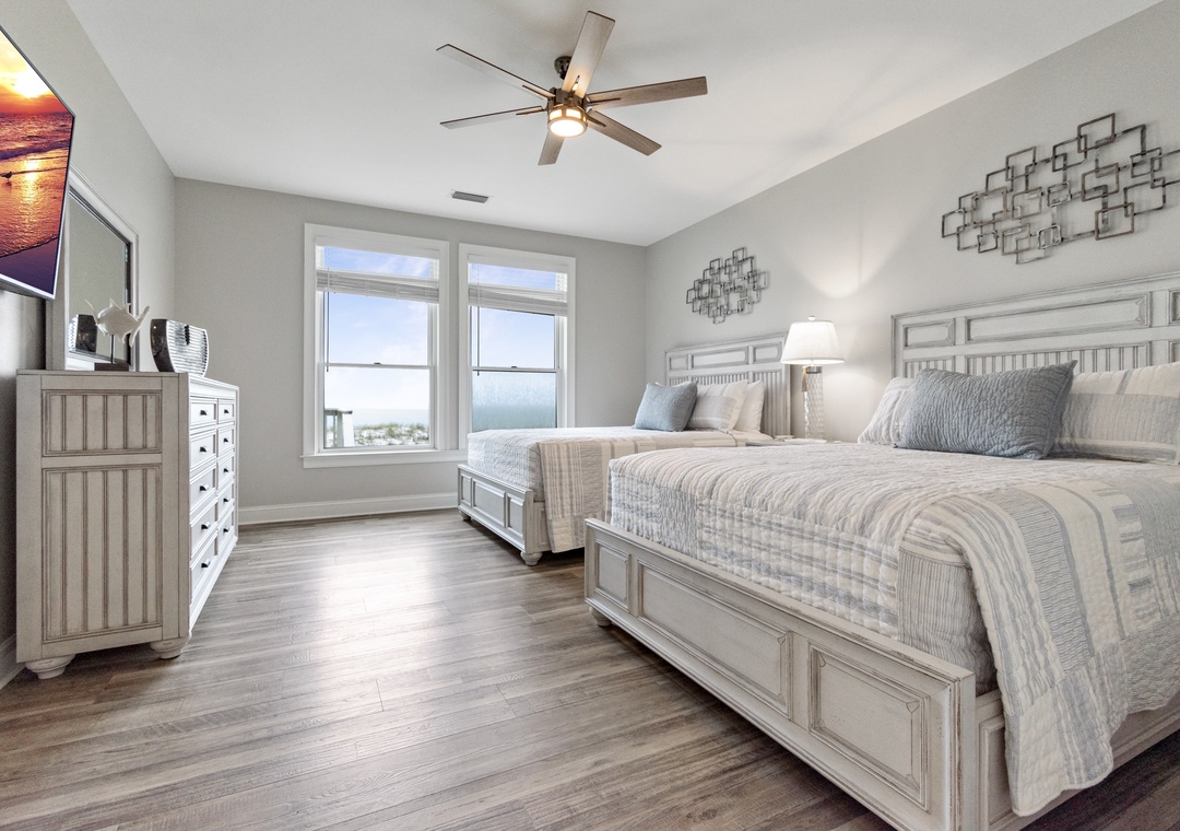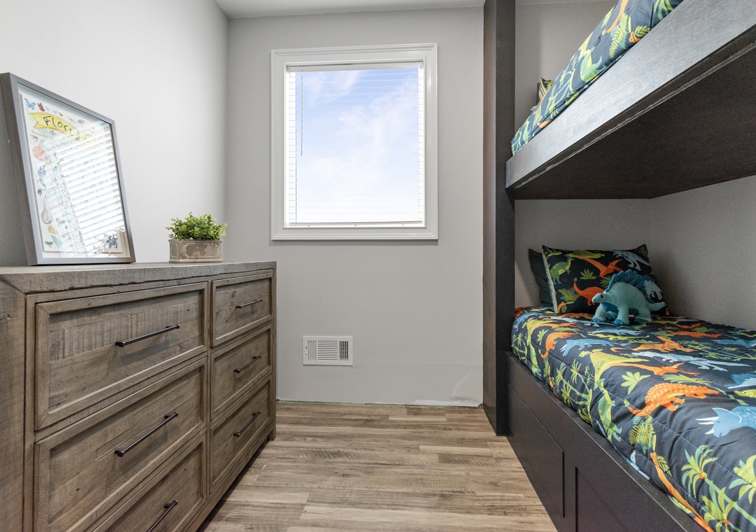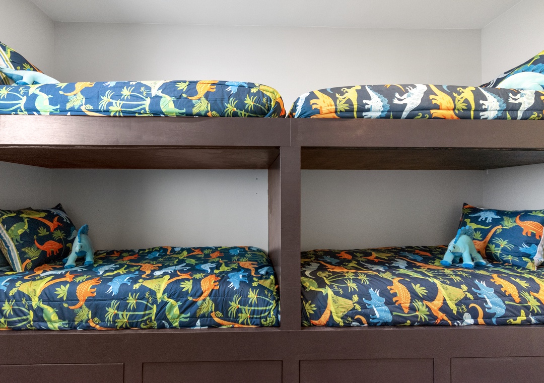 Upstairs, two additional primary bedrooms with ensuite bathrooms and 2 queen-sized beds in each offer privacy and comfort. A trundle bed is in the 6th bedroom along with a half bath, and 2 sets of twin built in bunks are in the remaining 7th bedroom. Another full bathroom completes this floor.