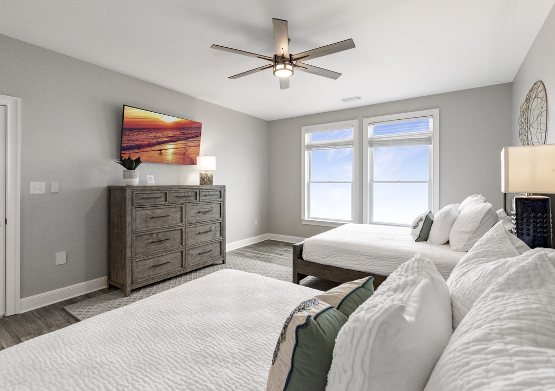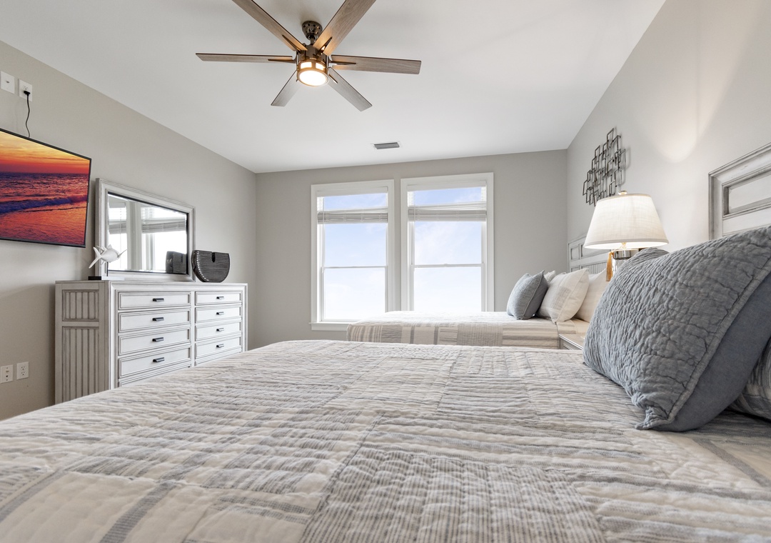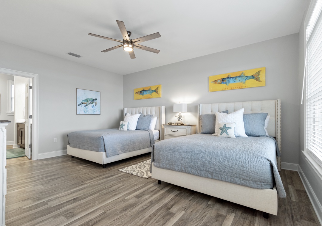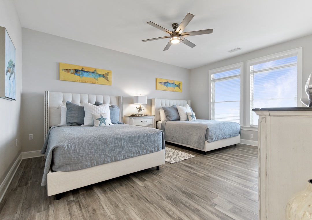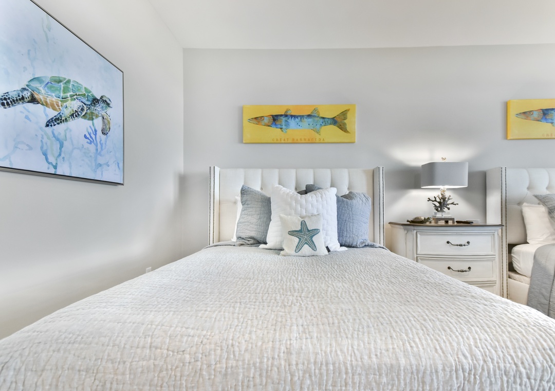 Upstairs, two additional primary bedrooms with ensuite bathrooms and 2 queen-sized beds in each offer privacy and comfort. A trundle bed is in the 6th bedroom along with a half bath, and 2 sets of twin built in bunks are in the remaining 7th bedroom. Another full bathroom completes this floor.