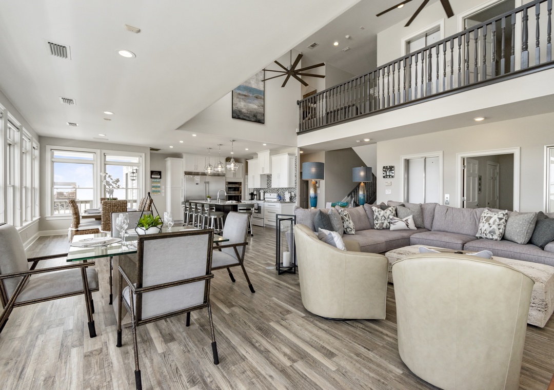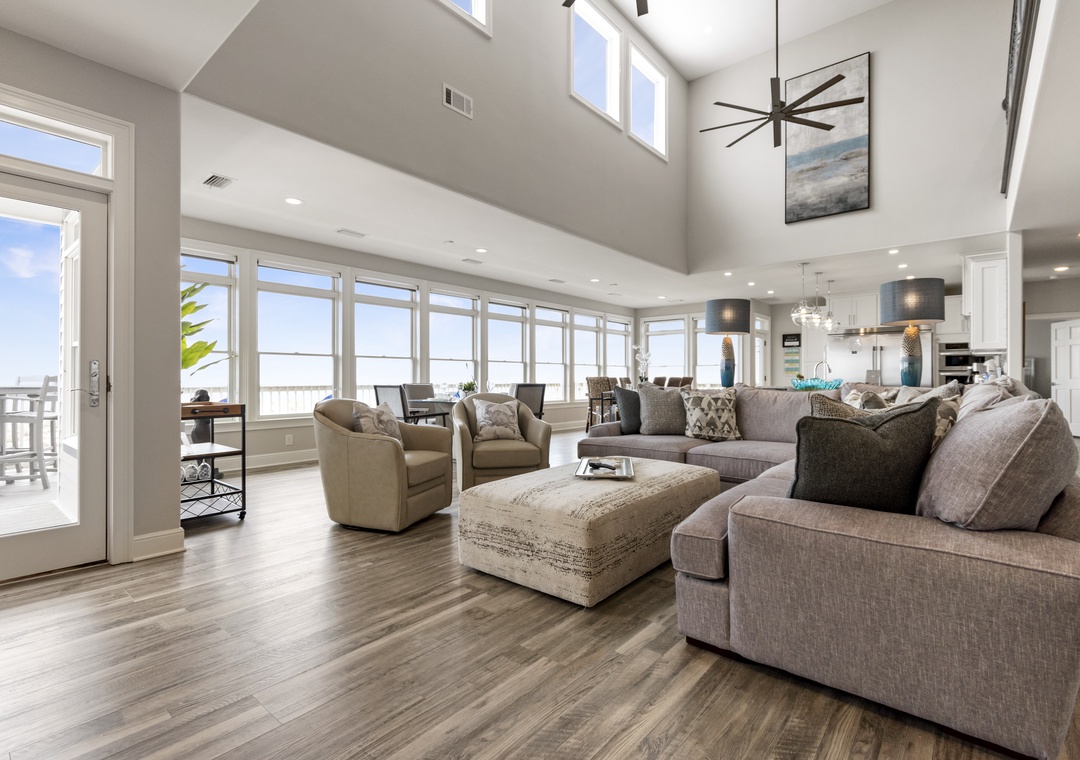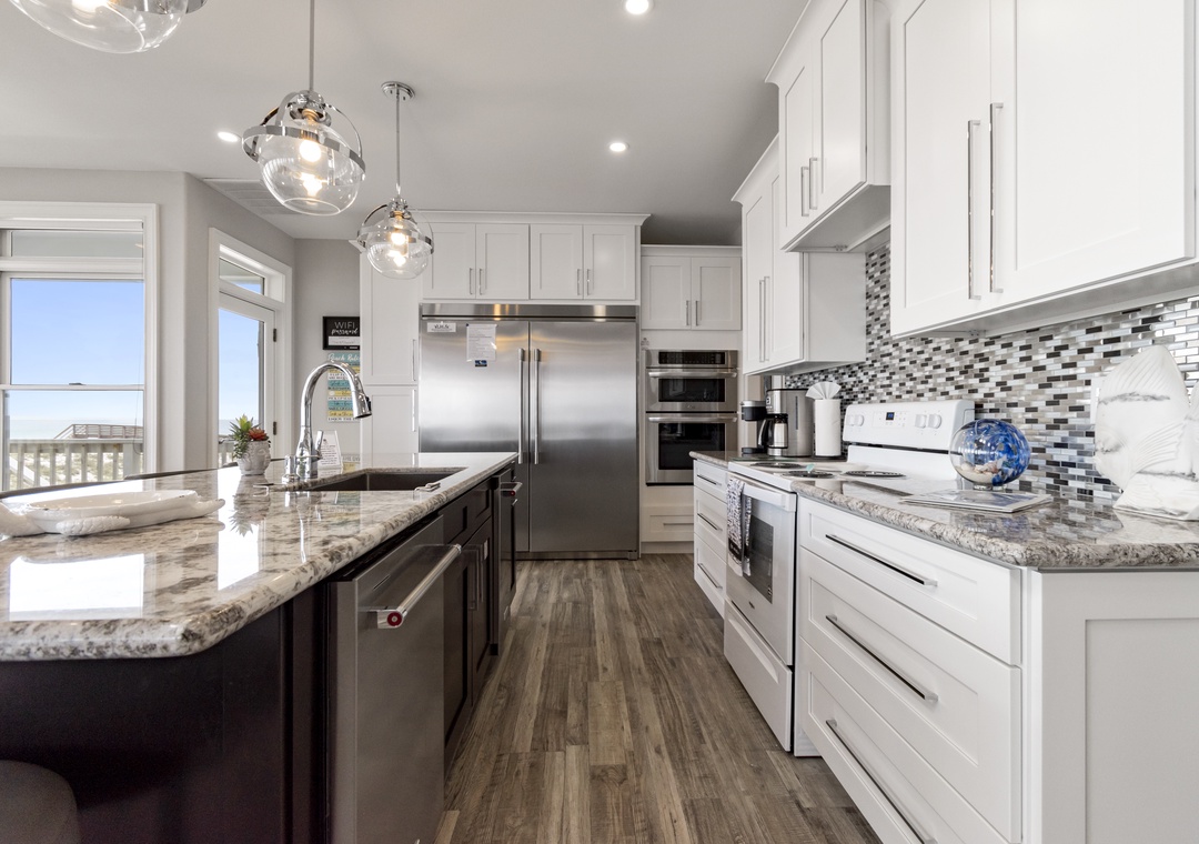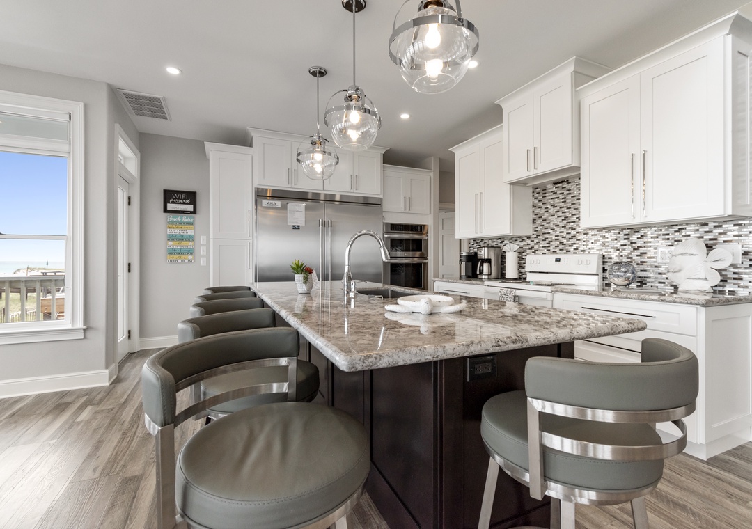 The highlight of the home is its huge custom gourmet kitchen, complete with top-of-the-line appliances and a large breakfast bar, ideal for hosting and preparing meals for groups. A private dune walk-over directly connects the property to the beach, providing guests with convenient and exclusive access.