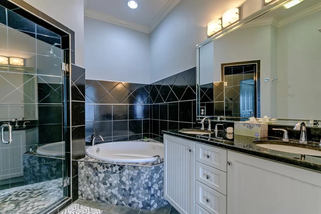 Upstairs is the large king-sized primary bedroom with ensuite bathroom. Luxury awaits you with a jetted tub, walk in shower and dual sinks.