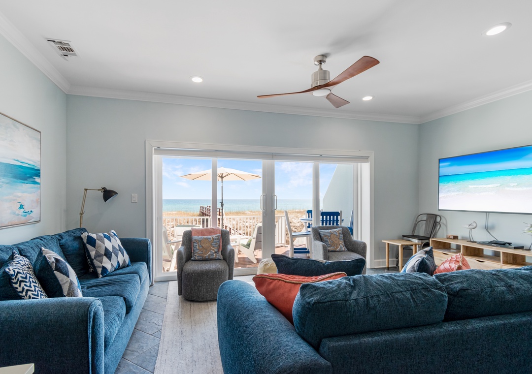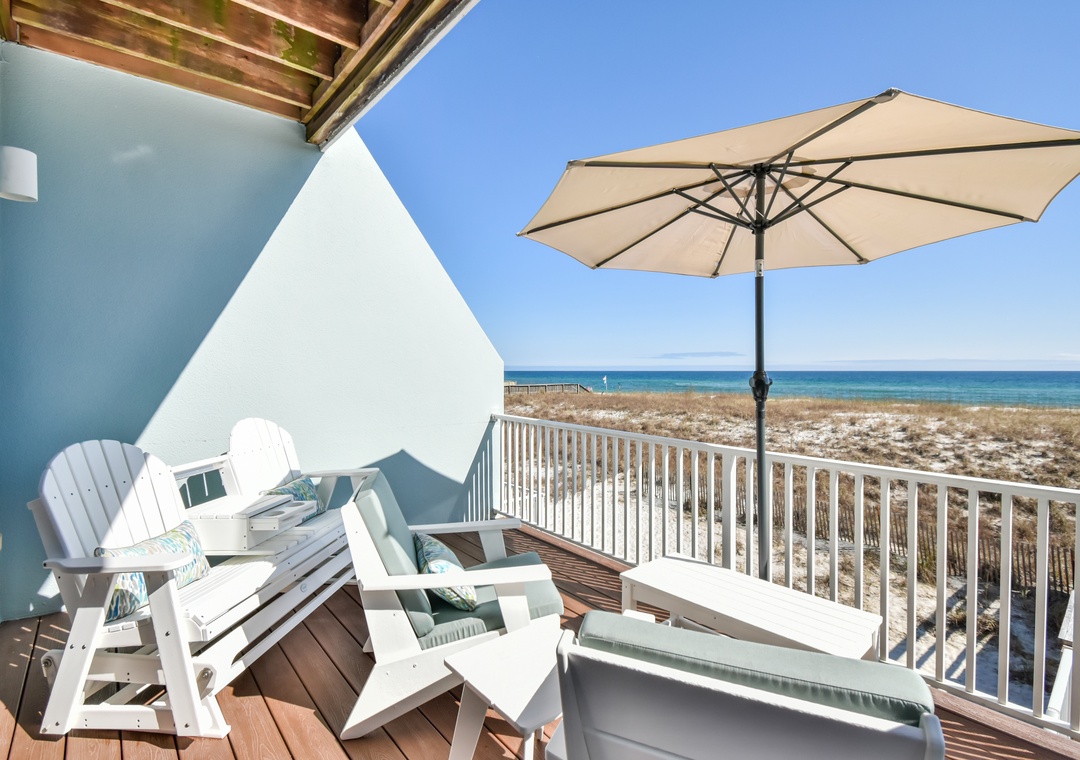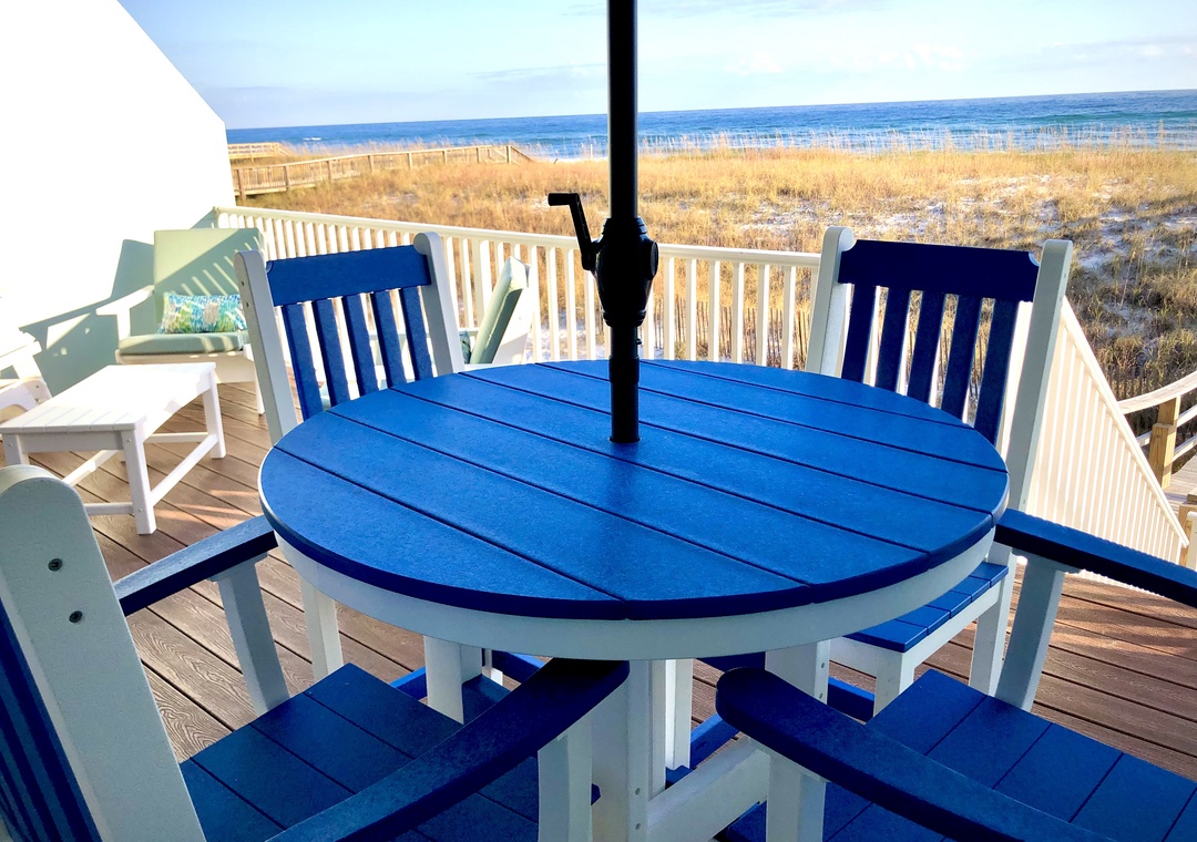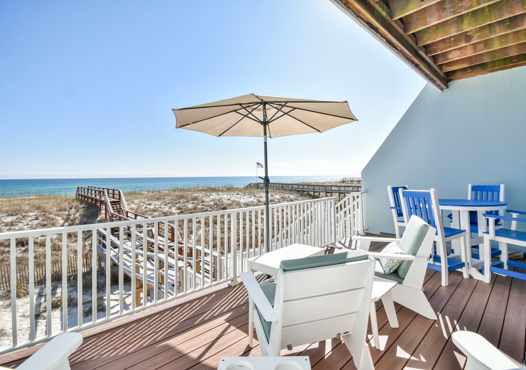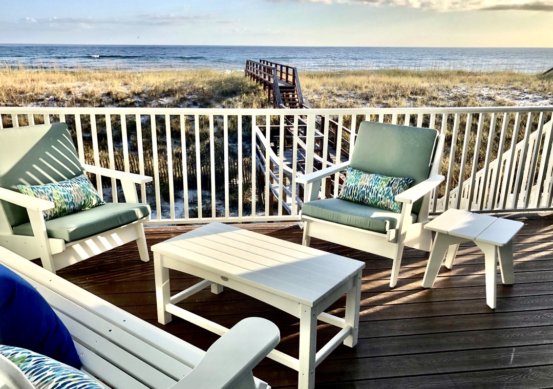 Sliders from the main floor great room open onto a large private deck with plenty of room for dining and sunbathing as well as a private dune cross-over leading directly to the Gulf.