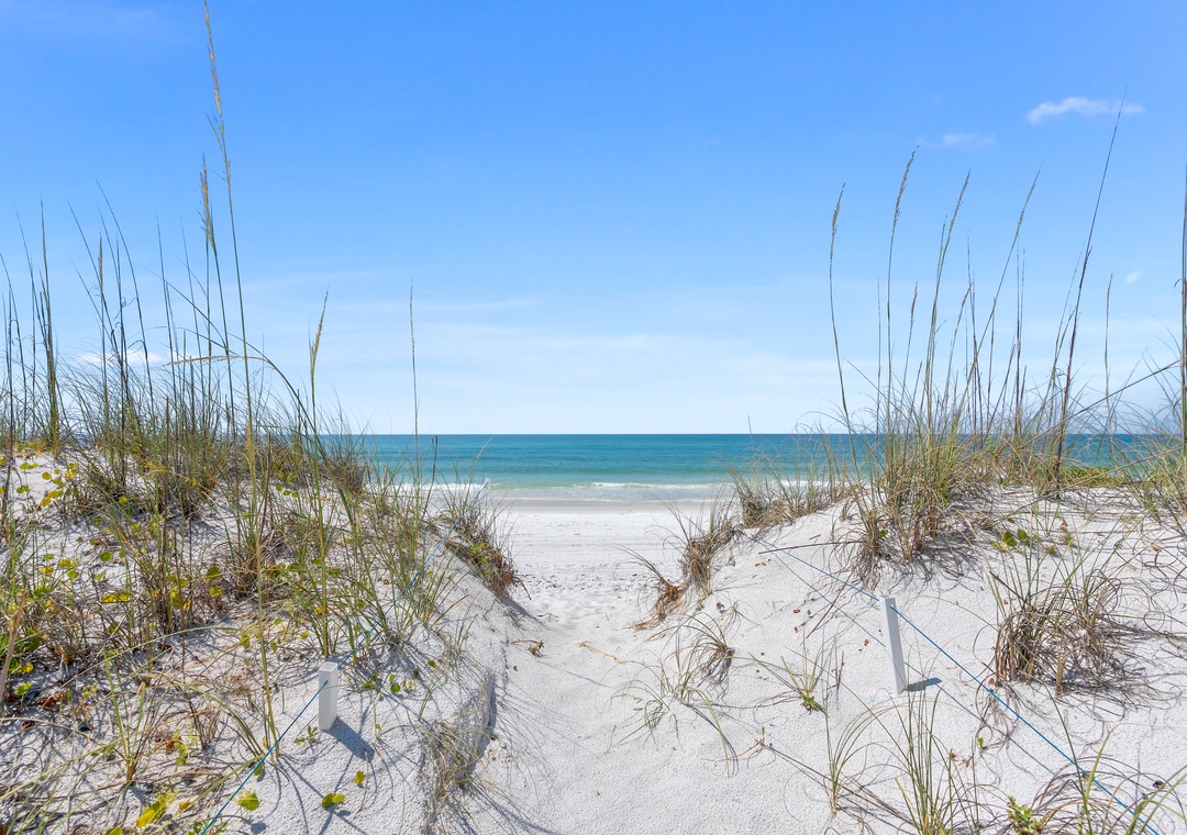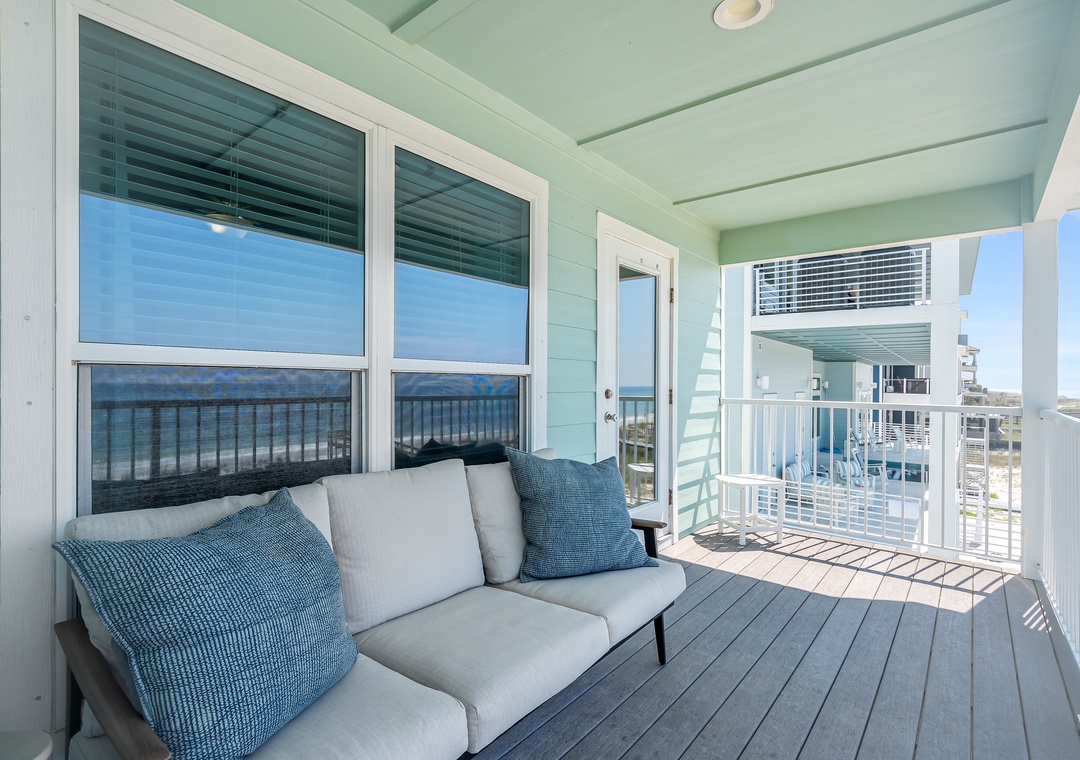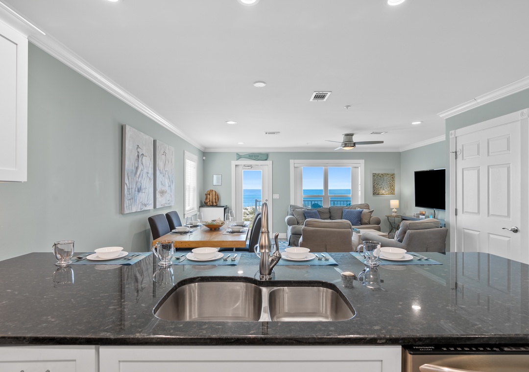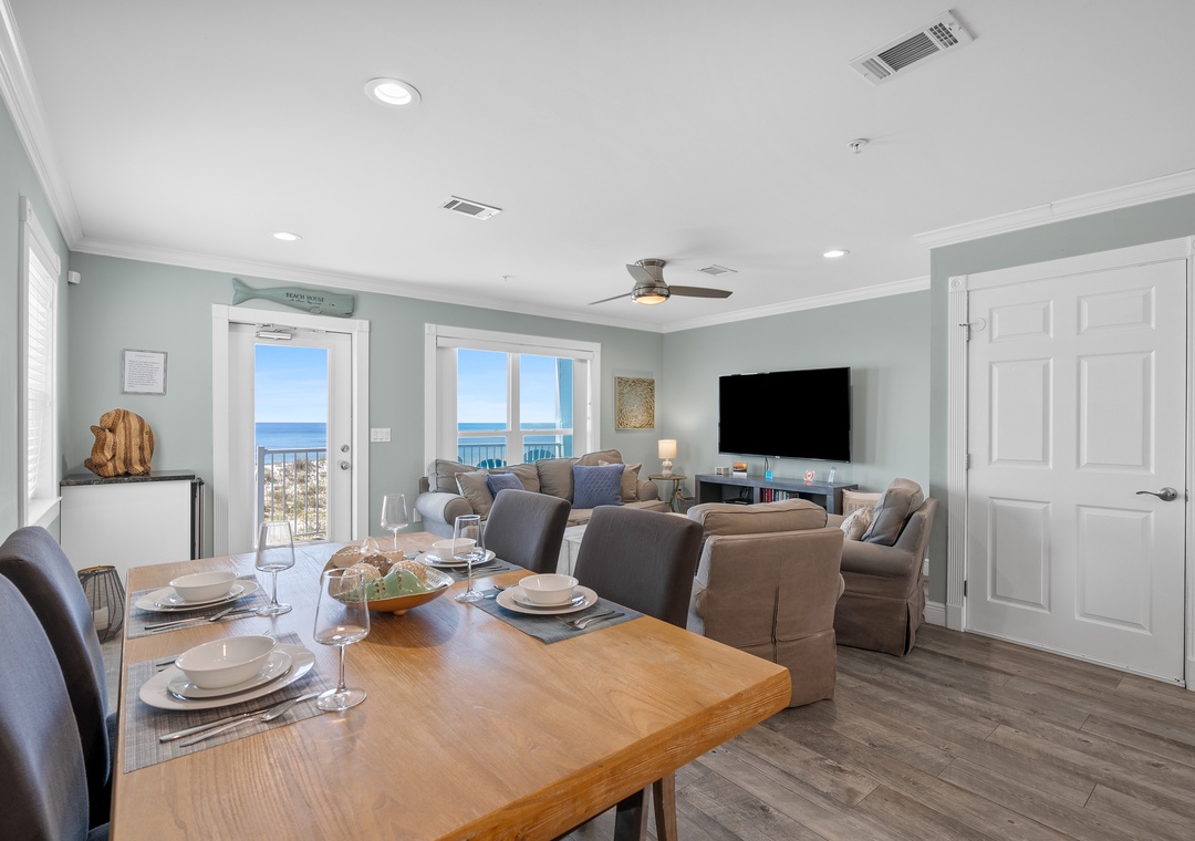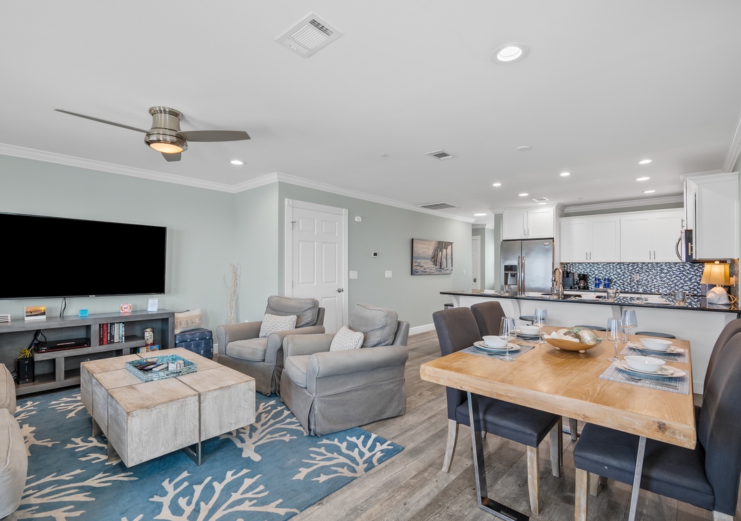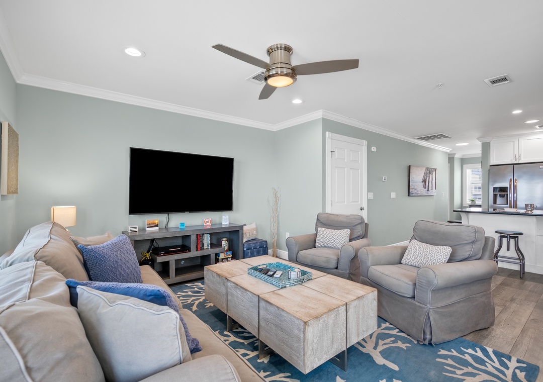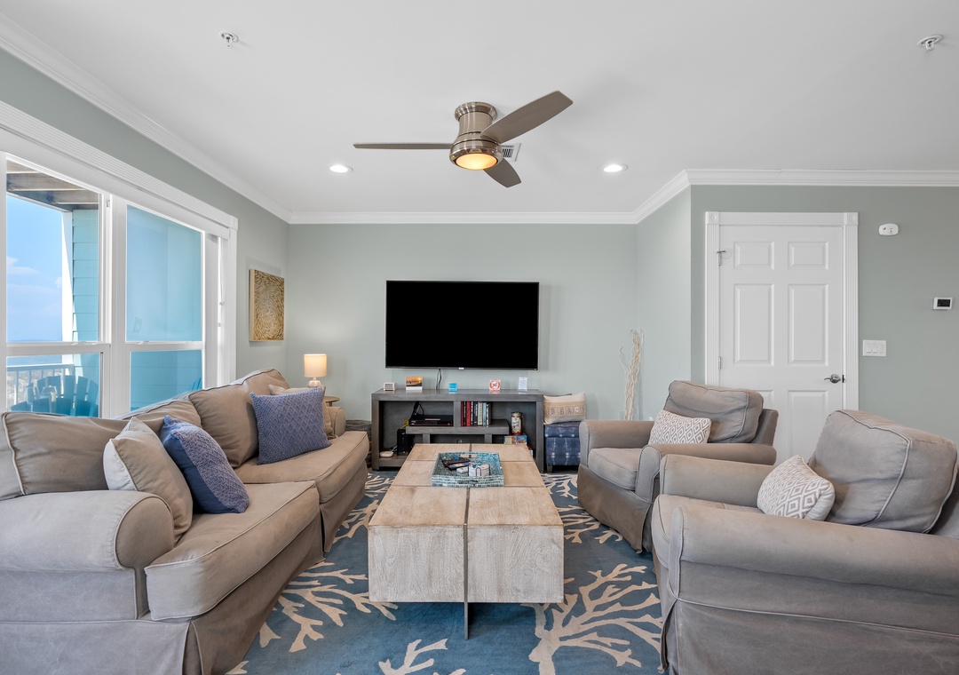 Bright & Airy Living Space: Step inside to a cozy, sunlit great room with stunning Gulf views. Gather around to watch your favorite streaming shows on the Smart TVs, or simply listen to the waves crash outside on the patio.