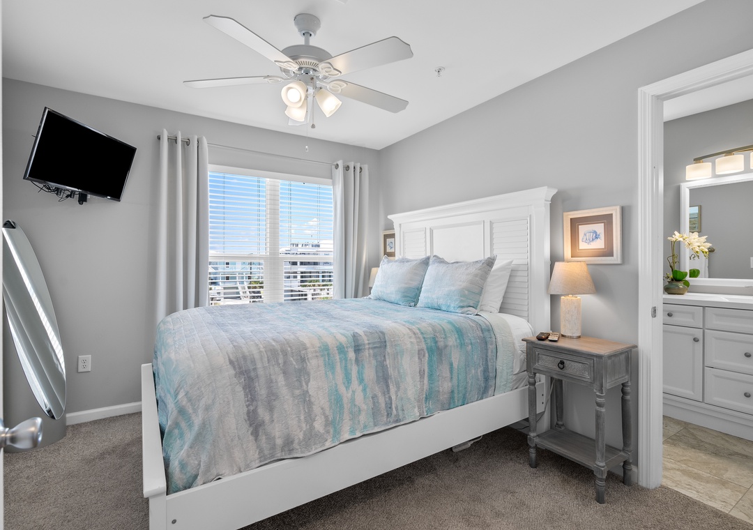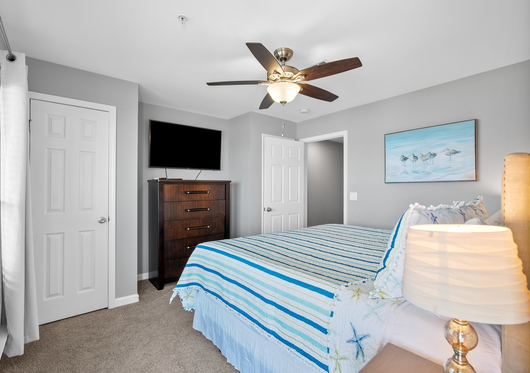 Queen Bedroom: Peaceful and cozy, with a Smart TV for entertainment.