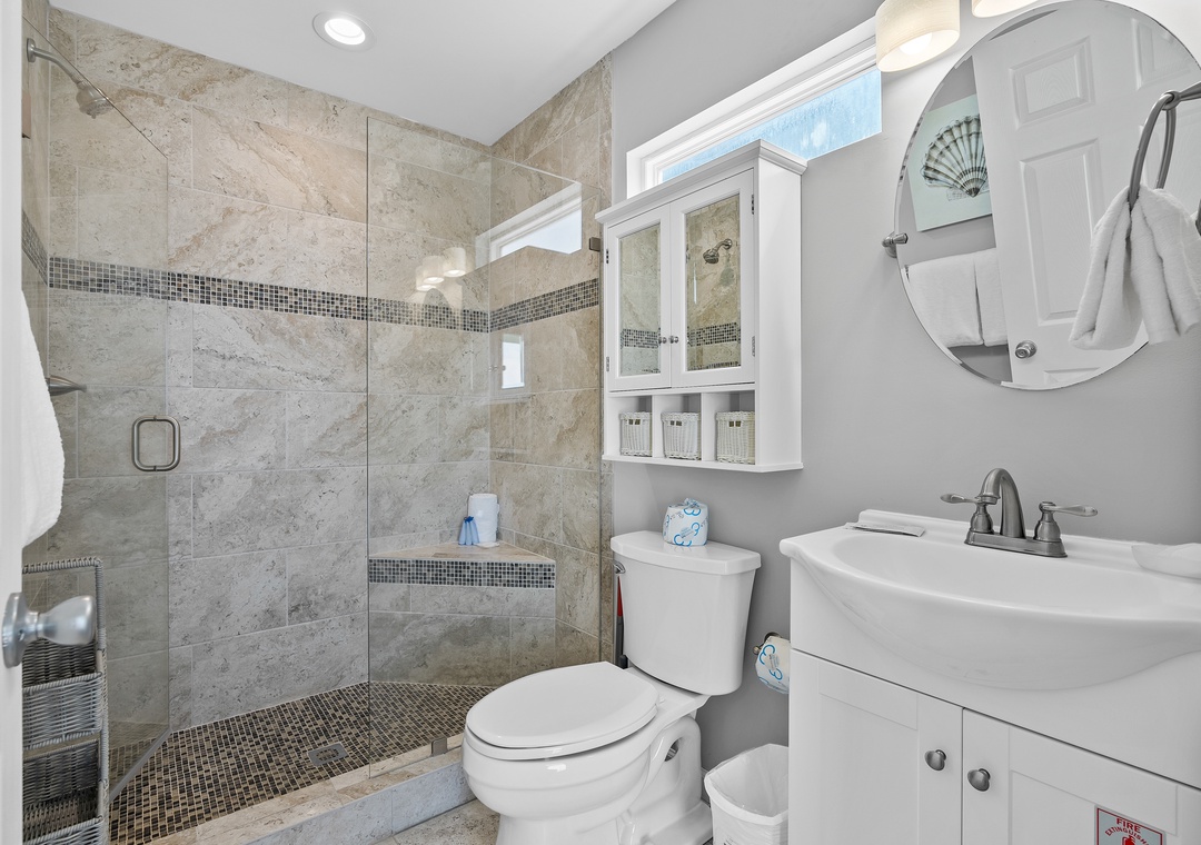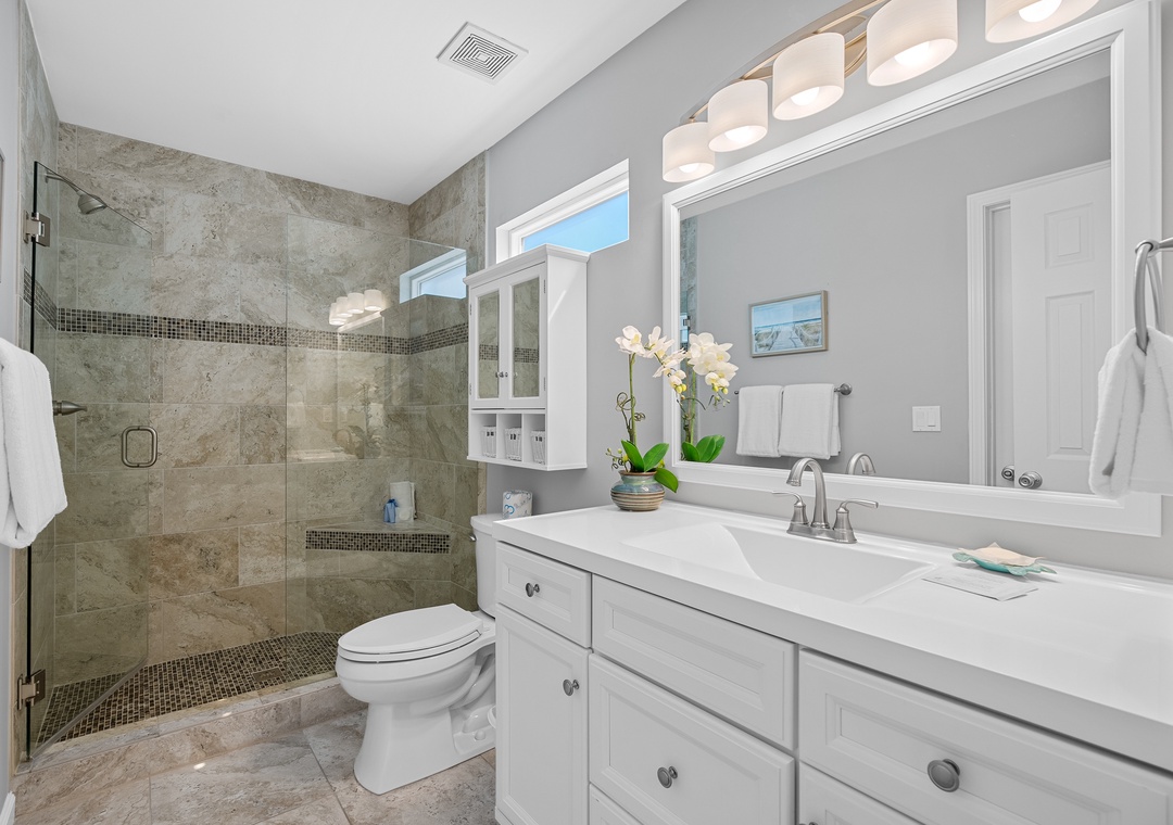 Jack & Jill Bath: Modern tiled walk-in shower, shared between the queen and bunk rooms.