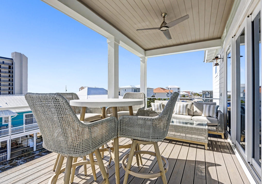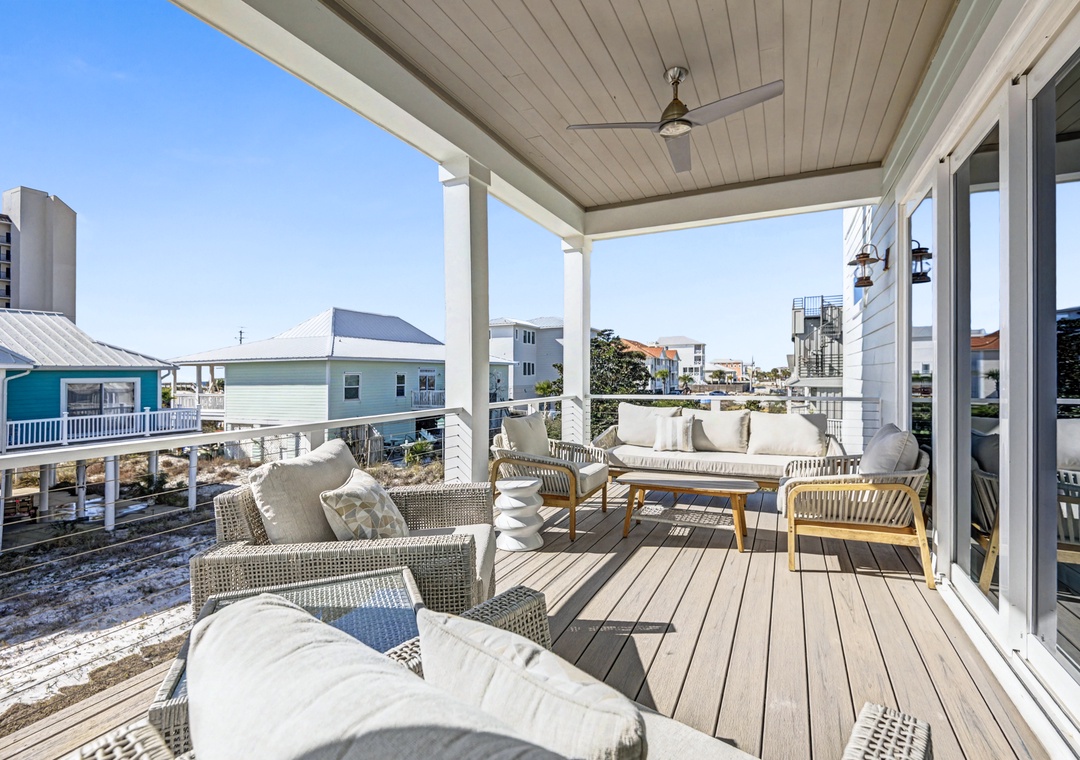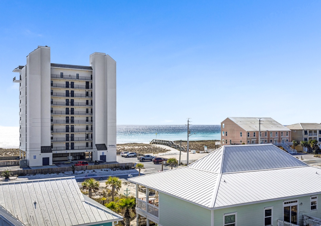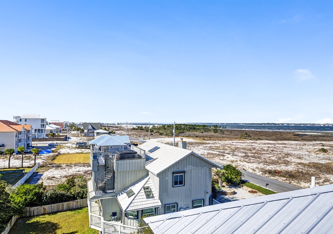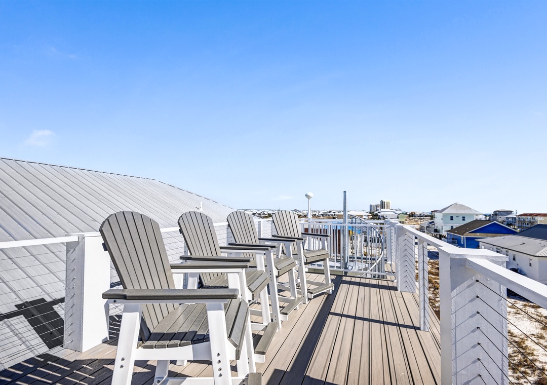 Take the elevator to any floor with ease, then step out to enjoy Gulf and dune views. Don't be scared to climb to the top to see the home’s standout feature—its spiral staircase leading to a prime rooftop viewing platform, offering panoramic scenery over the surrounding homes.