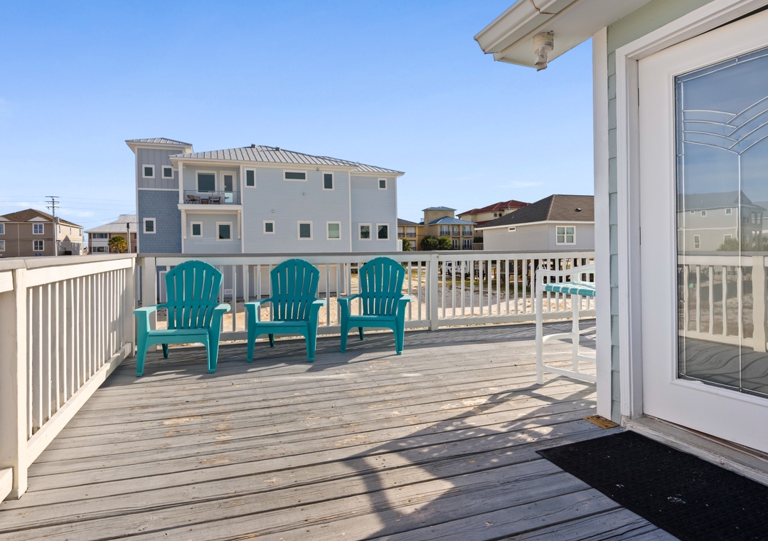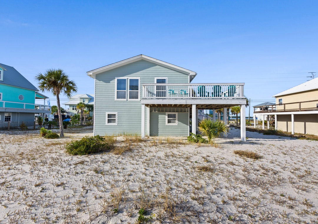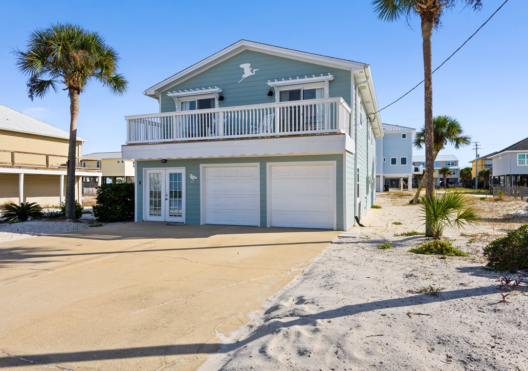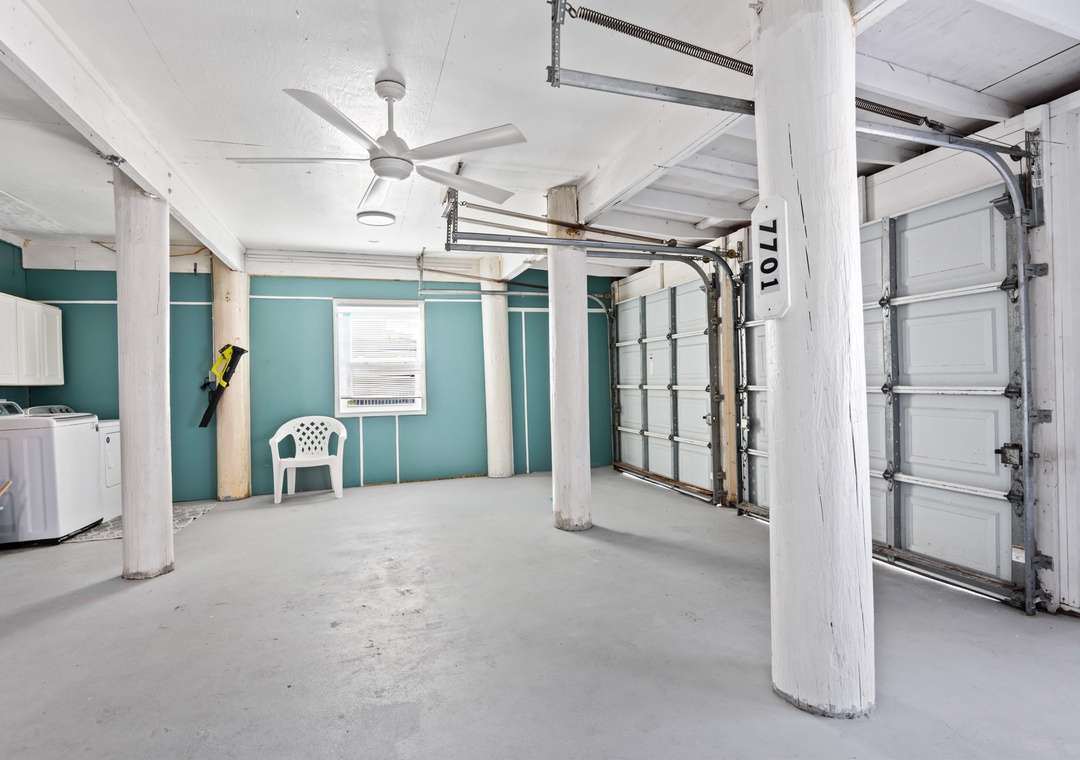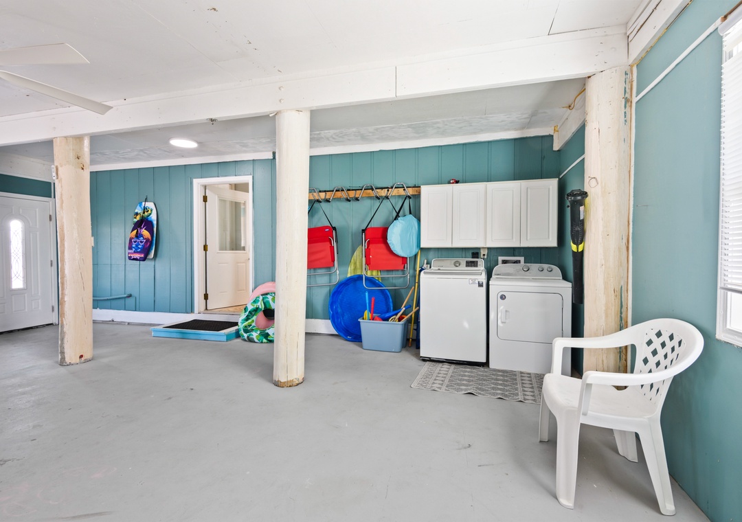 The ground floor includes two guest bedrooms with queen-sized beds. Upstairs, the primary suite offers a king bed and a sleeper sofa in the living room. In the garage, you will find beach gear and a full-size washer/dryer for your convenience. Fire up the propane grill for family meals and enjoy the coastal breeze.