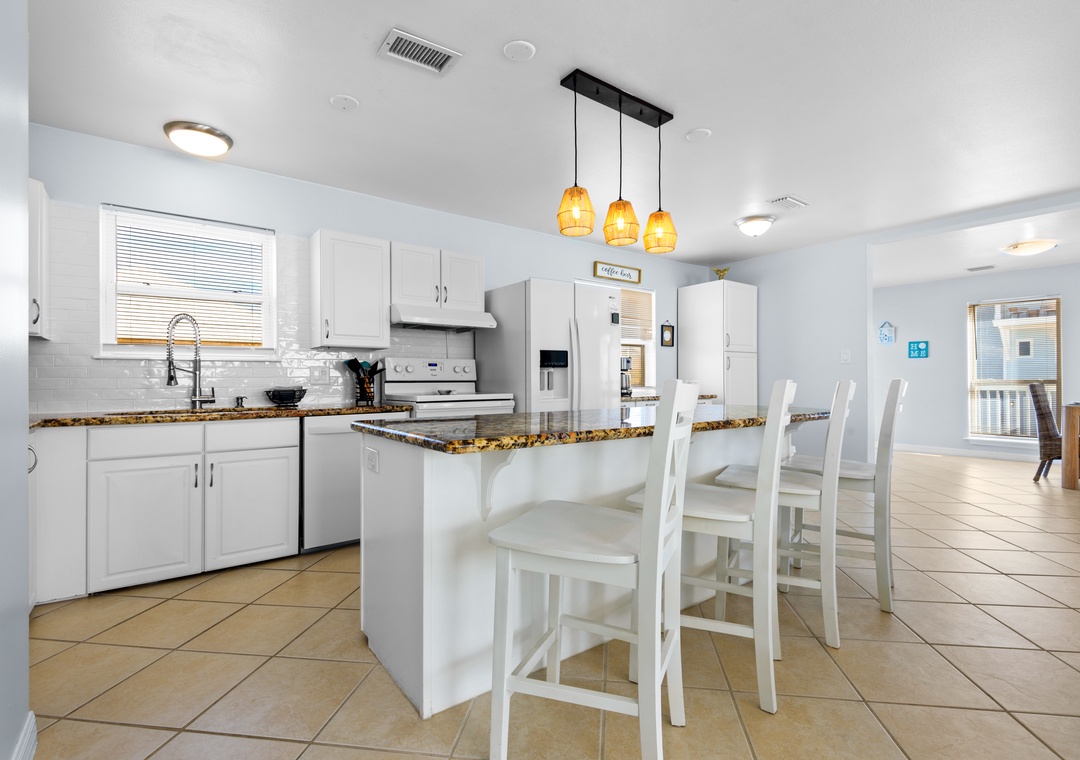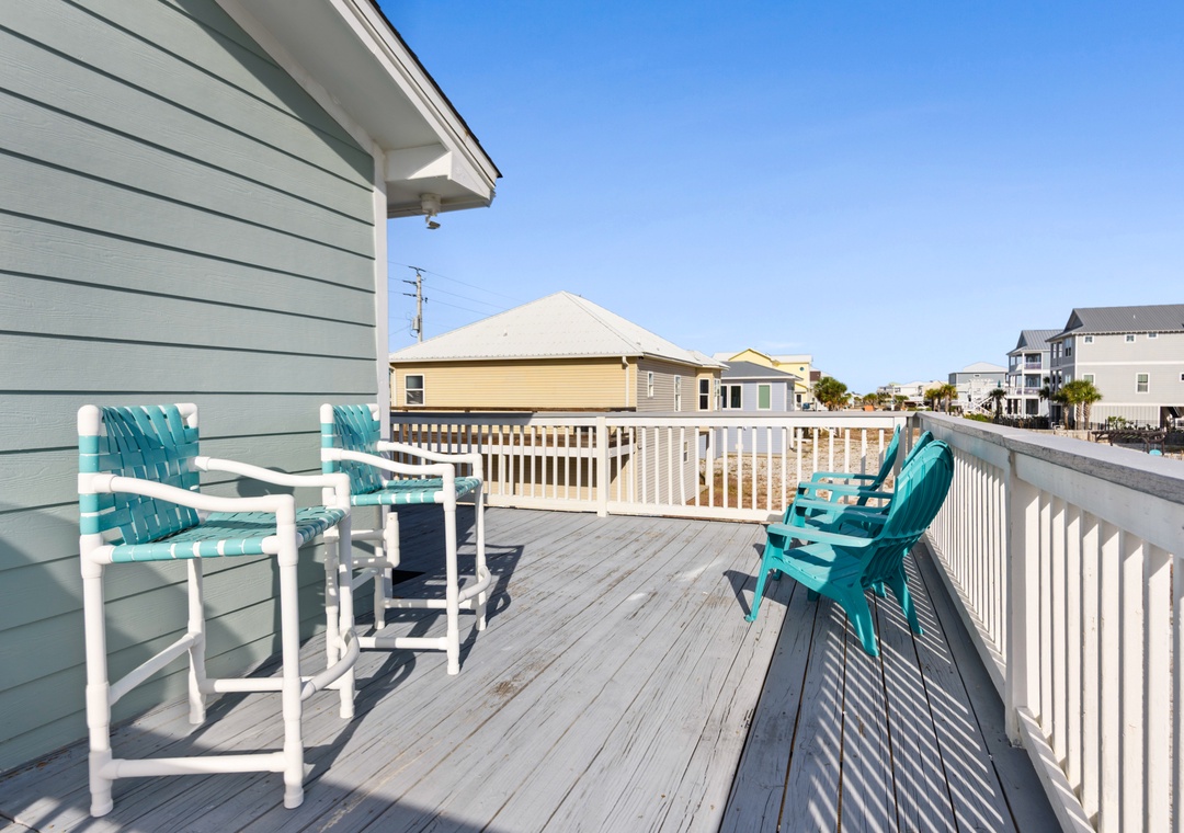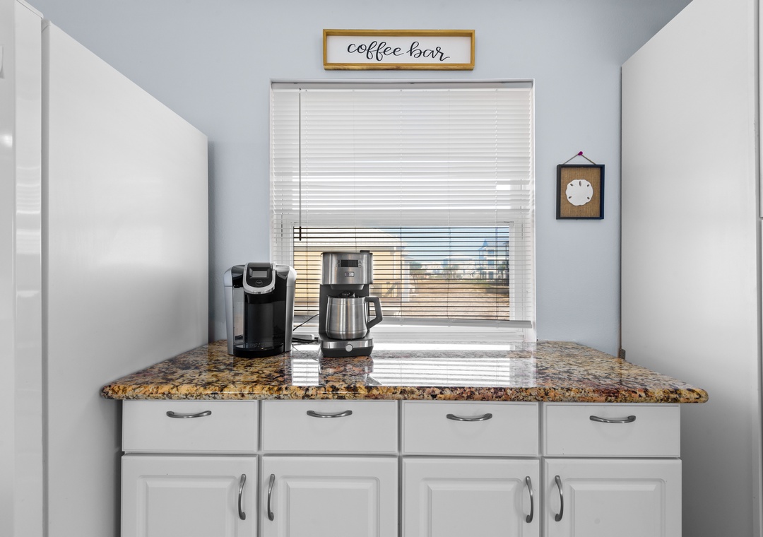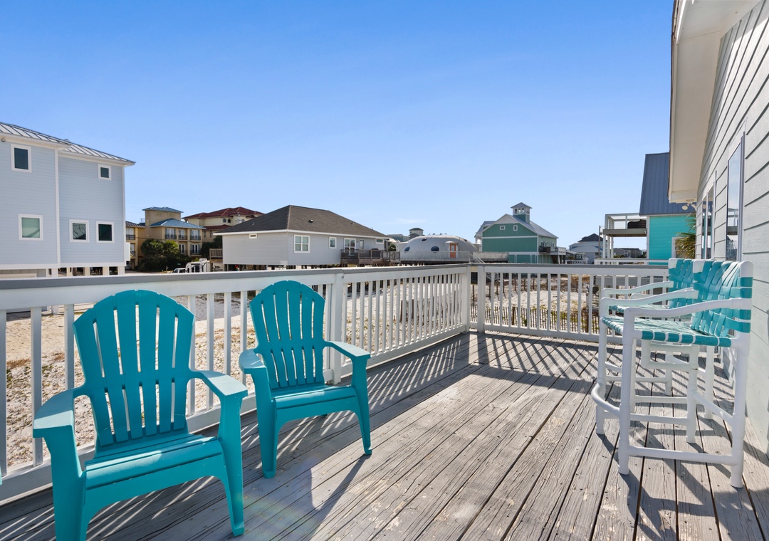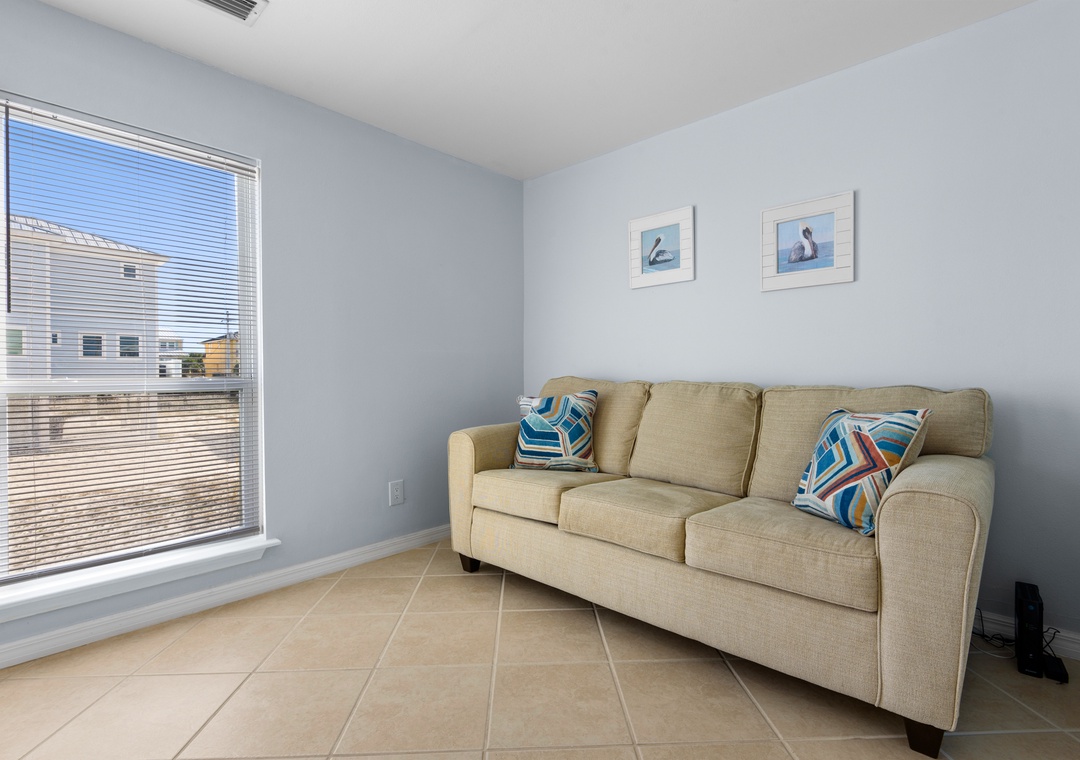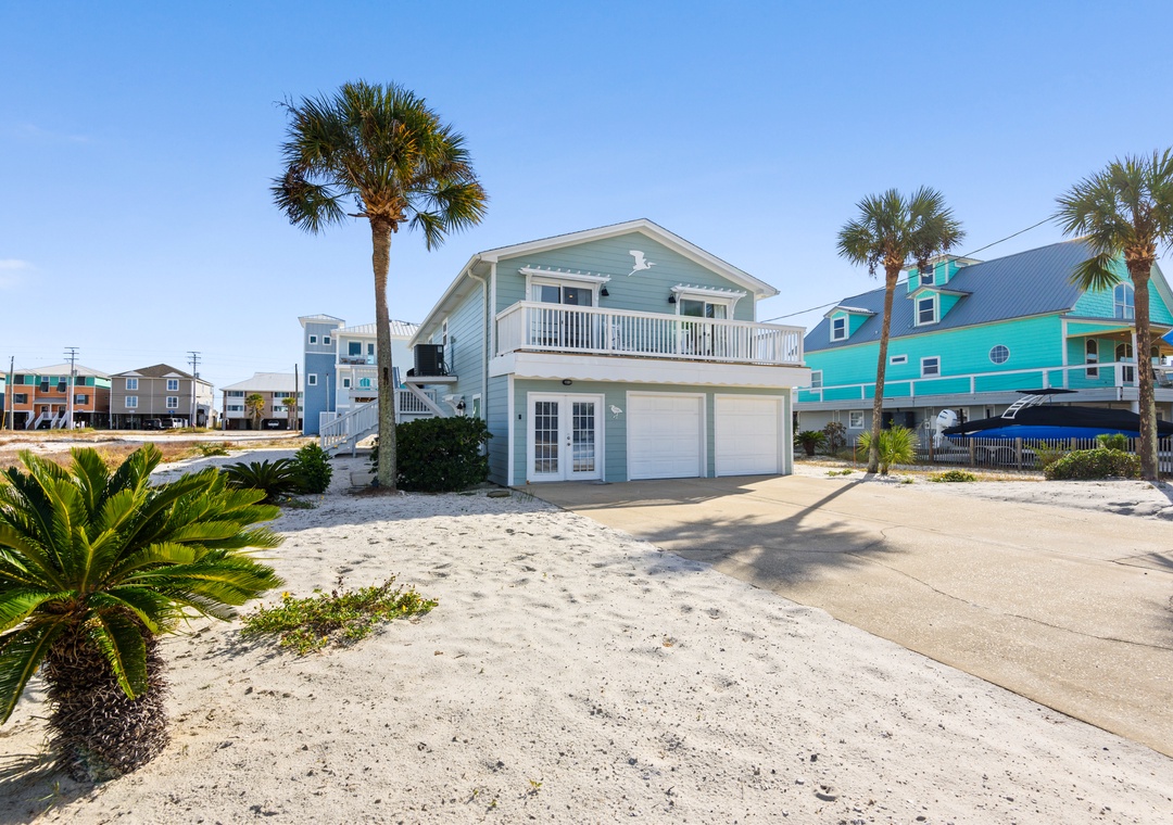 The ground floor includes two guest bedrooms with queen-sized beds. Upstairs, the primary suite offers a king bed and a sleeper sofa in the living room. In the garage, you will find beach gear and a full-size washer/dryer for your convenience. Fire up the propane grill for family meals and enjoy the coastal breeze.