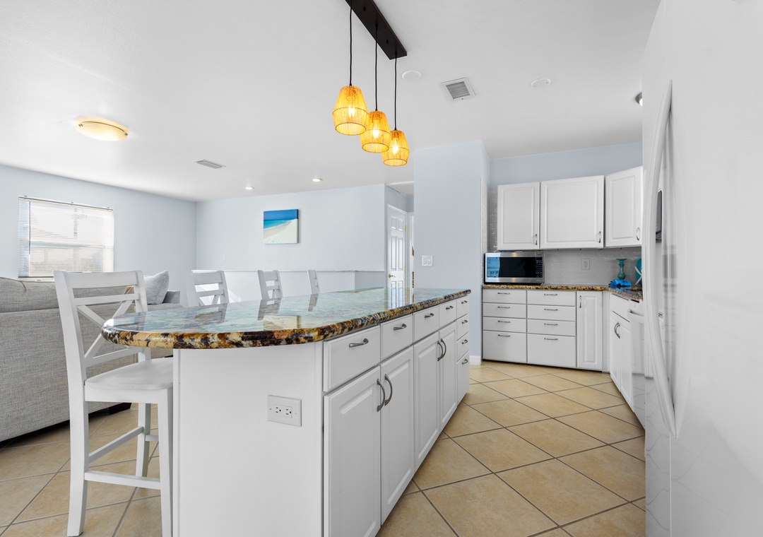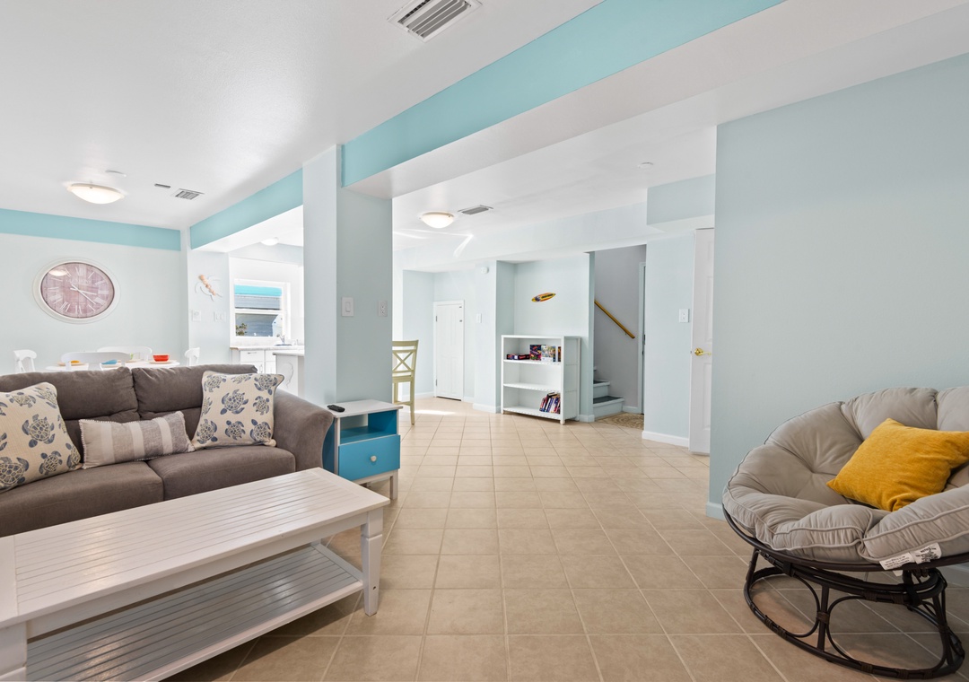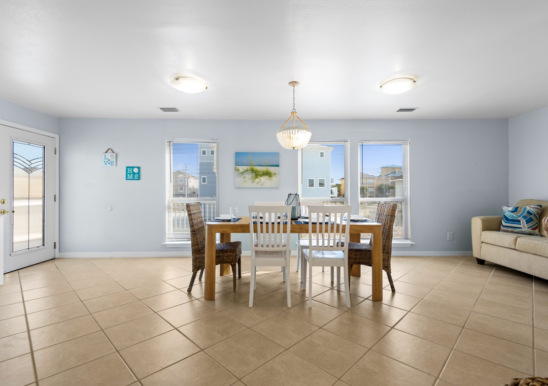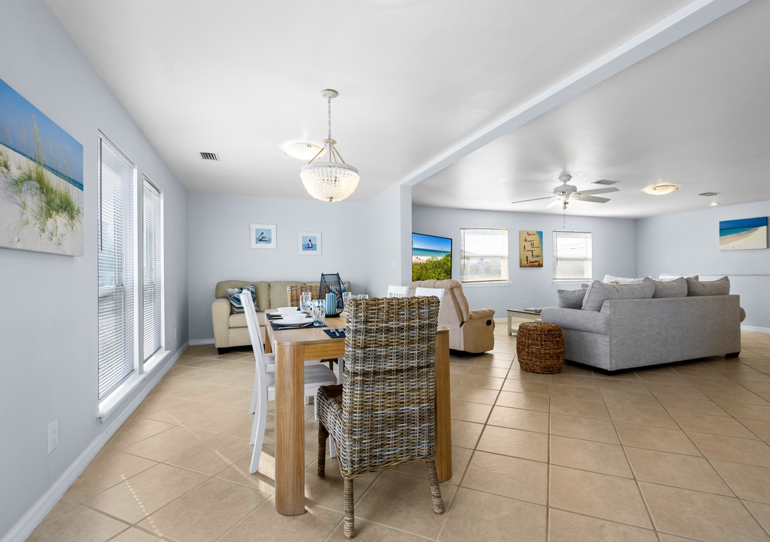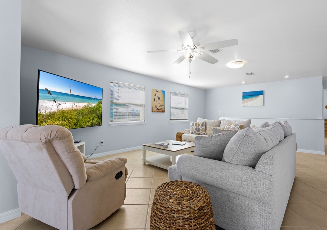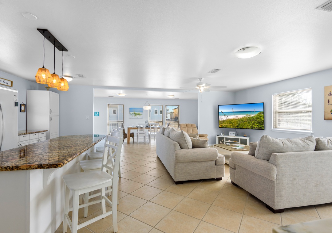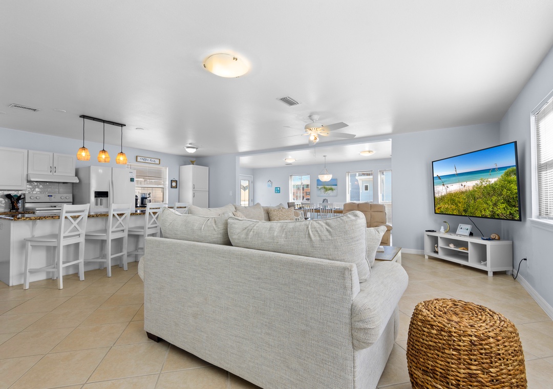 Welcome to Luna Sea, the perfect vacation spot for families, only a short walk from the sugar-white sands of the Gulf! This 3-bedroom, 2-bath vacation home features an inviting open-concept layout with cozy living room seating, a kitchen island, a dining area, and a fully equipped kitchen, perfect for relaxing after a day on the beach.