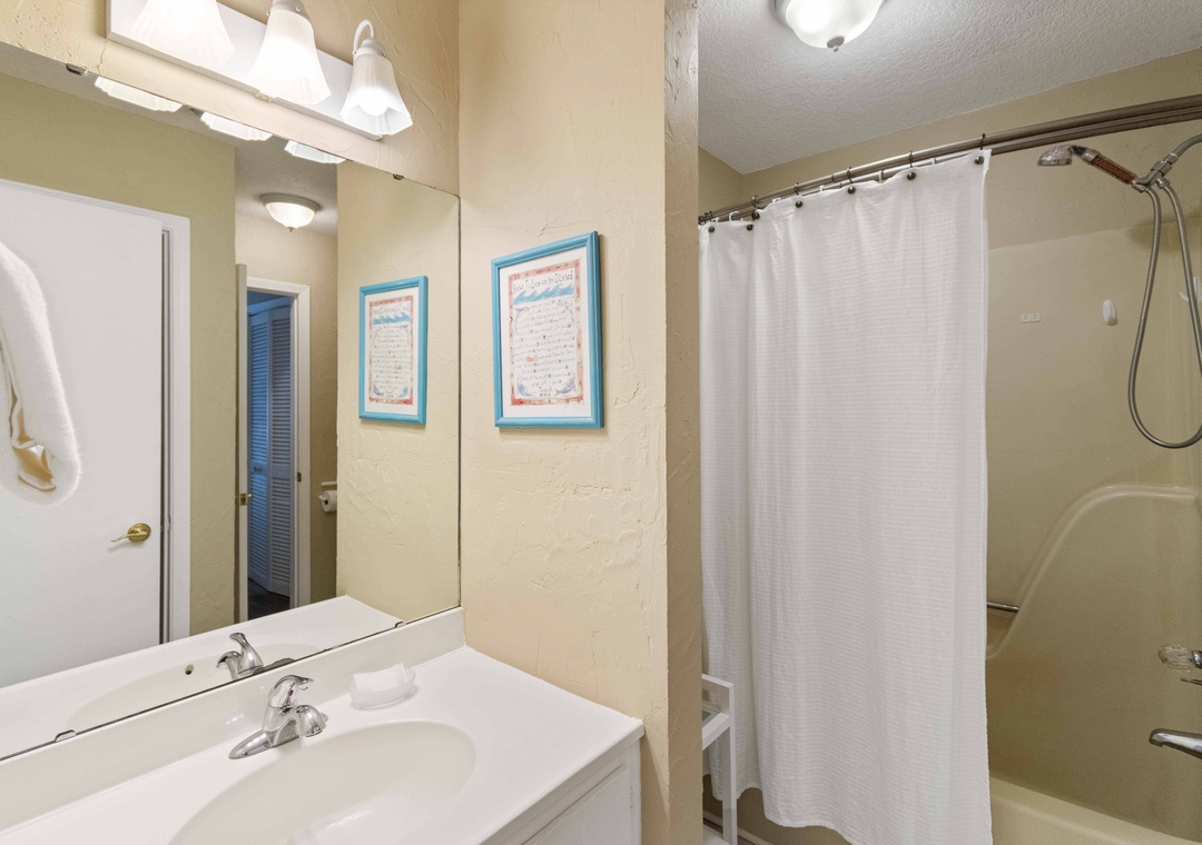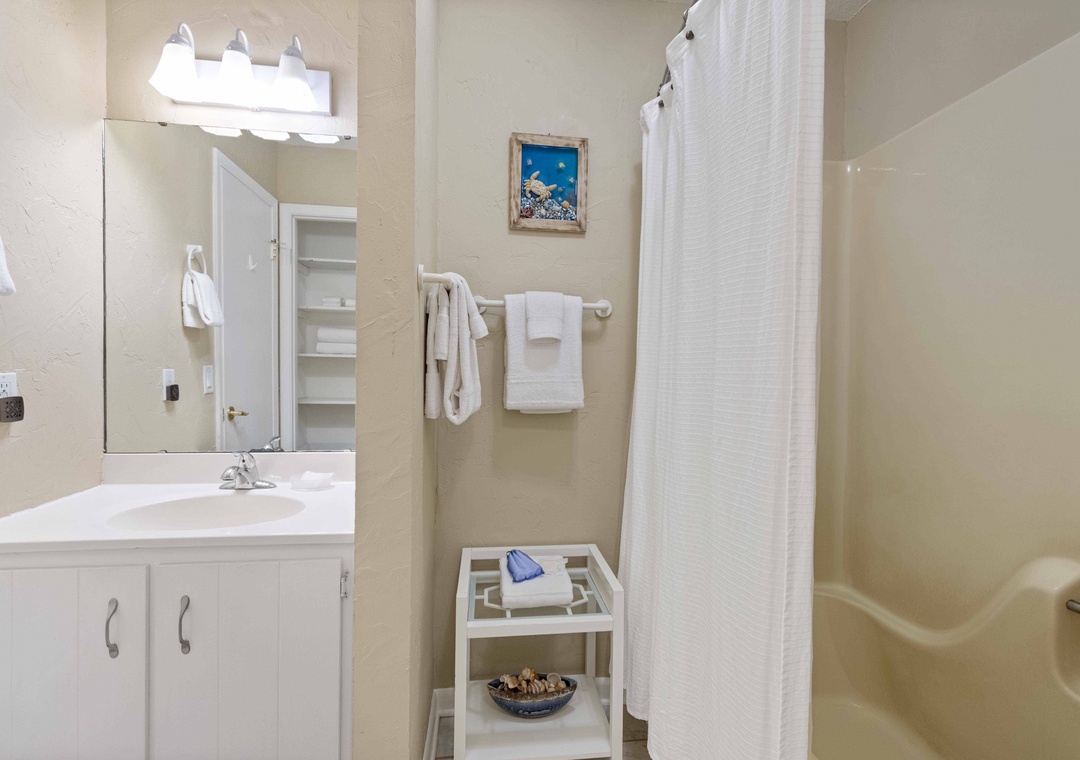 There is a full bath in between and an extra sink in the primary Gulf view bedroom.