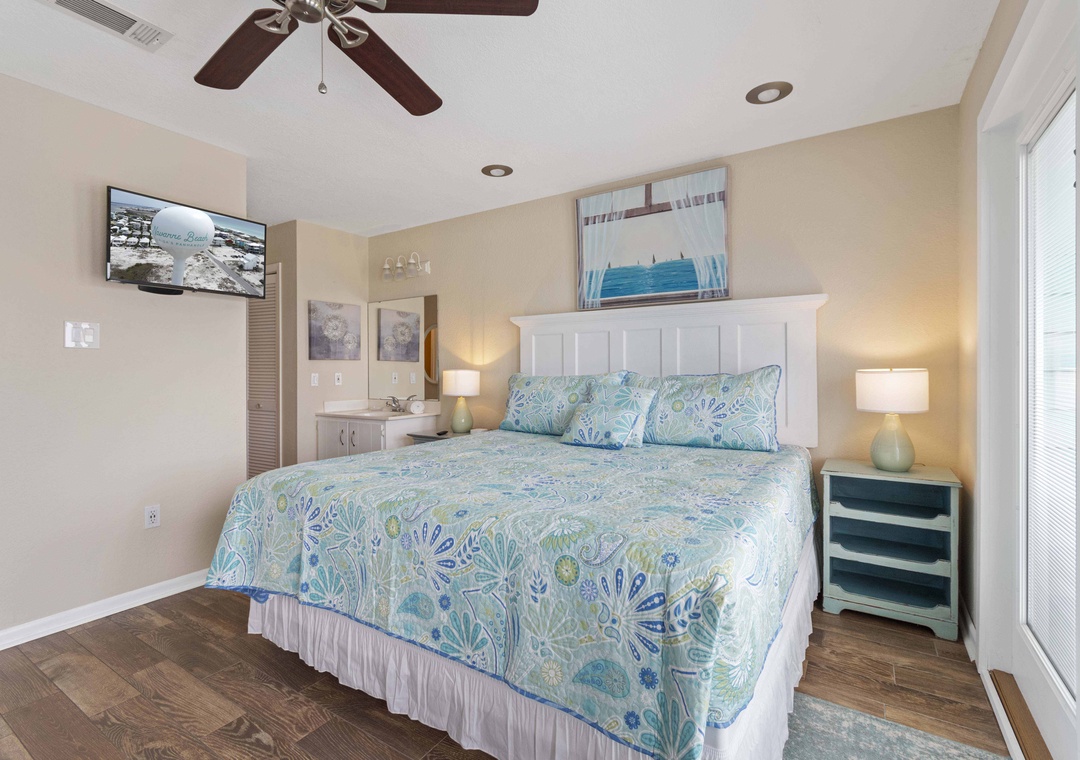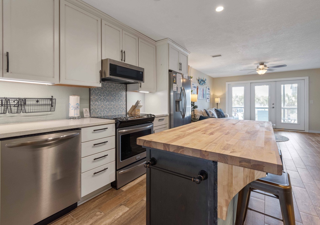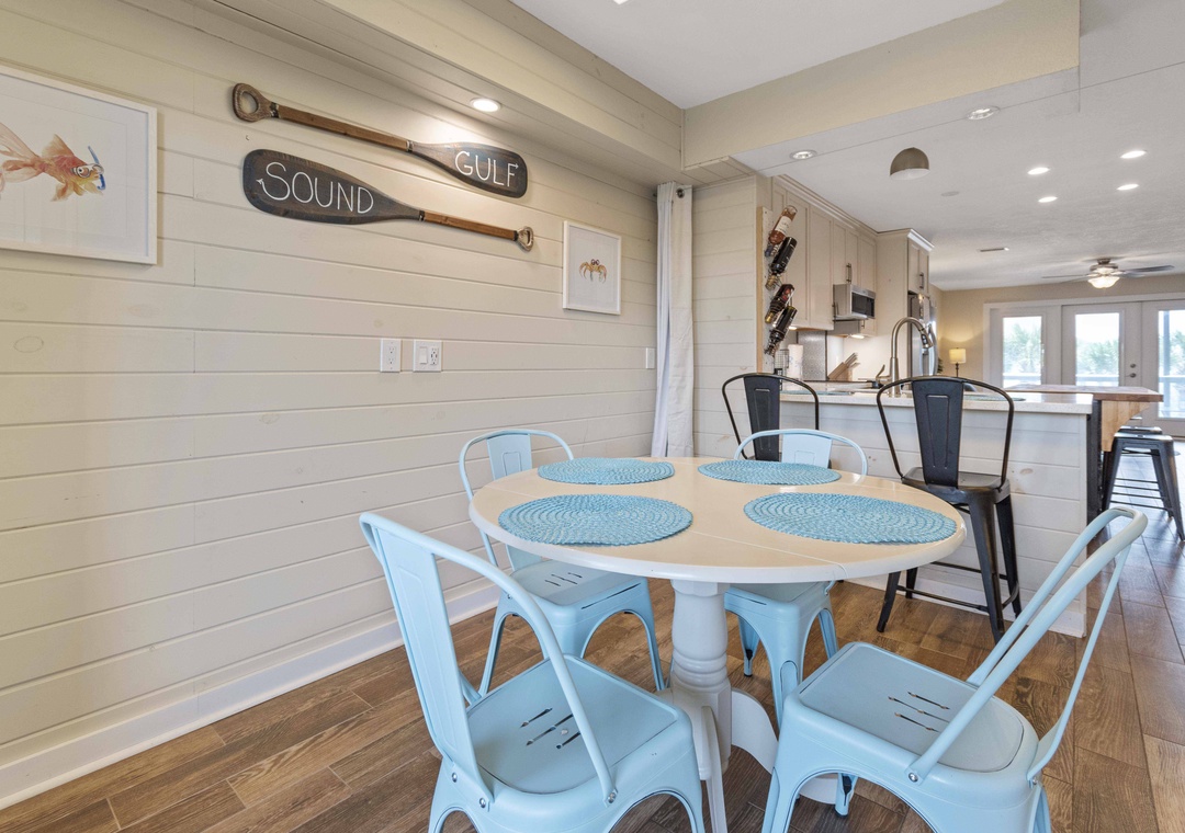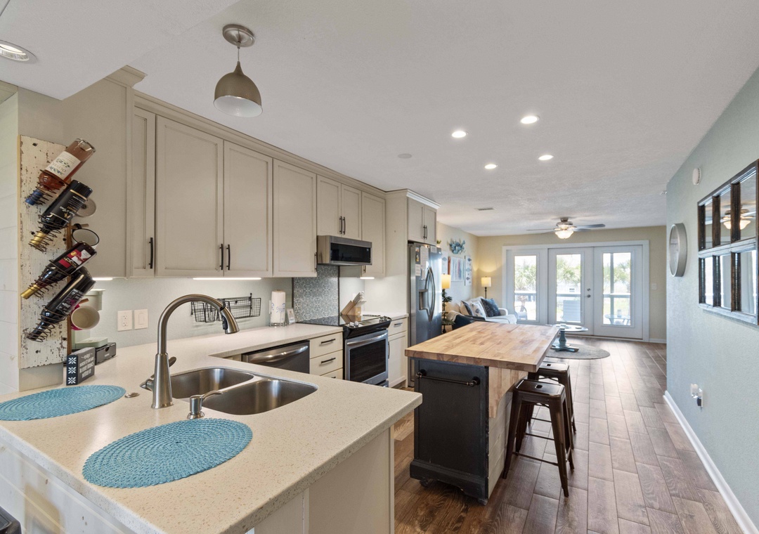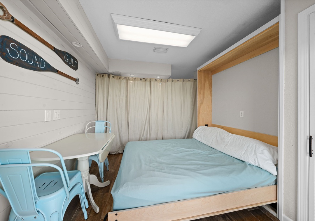 The open concept main floor has a large flat screen TV and comfy furniture (the couch is also a sleeper). The deck off the living area has a Gulf view and is a great spot to relax out of the sun. The well equipped kitchen has everything you’ll need for all kinds of meal prepping. There is a center island seating 3, a breakfast bar seating 2 and a dining table that fits 4 more. The deck off the kitchen affords Santa Rosa Sound views and is another relaxing spot out of the sun. There is also a full sized murphy bed here that will sleep 2 more.
