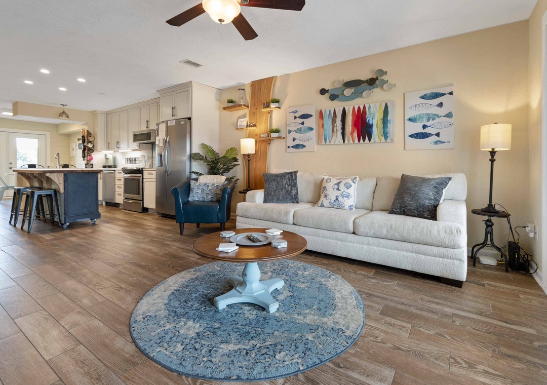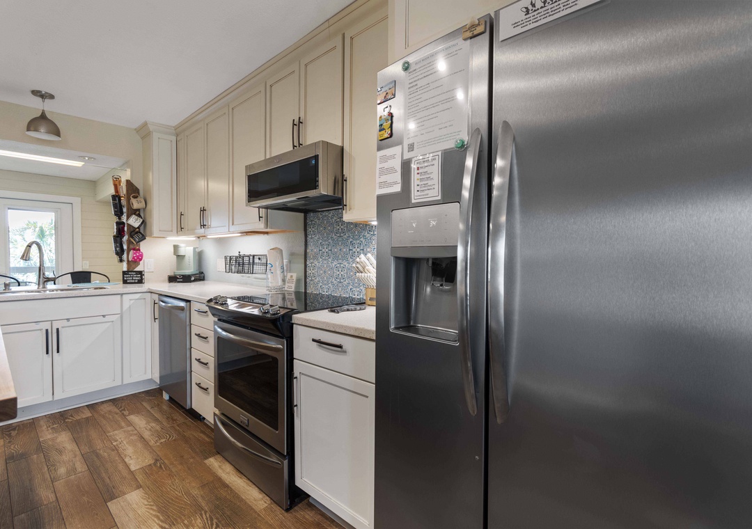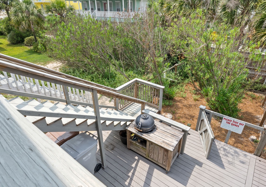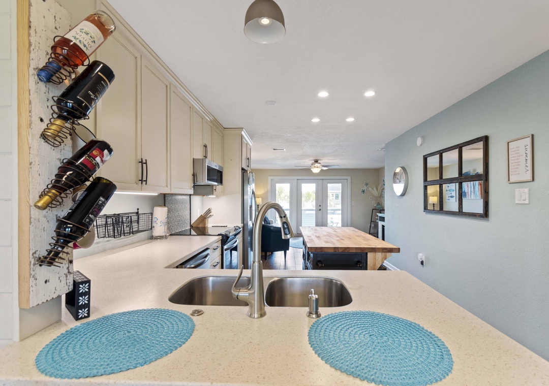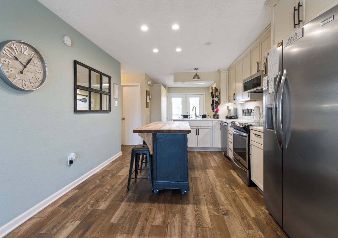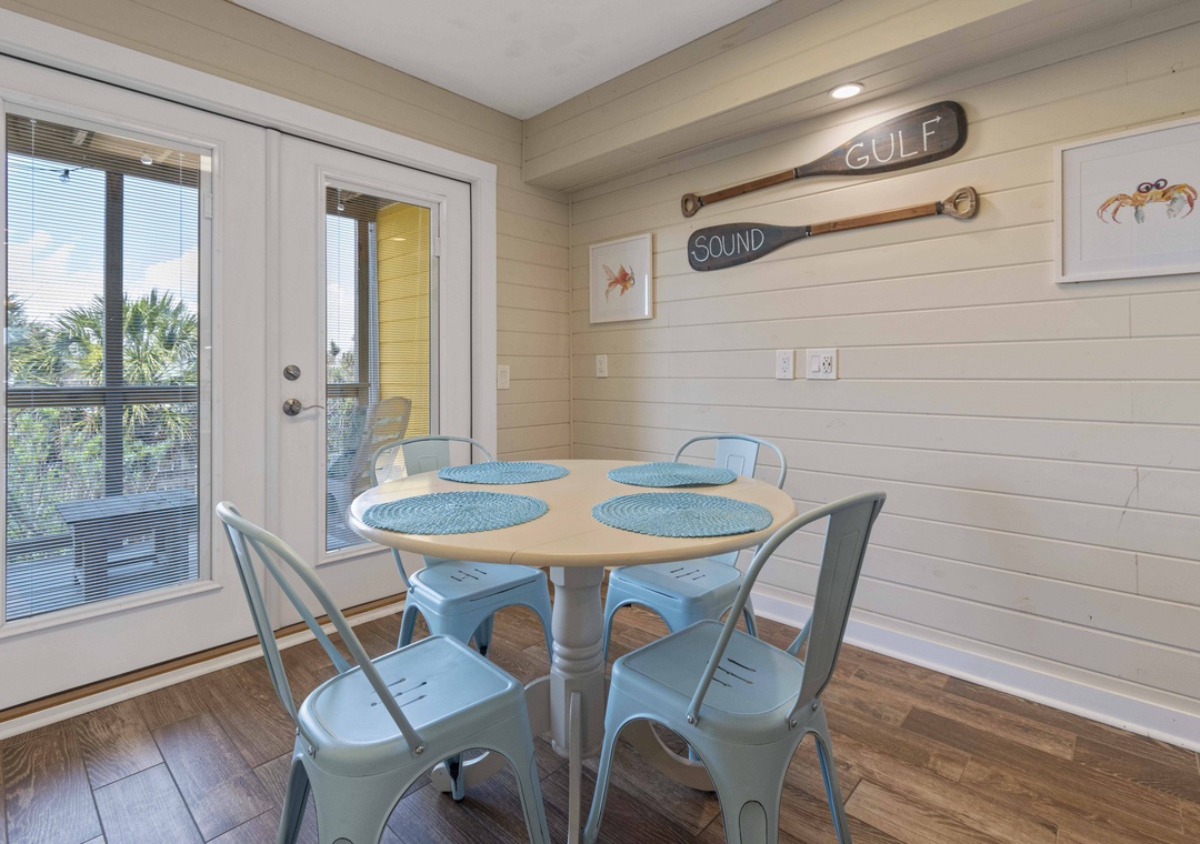 The open concept main floor has a large flat screen TV and comfy furniture (the couch is also a sleeper). The deck off the living area has a Gulf view and is a great spot to relax out of the sun. The well equipped kitchen has everything you’ll need for all kinds of meal prepping. There is a center island seating 3, a breakfast bar seating 2 and a dining table that fits 4 more. The deck off the kitchen affords Santa Rosa Sound views and is another relaxing spot out of the sun. There is also a full sized murphy bed here that will sleep 2 more.