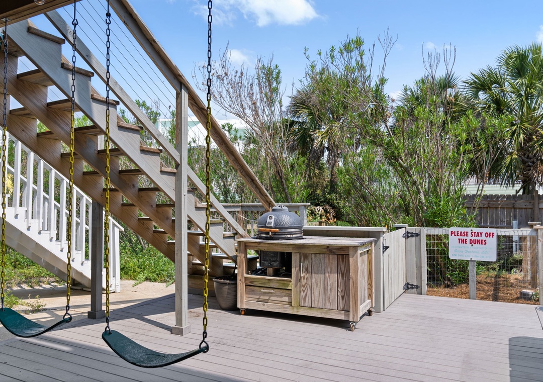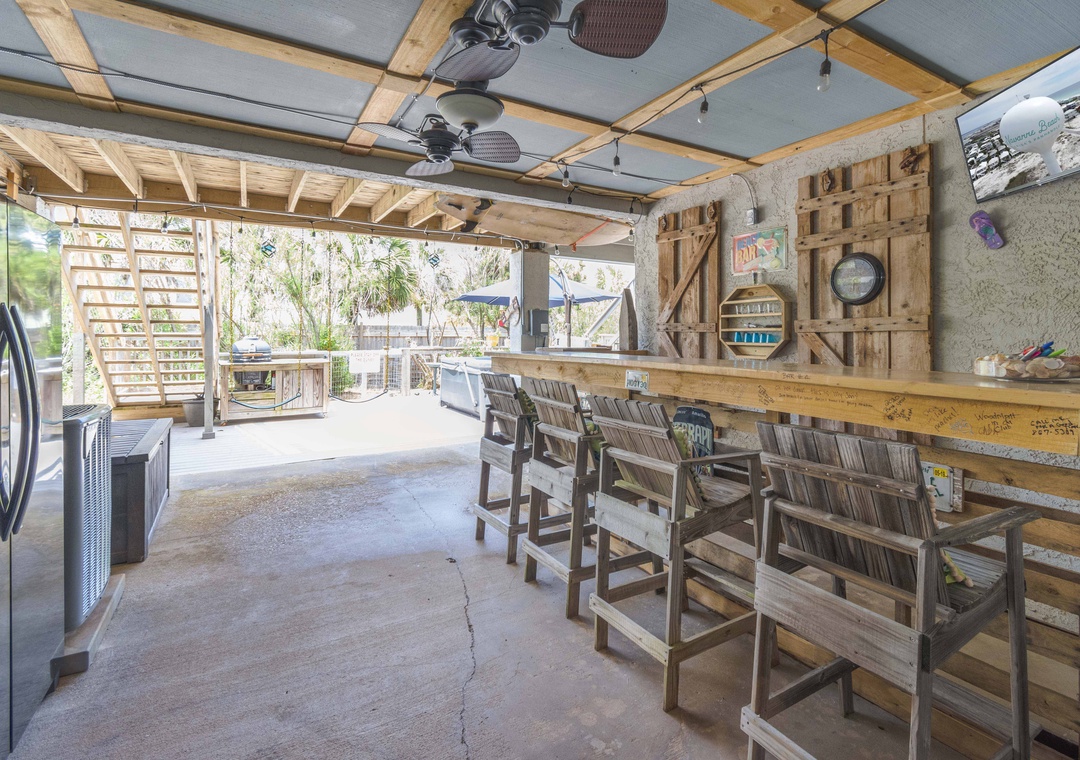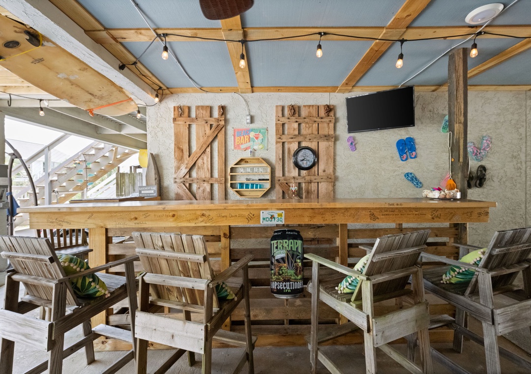 Under the house is the perfect gathering spot to have a cold one. Belly up to the large bar with flat screen TV, full fridge with ice maker, bar seating, 2 swings and charcoal green egg grill.