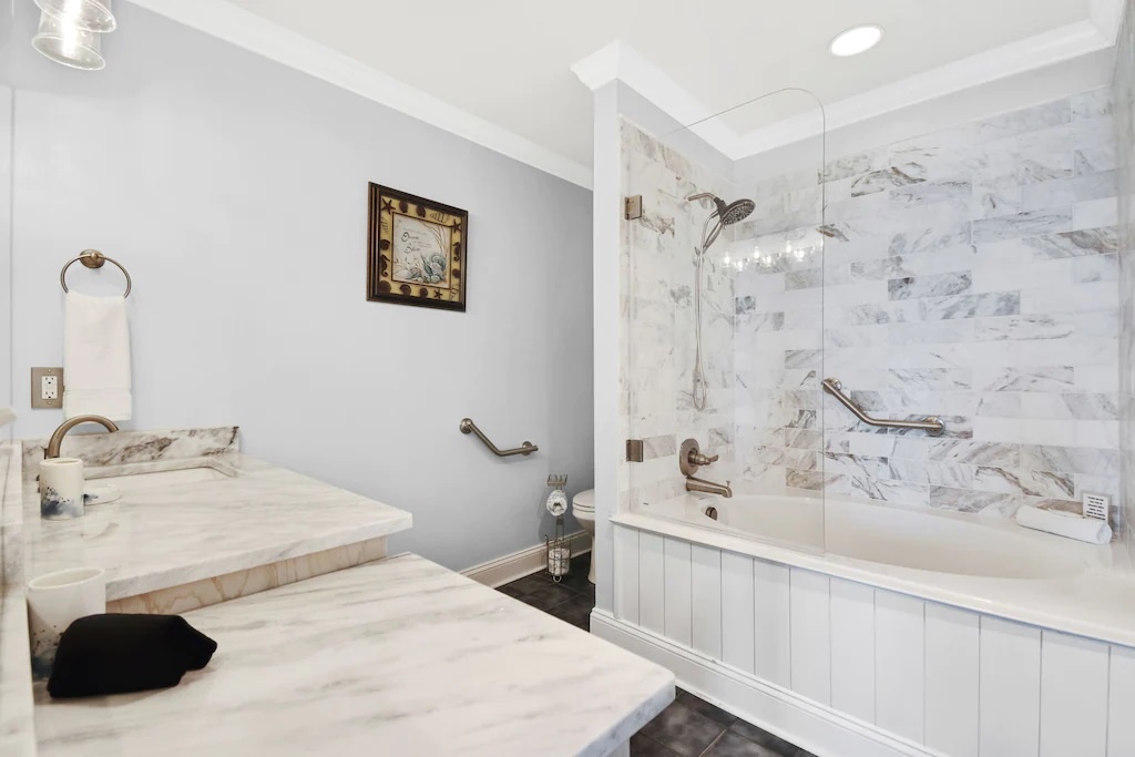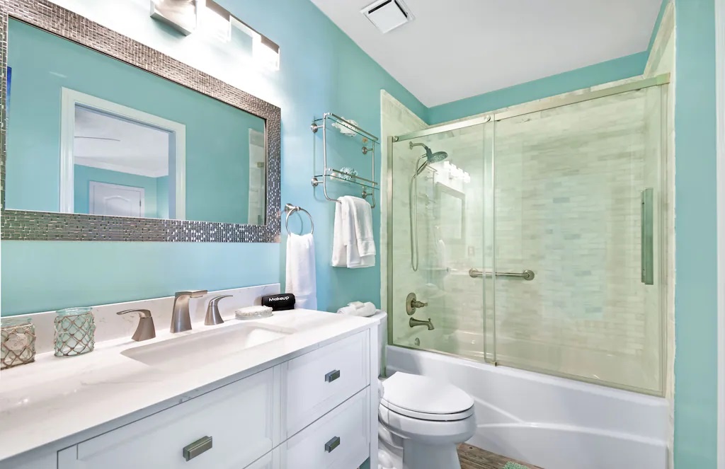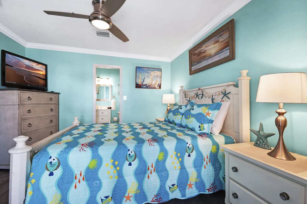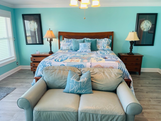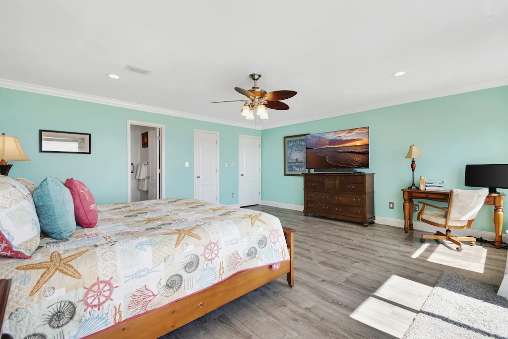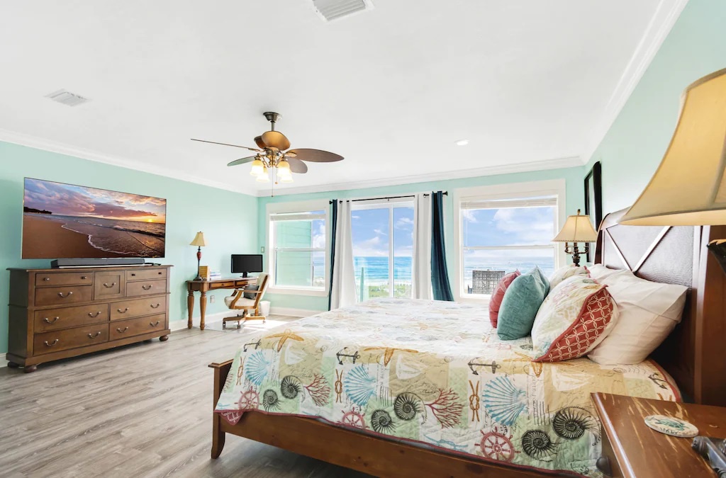 Go up one flight, and take in more breathtaking emerald water views from the enormous king-sized primary bedroom. The luxury en suite bath features a jetted tub, the perfect spot to soak after a long day of beach combing. as well as a large tiled walk in shower.