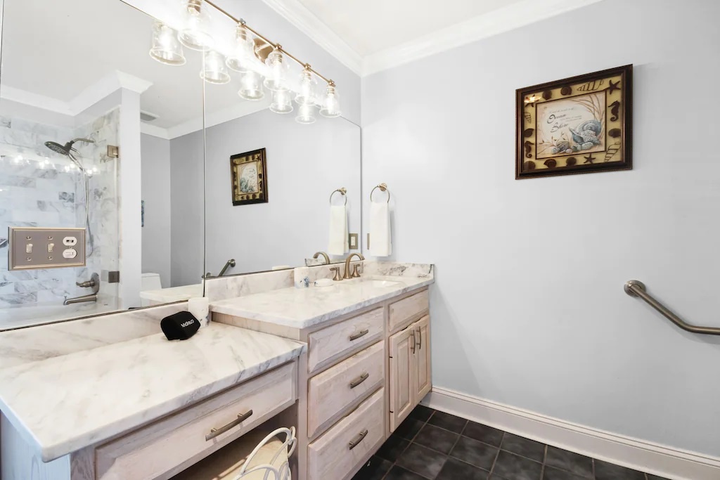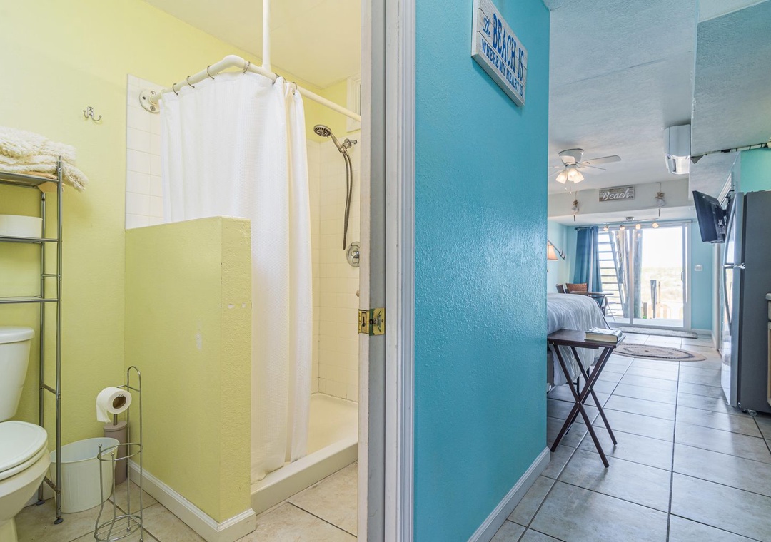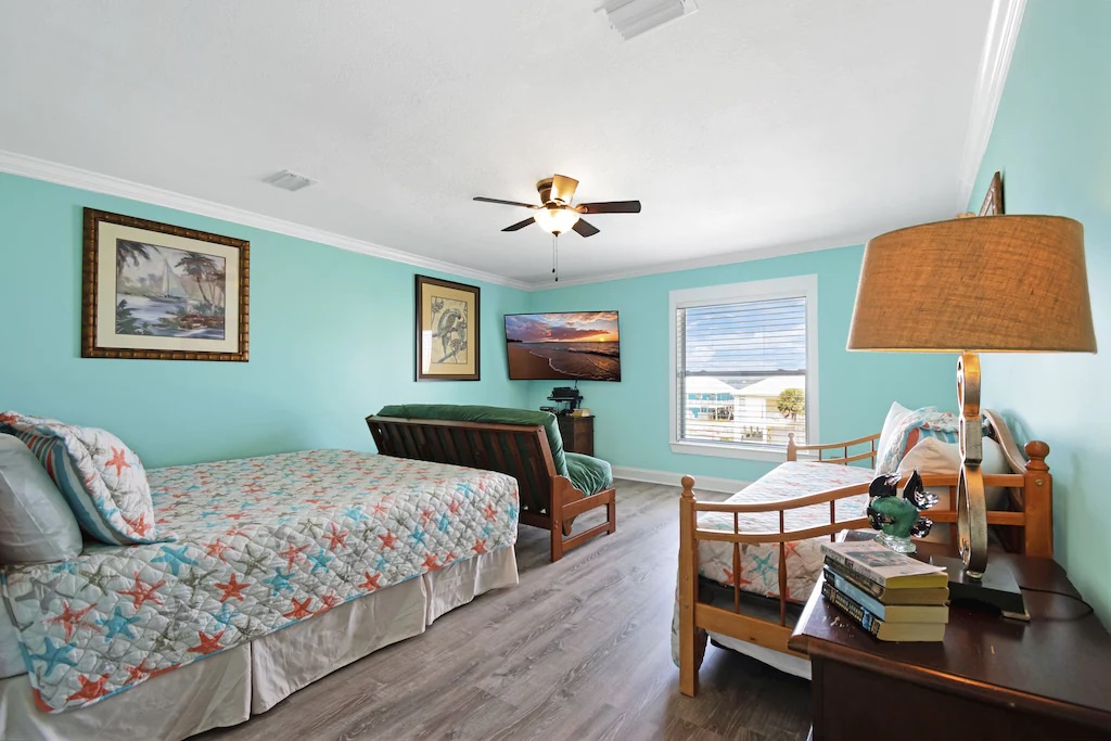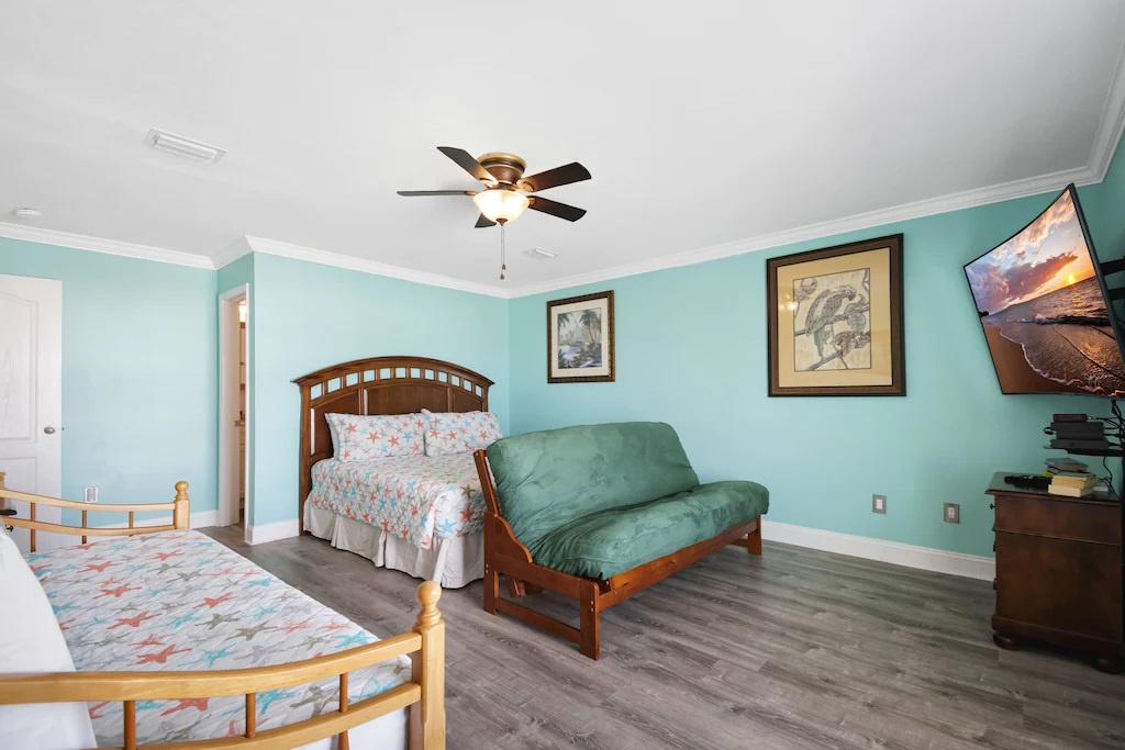 The third bedroom is another huge room with a king bed, a twin trundle bed making 2 twins and a futon, sleeping 6 comfortably. It also has an en suite bath with tiled walk-in shower.