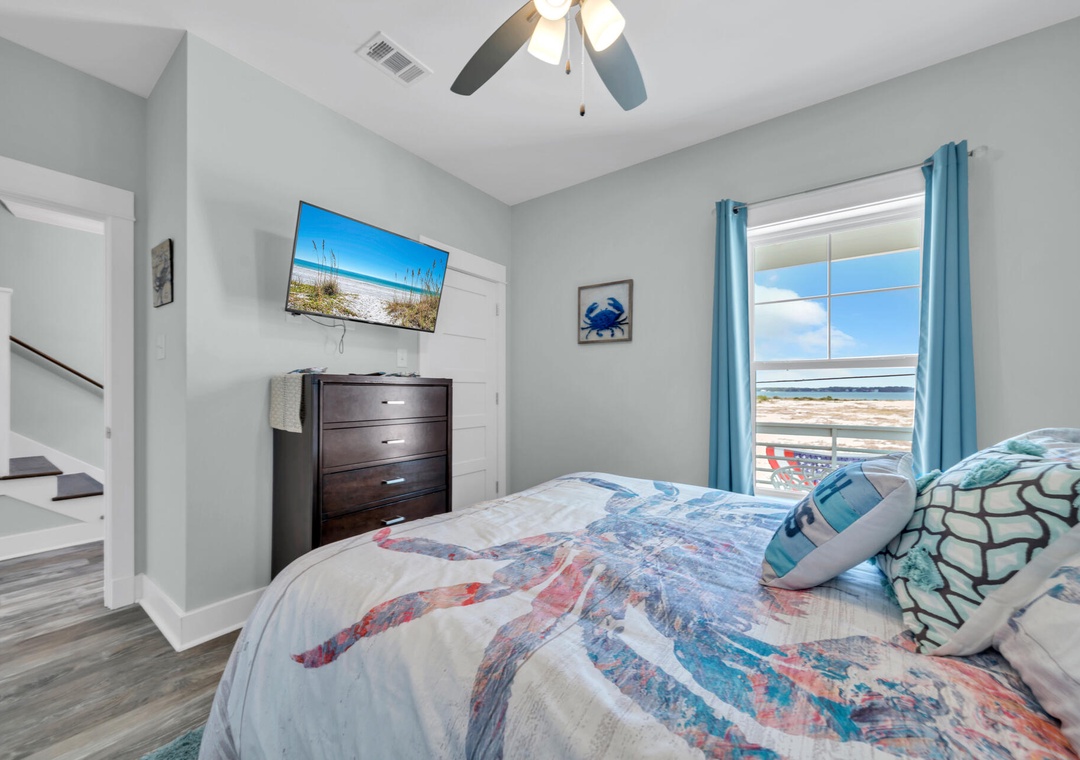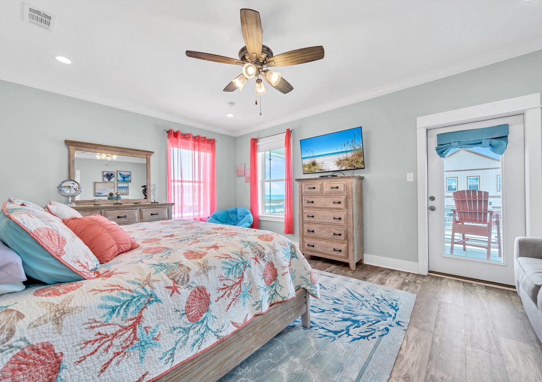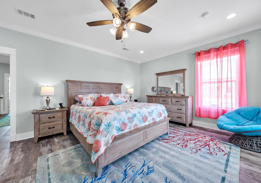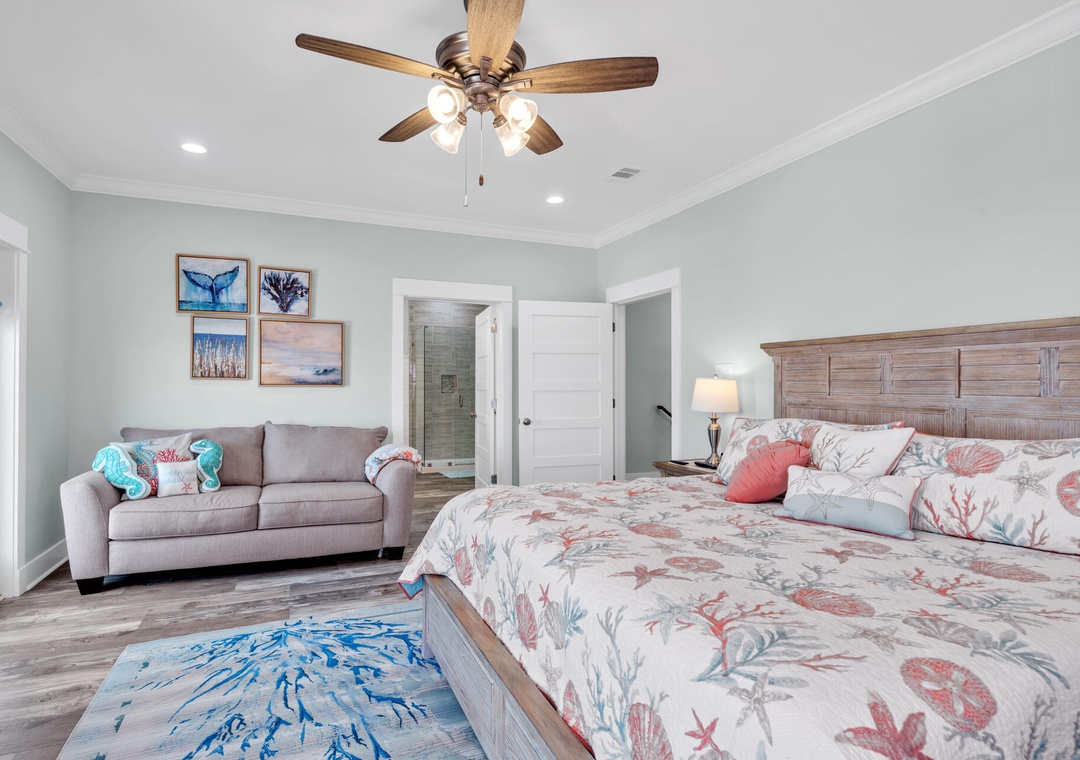 Ascend to the upper level to discover a luxuirious primary king-sized bedroom. Here, indulgence awaits with an en suite bath boasting dual sinks, a luxurious soaker tub, and a tiled walk-in shower. There is a sleeper sofa here that will sleep 2 comfortably.
