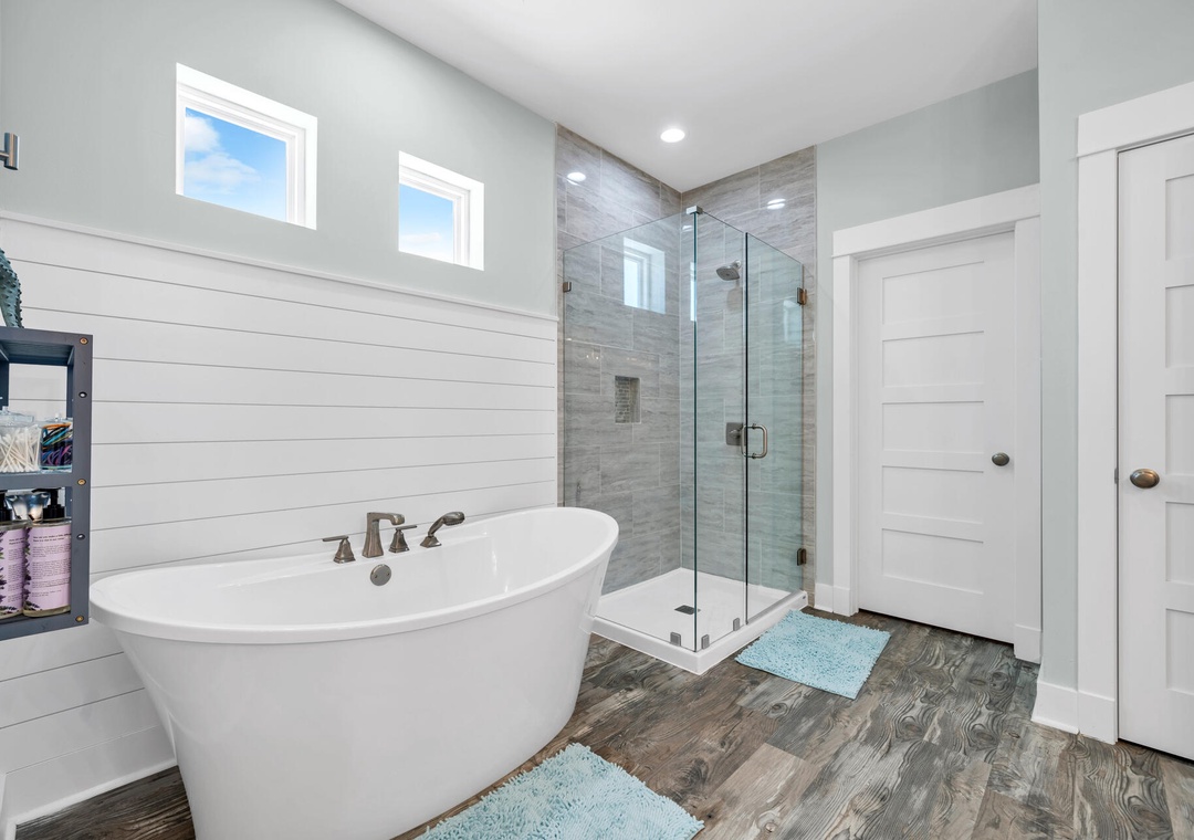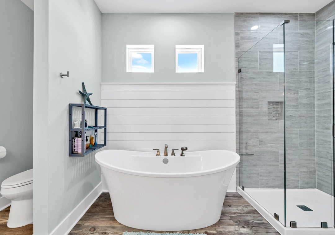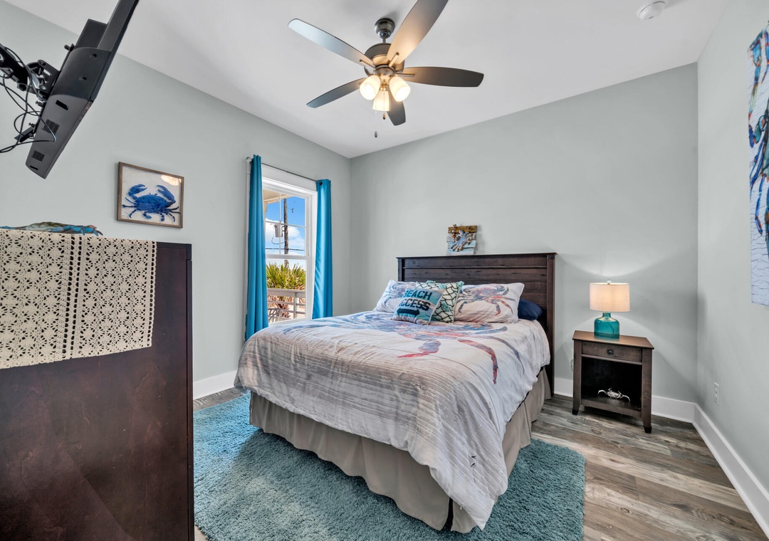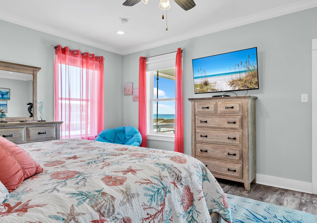 Ascend to the upper level to discover a luxuirious primary king-sized bedroom. Here, indulgence awaits with an en suite bath boasting dual sinks, a luxurious soaker tub, and a tiled walk-in shower. There is a sleeper sofa here that will sleep 2 comfortably.