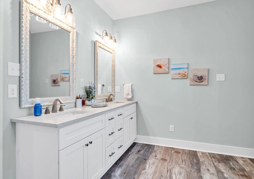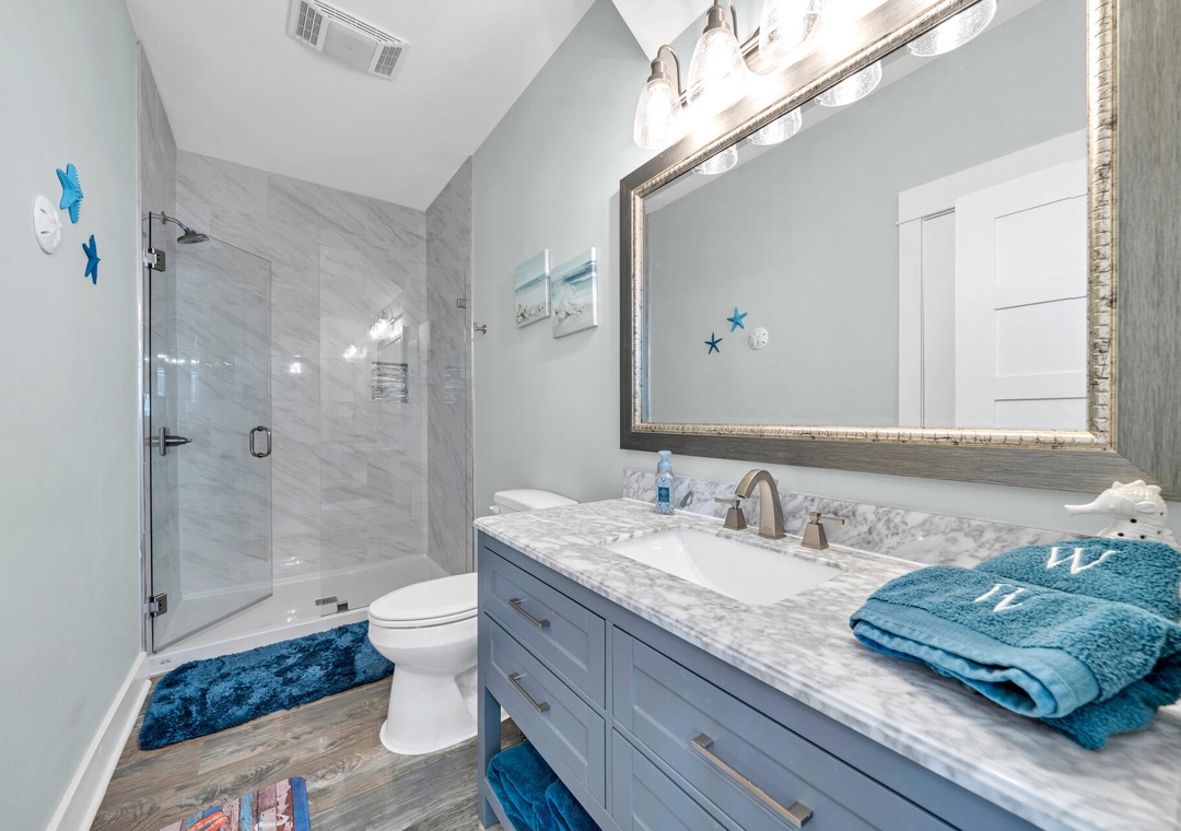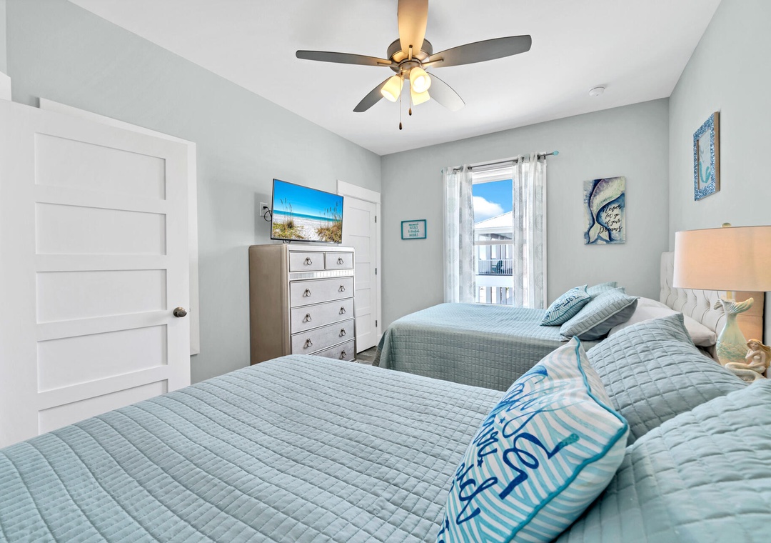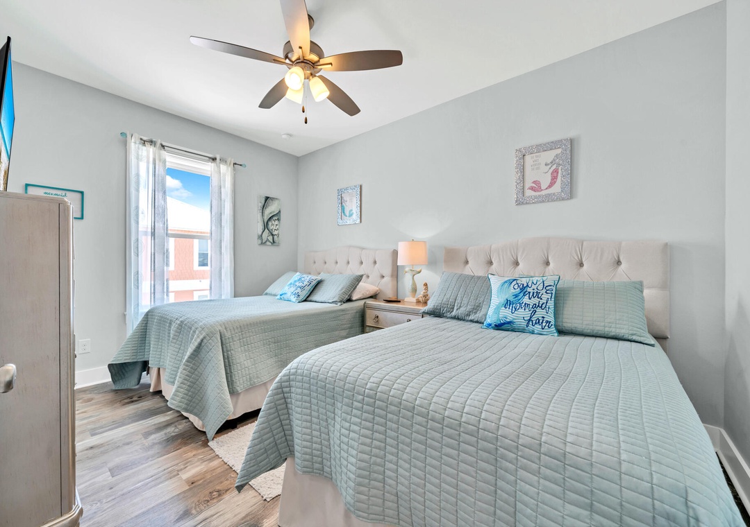 Down the hall is a queen bedroom and the fourth with 2 full-sized beds. These bedrooms share the third bath with tub/shower amenities.