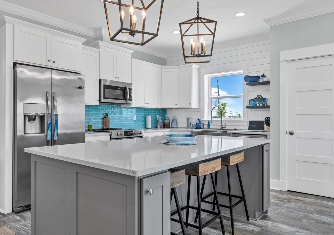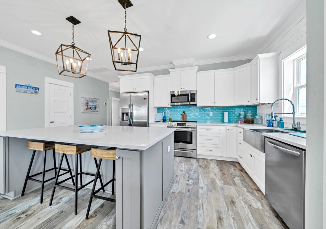 The kitchen is a chef's dream, outfitted with top-of-the-line appliances and abundant counter space for culinary creations. Dining table and breakfast bar seating allows everyone to eat together.