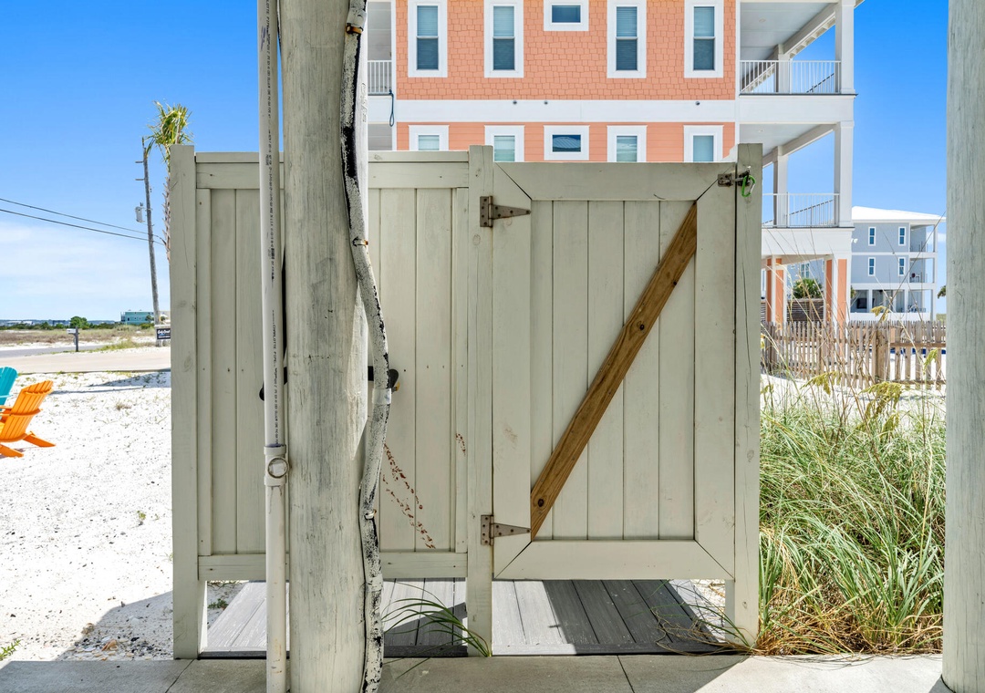 There is a convenient outdoor shower for rinsing off after a beach day, and parking is ample, accommodating up to 4 vehicles with ease.